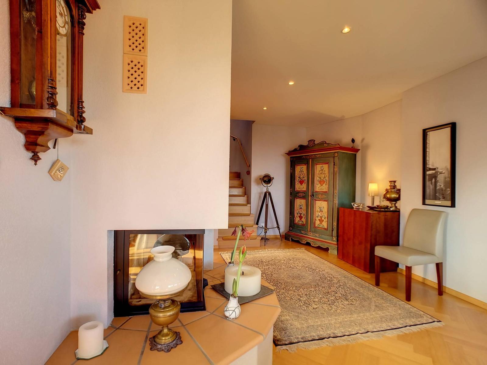 En outre, une cheminée et un joli parquet en chevrons (en bois de hêtre) confèrent au vaste séjour une ambiance chaleureuse et harmonieuse.