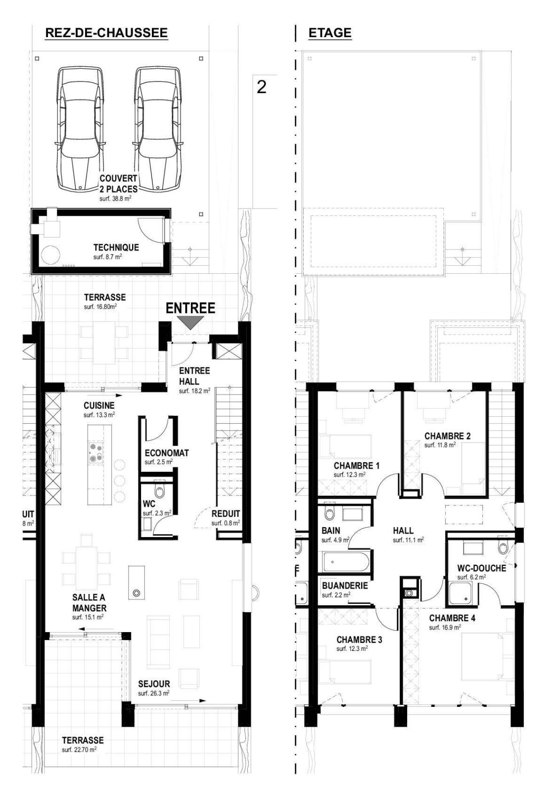 Les grandes et lumineuses pièces vous séduiront, l'ambiance chaleureuse et cosy du futur quartier de villas vous fera vous sentir chez vous, les deux belles terrasses vous feront profiter d'un ensoleillement optimal selon vos envies, et enfin, un couvert à voiture de 2 places complète chacune des villas.