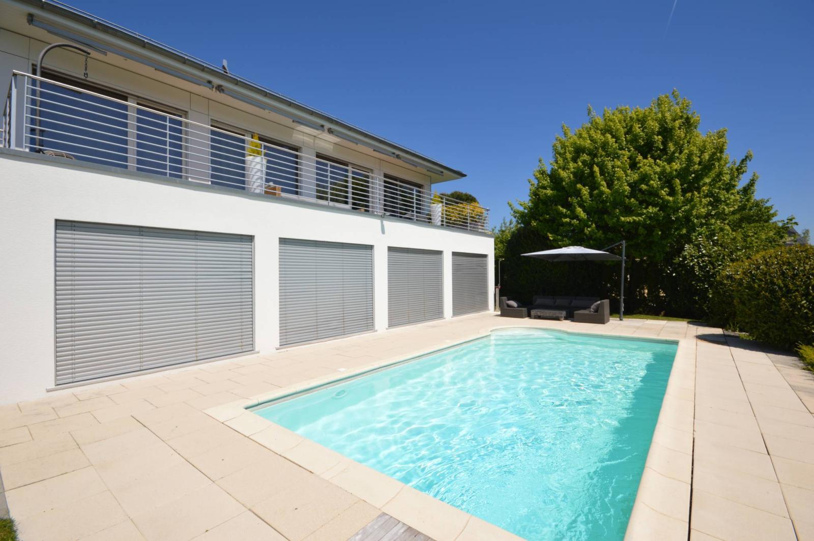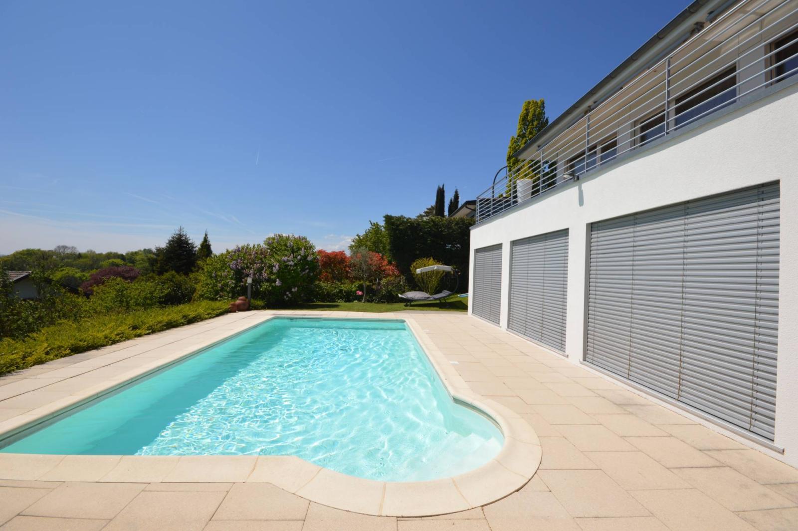 Le jardin comprend également une grande terrasse dallée avec sa piscine qui vous permettront de contempler la vue époustouflante et vous feront apprécier les longues soirées d'été avec une tranquillité irréprochable !
