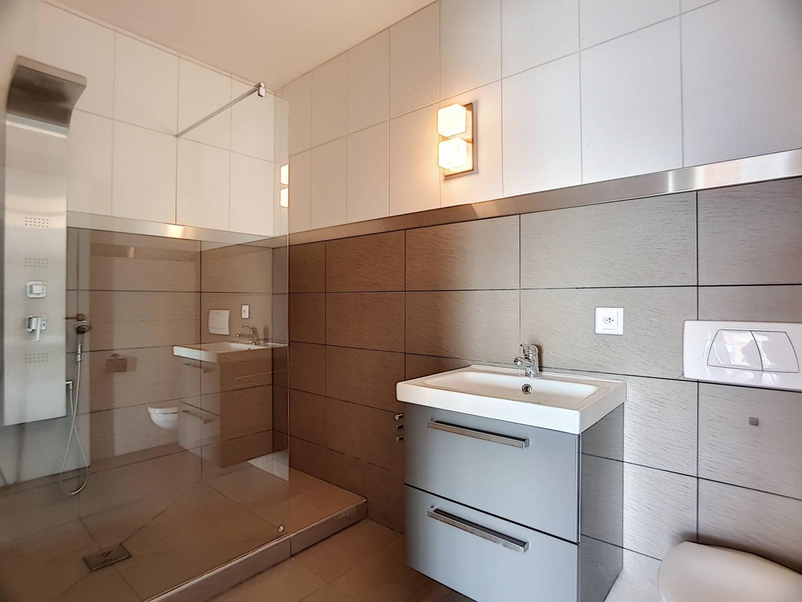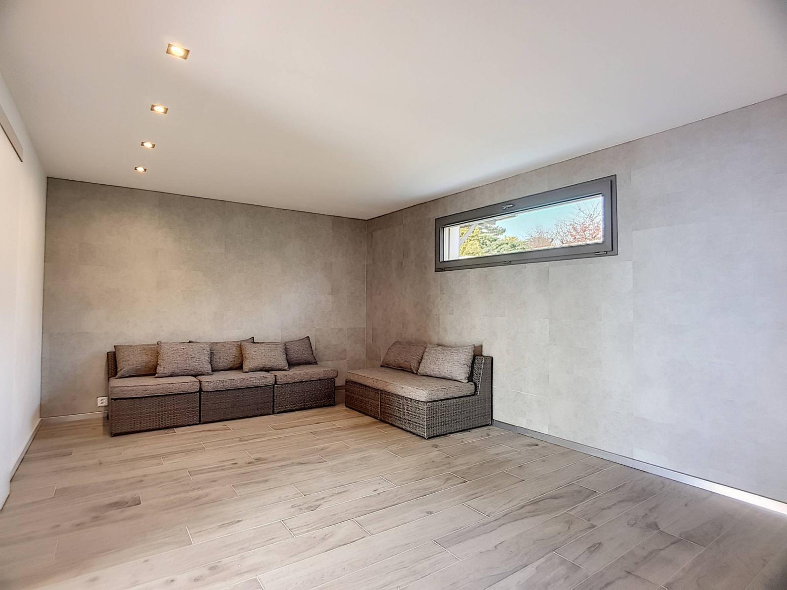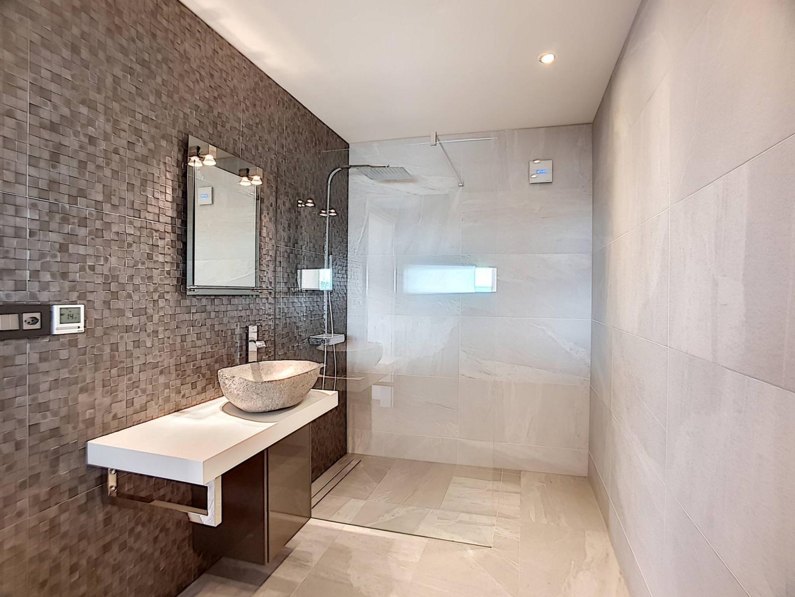 Au rez-de-chaussée inférieur, on trouve la partie nuit avec un hall de distribution et armoires murales, deux spacieuses chambres à coucher, une suite parentale avec sa salle de bains attenante et baignoire à l'italienne, dressing, un bureau, une salle de douches, ainsi qu'une cave.