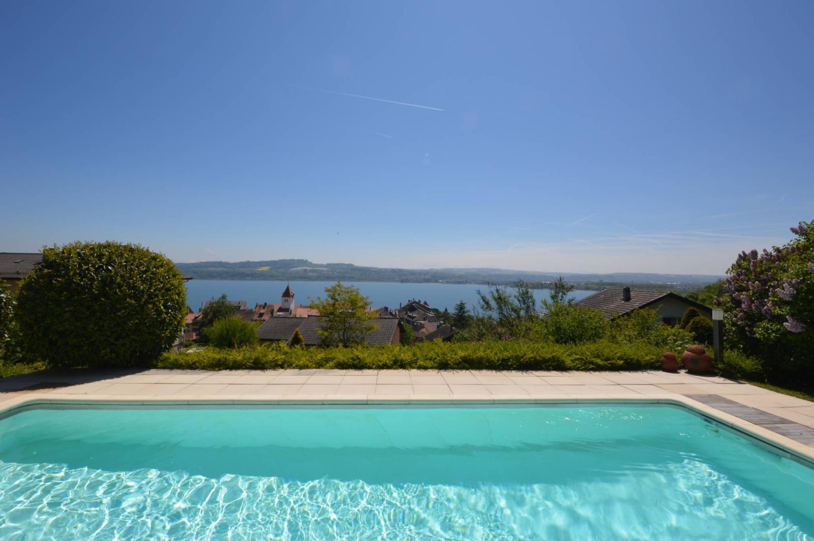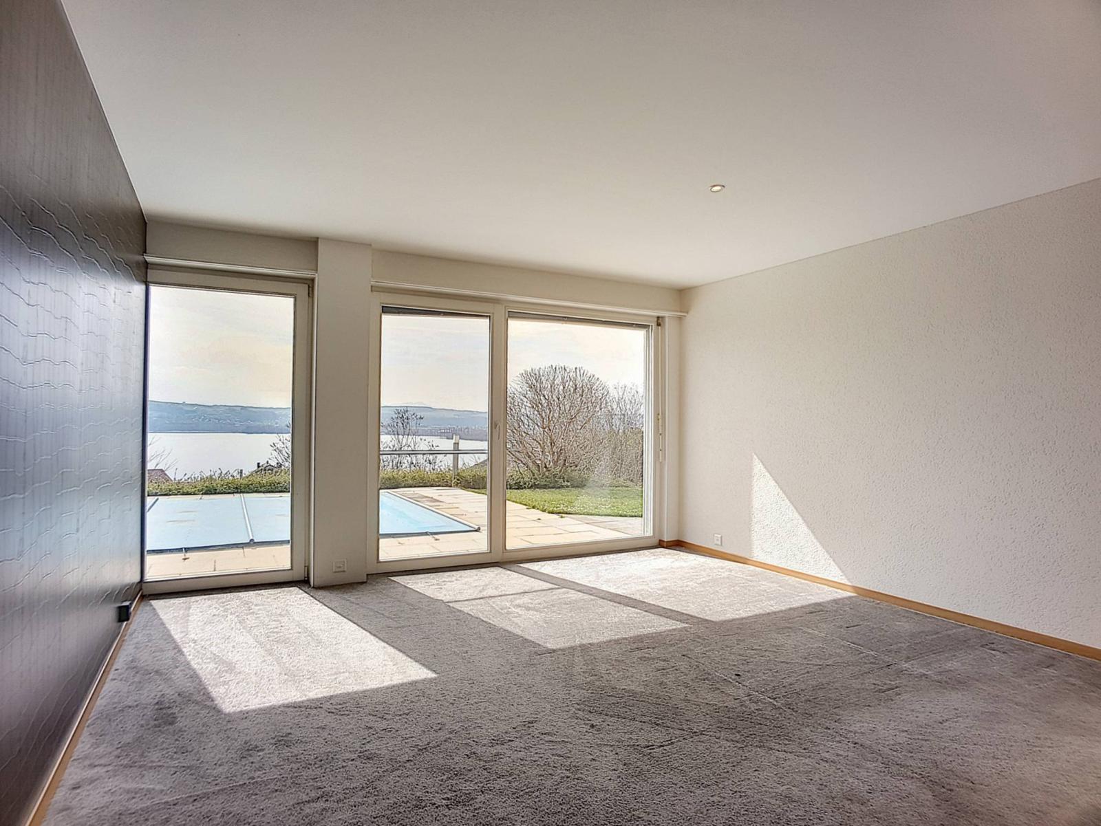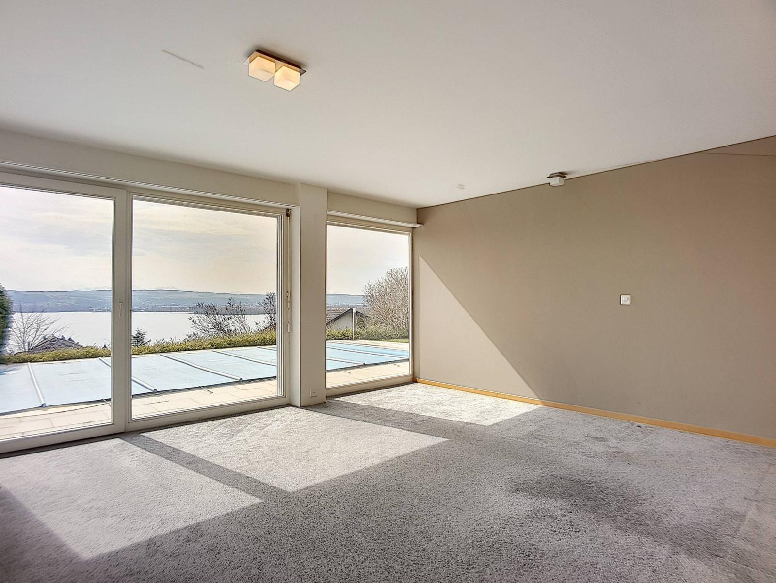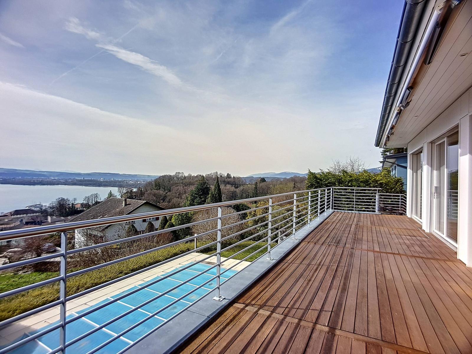 Splendide propriété contemporaine de standing, implantée sur une parcelle calme de près de 1'600 m², jouissant d'une vue plongeante sur le lac de Neuchâtel et les Alpes.