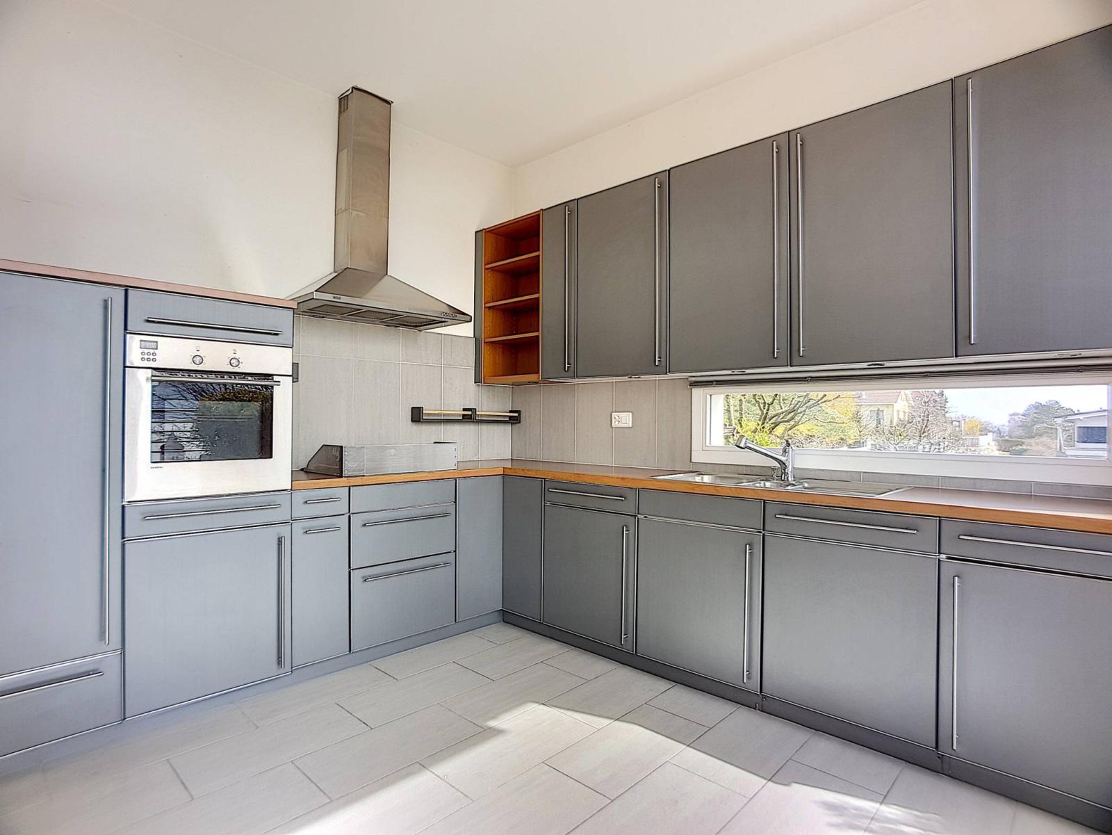 Le rez-de-chaussée supérieur offre un hall d'entrée, un WC séparé, un généreux et lumineux espace de vie avec sortie sur une grande terrasse et escalier donnant sur le jardin, une superbe cuisine américaine équipée, ainsi qu'une salle de douches/WC.