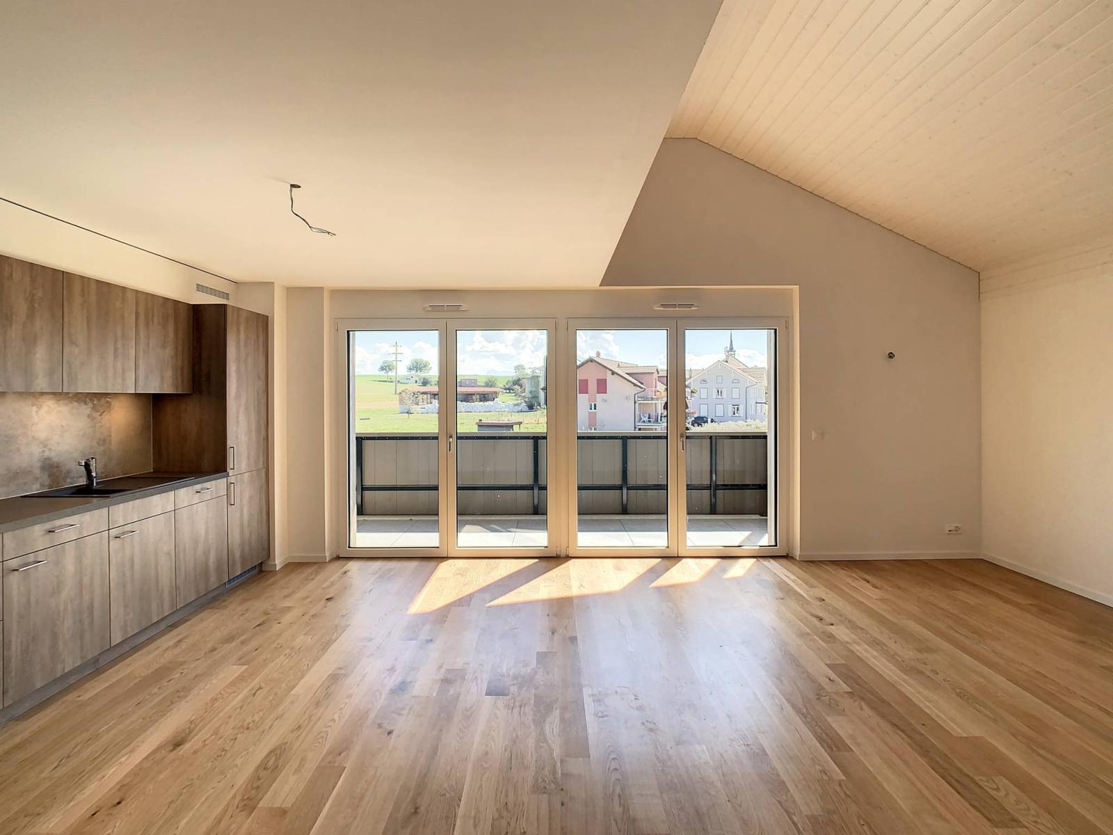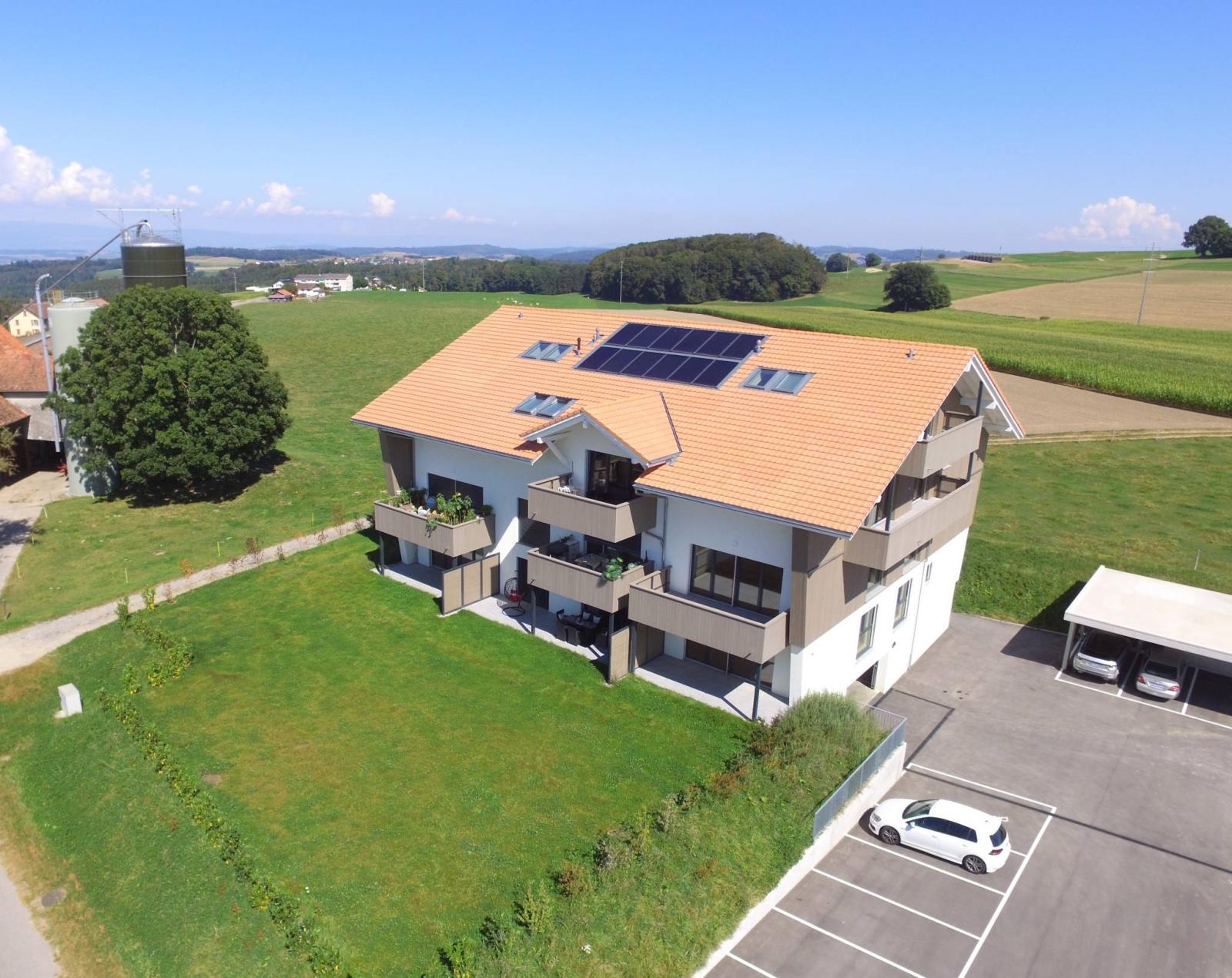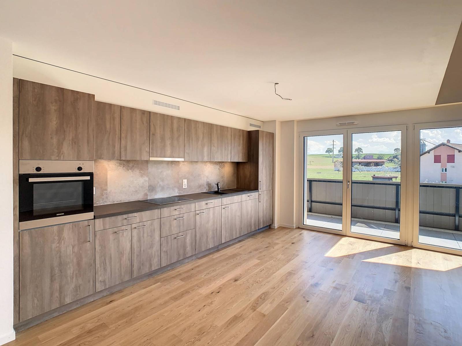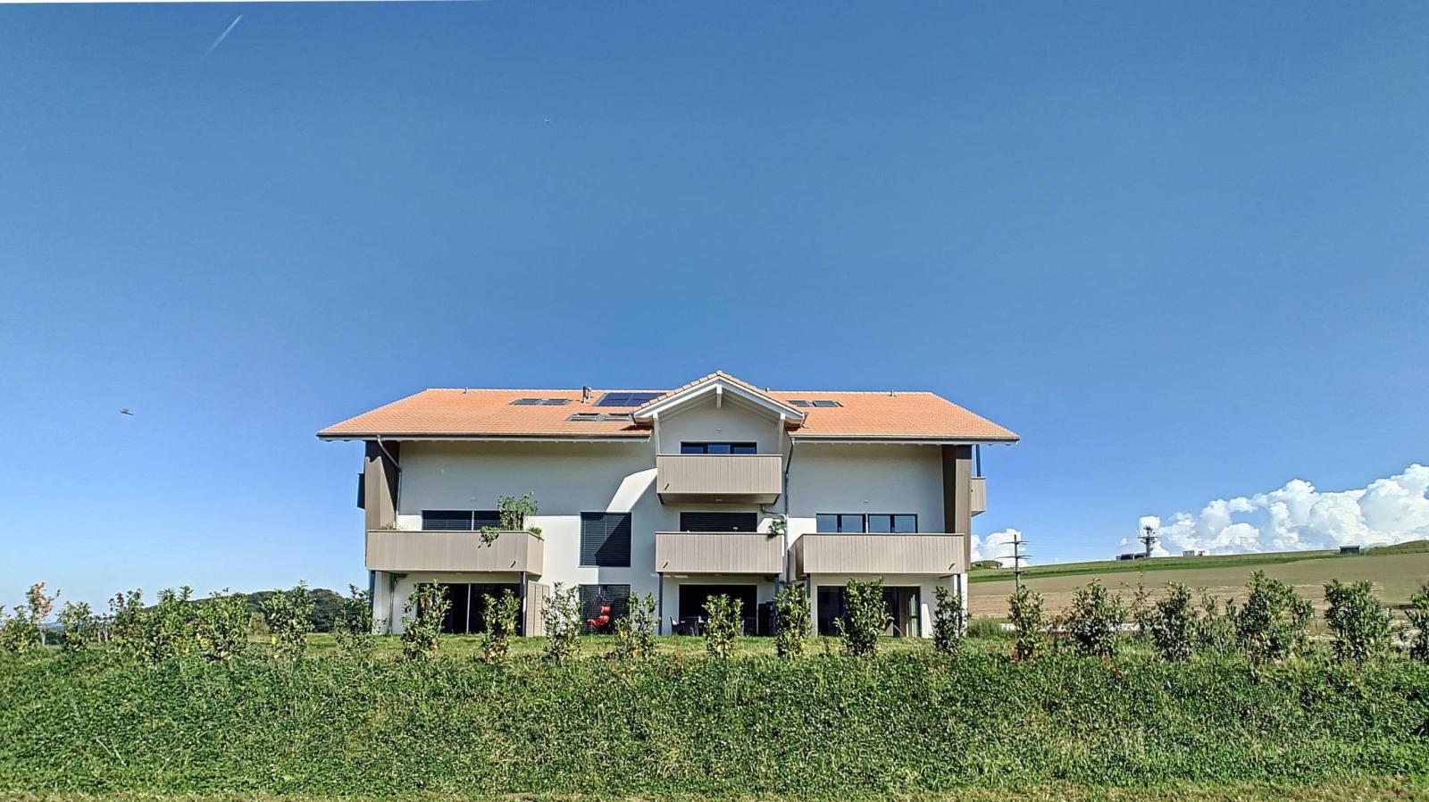 Idéalement située entre Fribourg et Payerne, cet appartement neuf de 3.5 pièces dispose d'une surface habitable de 103 m² et d'un balcon de 14 m² totalisant ainsi une surface pondérée d'environ 110 m². Il propose un cadre de vie idyllique alliant la proximité des 2 villes tout en bénéficiant d’un environnement verdoyant, en bordure de zone agricole.