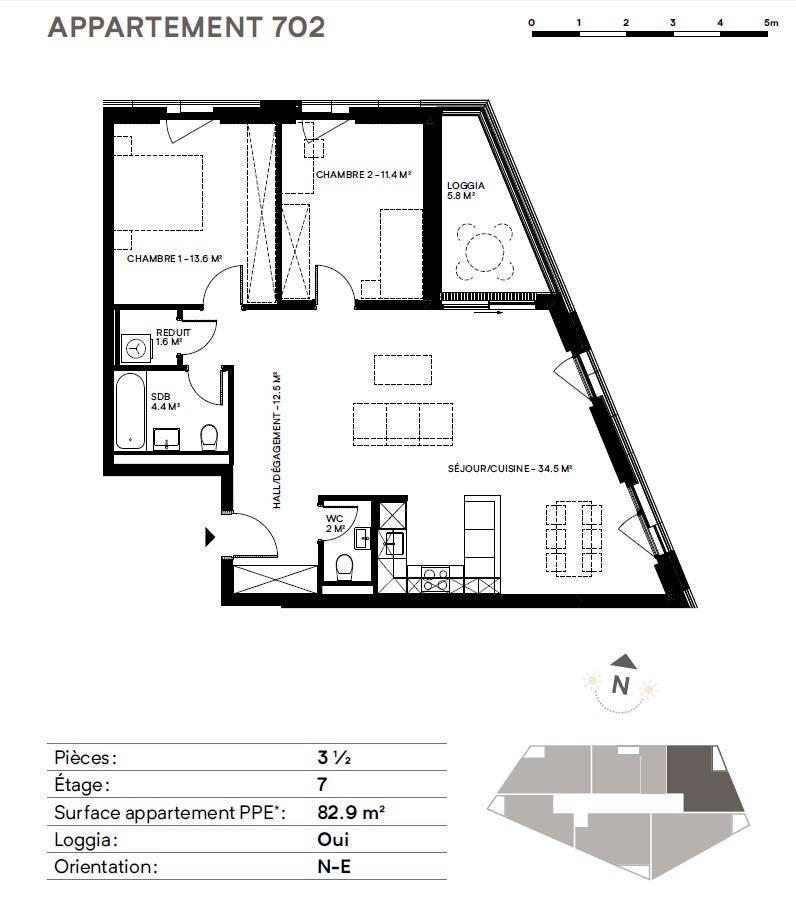 L'appartement proposé, orienté Nord-Est au 7ème étage, est disposé comme suit :