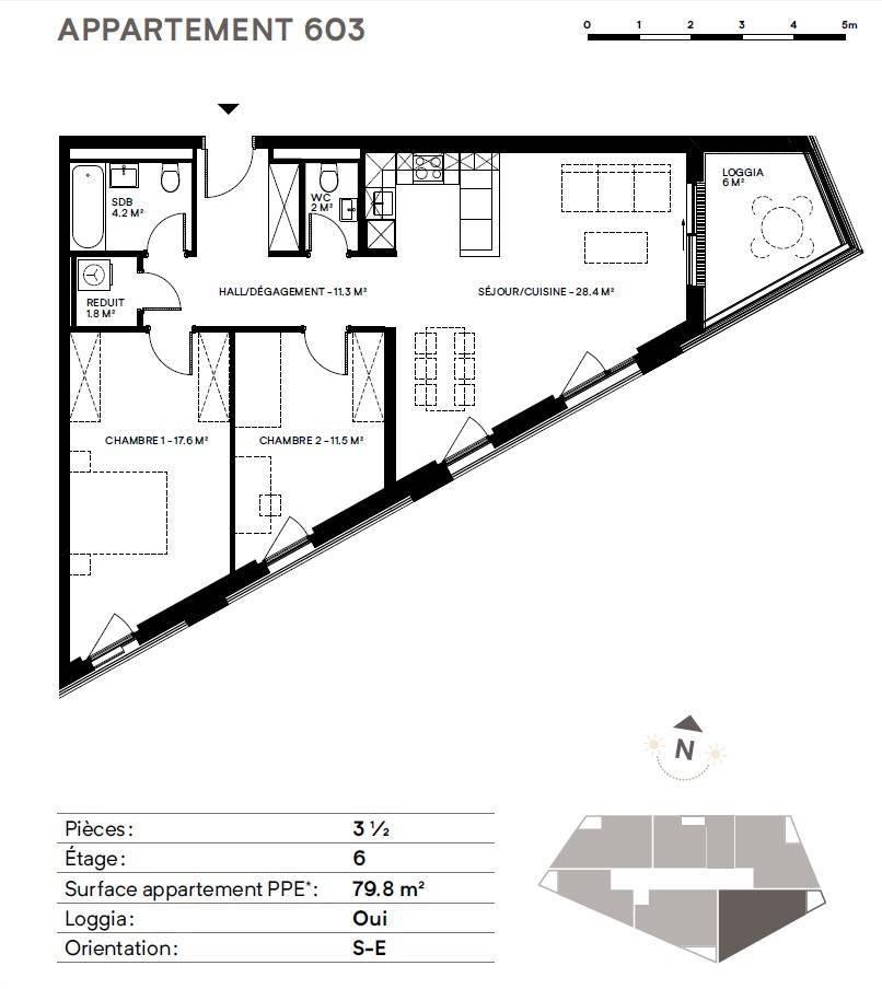 L'appartement proposé, orienté Sud-Est au 6ème étage, est disposé comme suit :