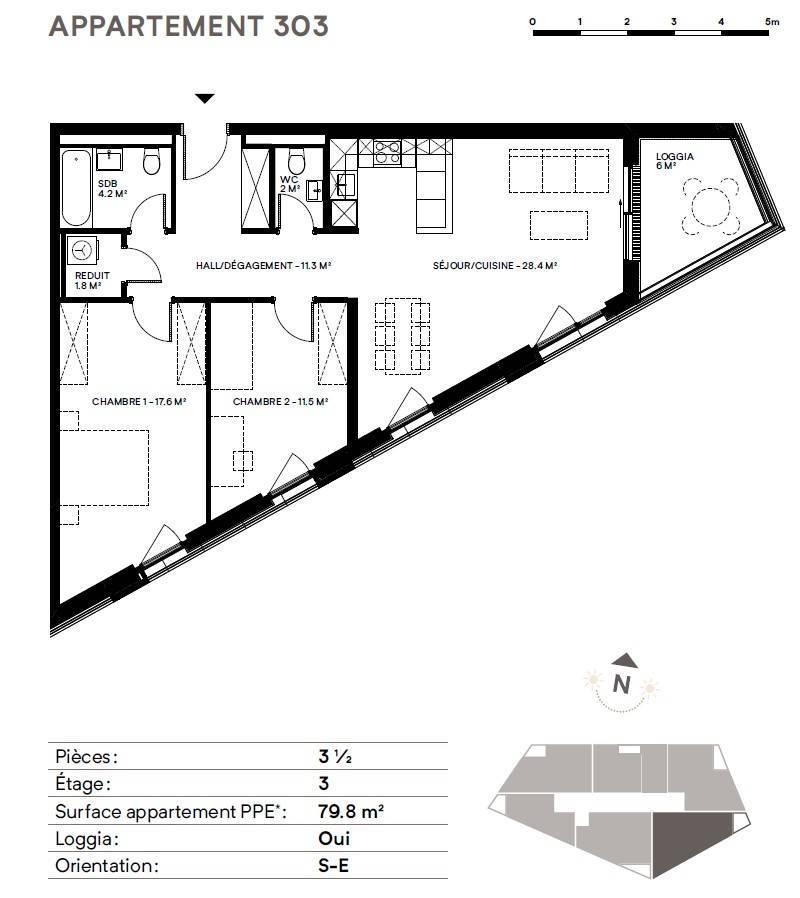 L'appartement proposé, orienté Sud-Est au 3ème étage, est disposé comme suit :