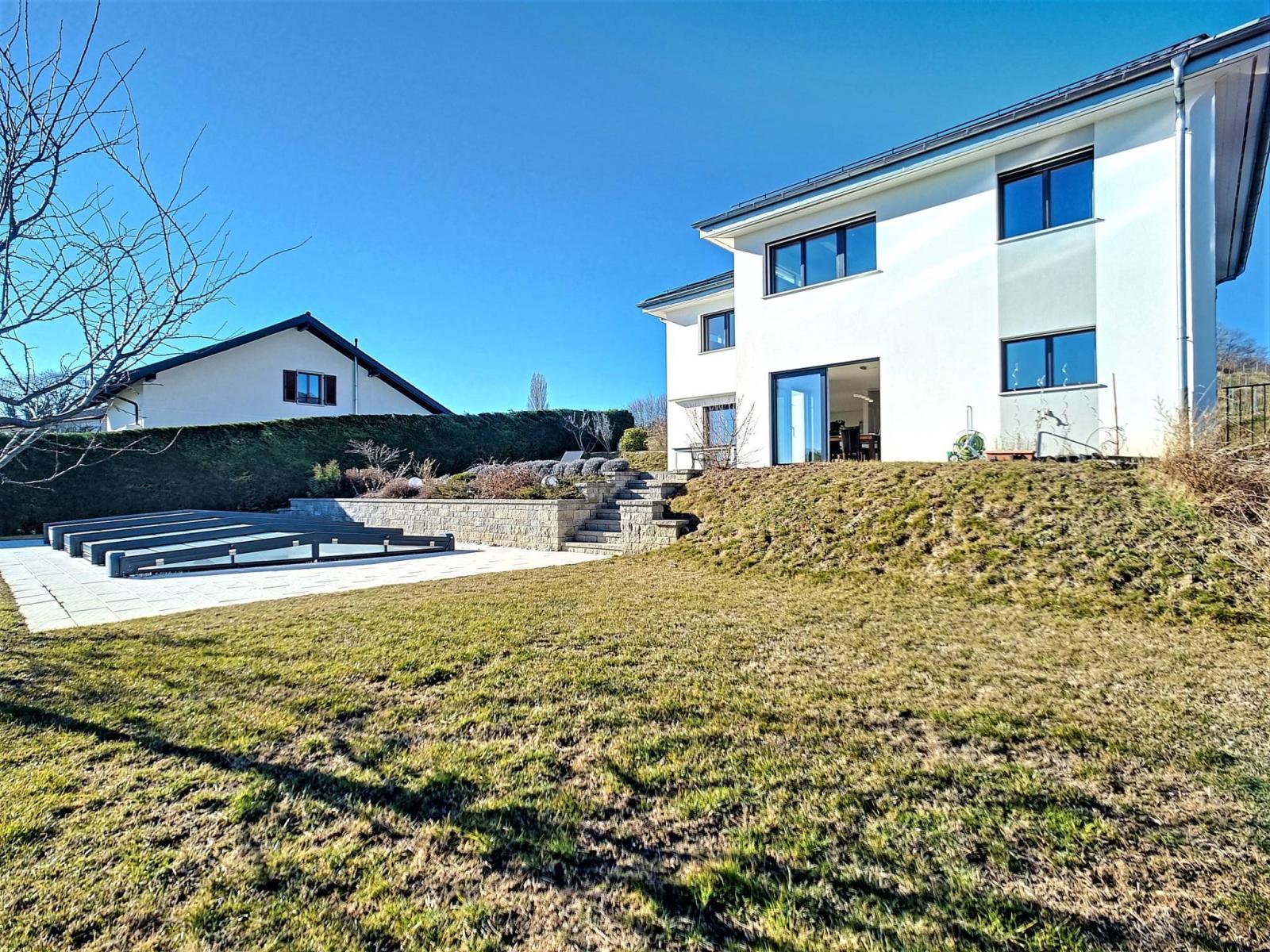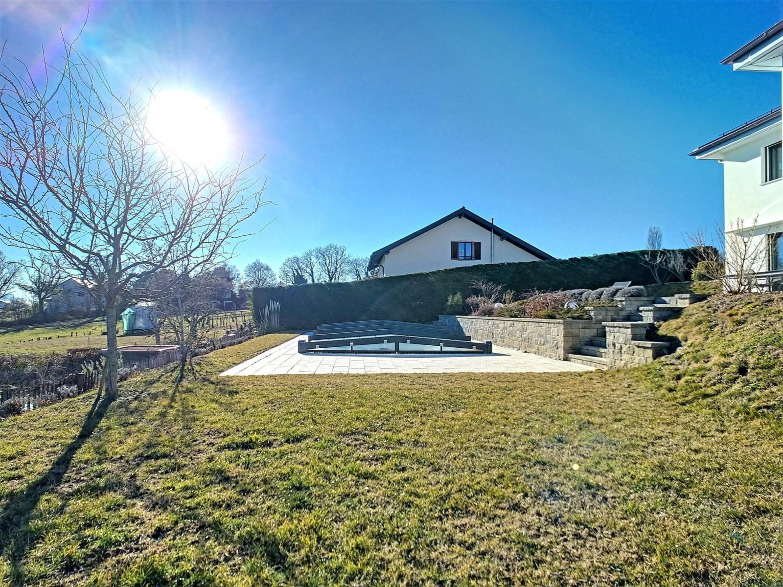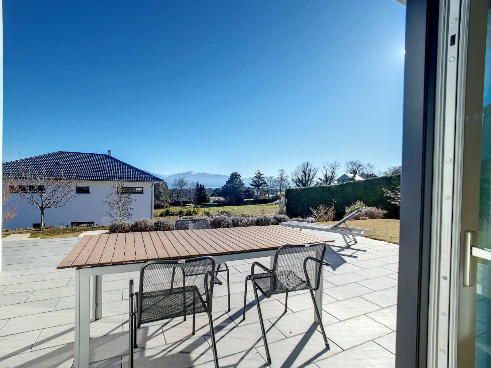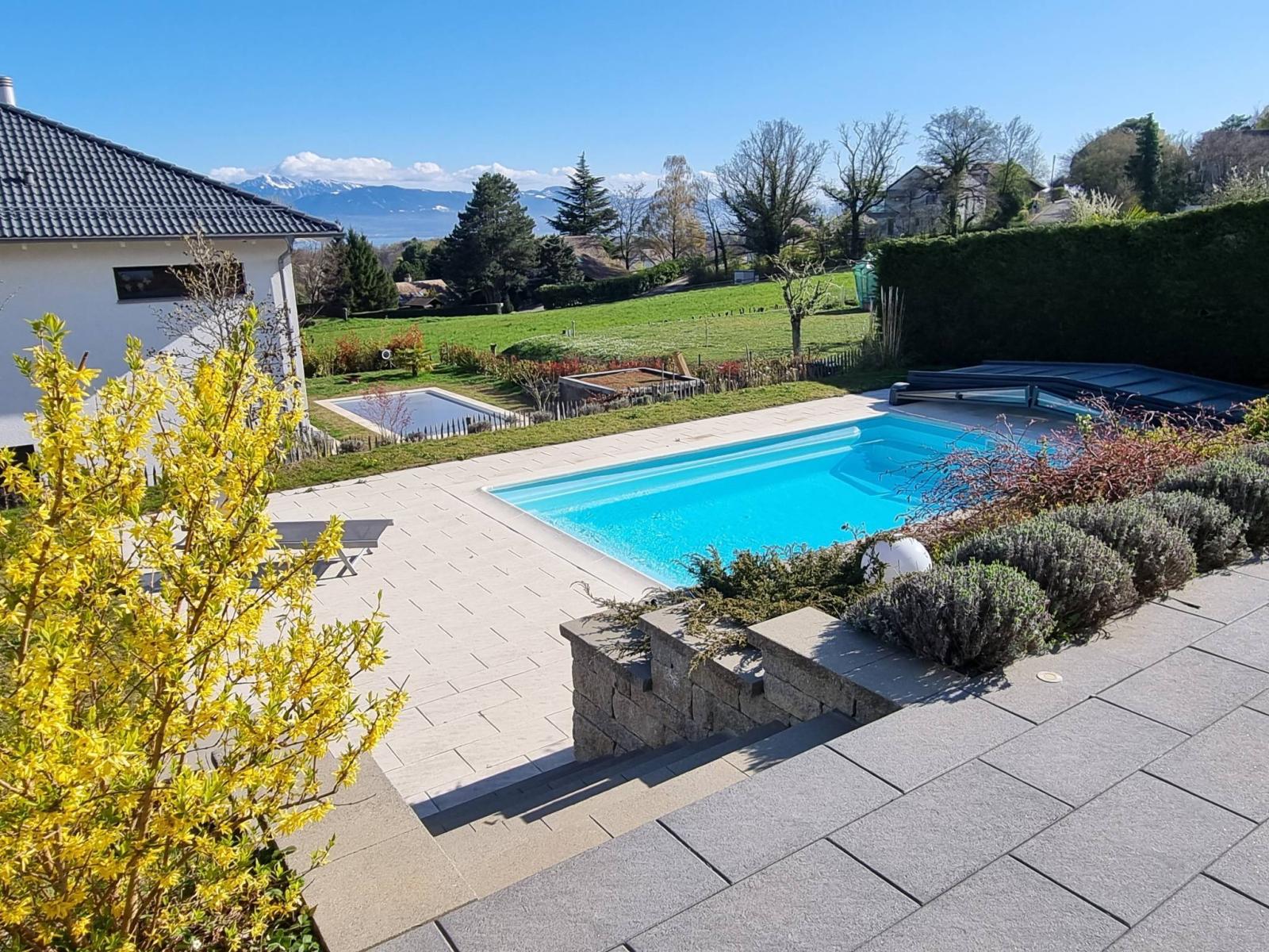 A l'extérieur, vous profiterez d'une terrasse et d'un jardin avec une jolie vue Alpes et lac, ainsi que des plaisirs d'une piscine creusée bien orientée Sud.