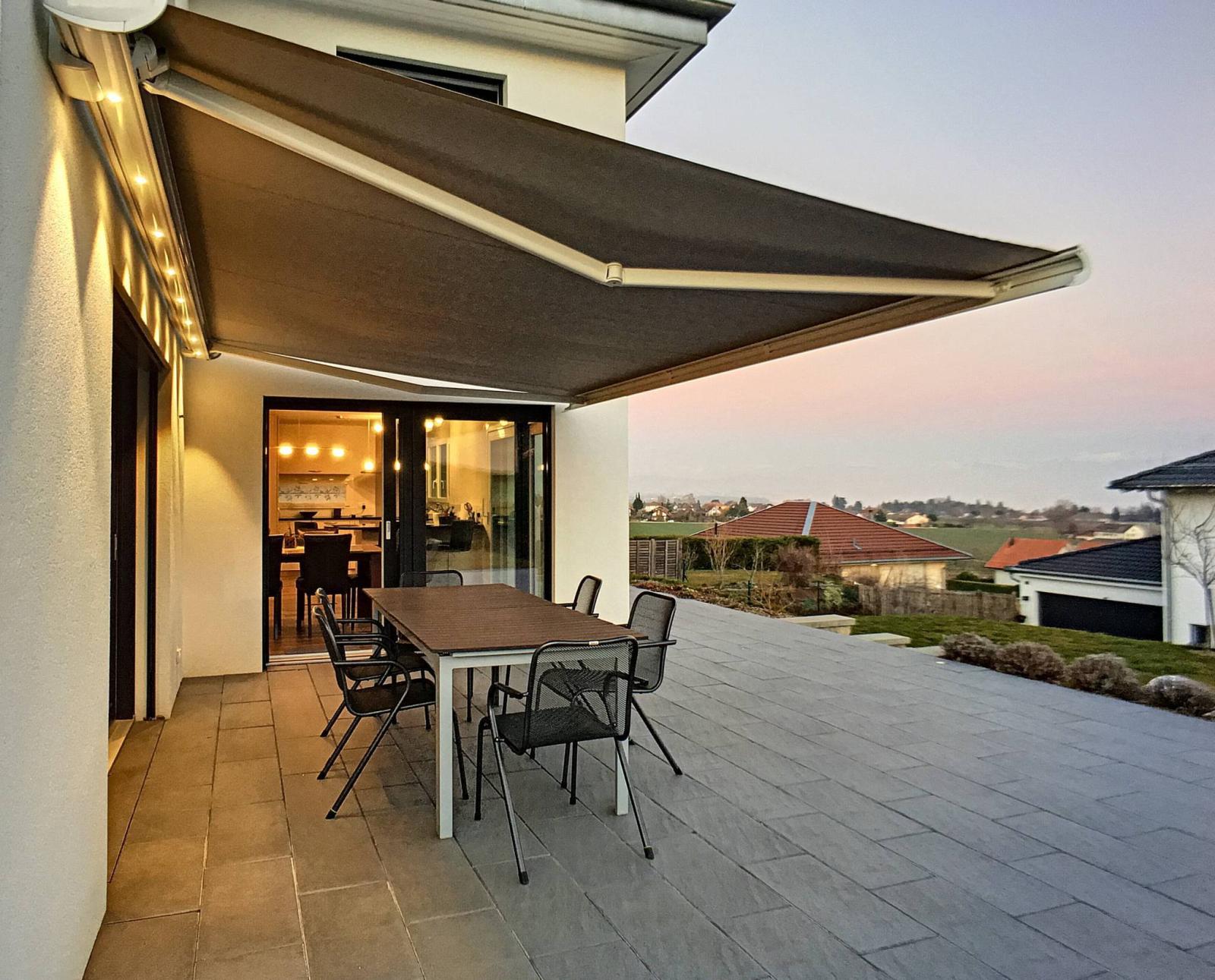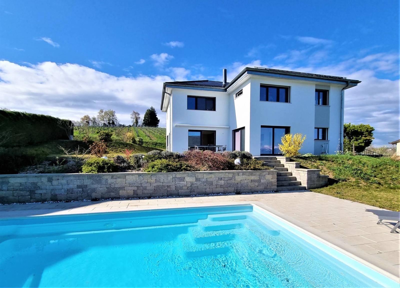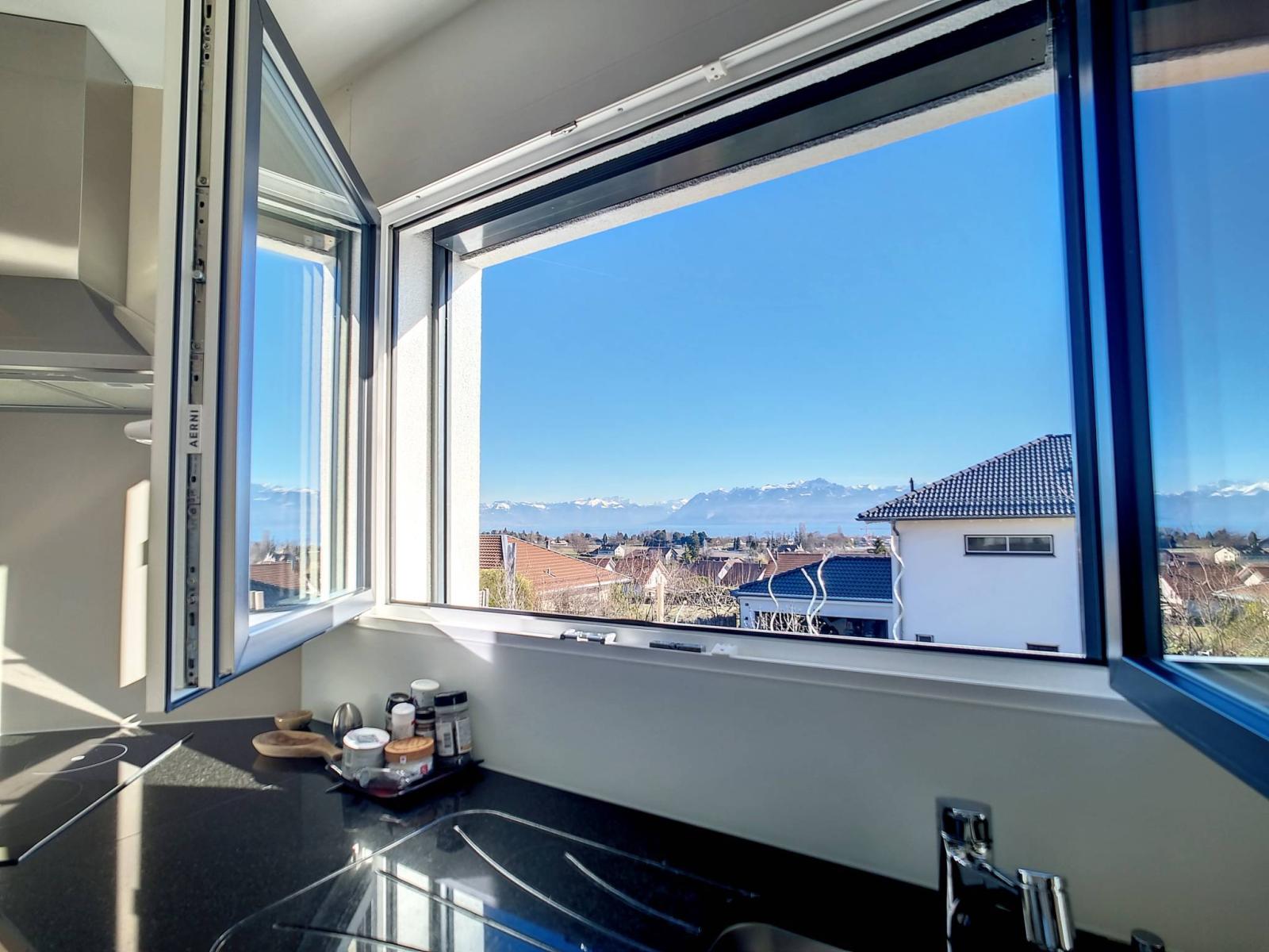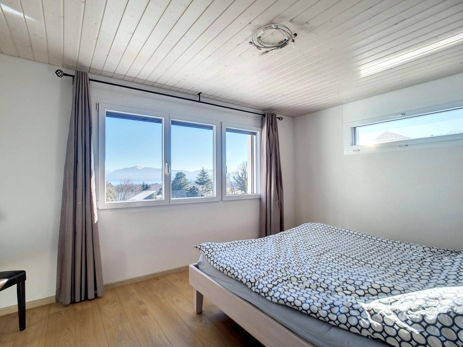 A l'extérieur, vous profiterez d'une terrasse et d'un jardin avec une jolie vue Alpes et lac, ainsi que des plaisirs d'une piscine creusée bien orientée Sud.