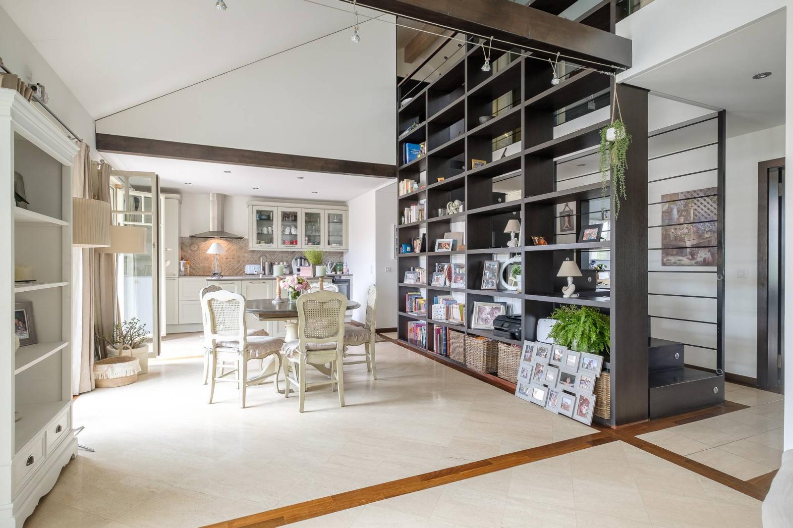 Il se compose d'un grand hall d'entrée, d'un salon avec poêle, d'une belle cuisine équipée et ouverte sur la salle à manger avec une belle hauteur sous plafonds.