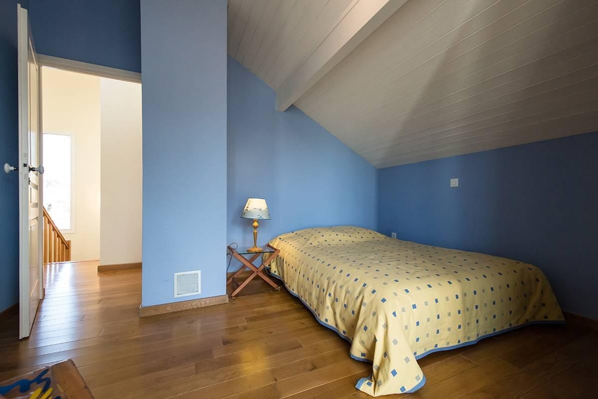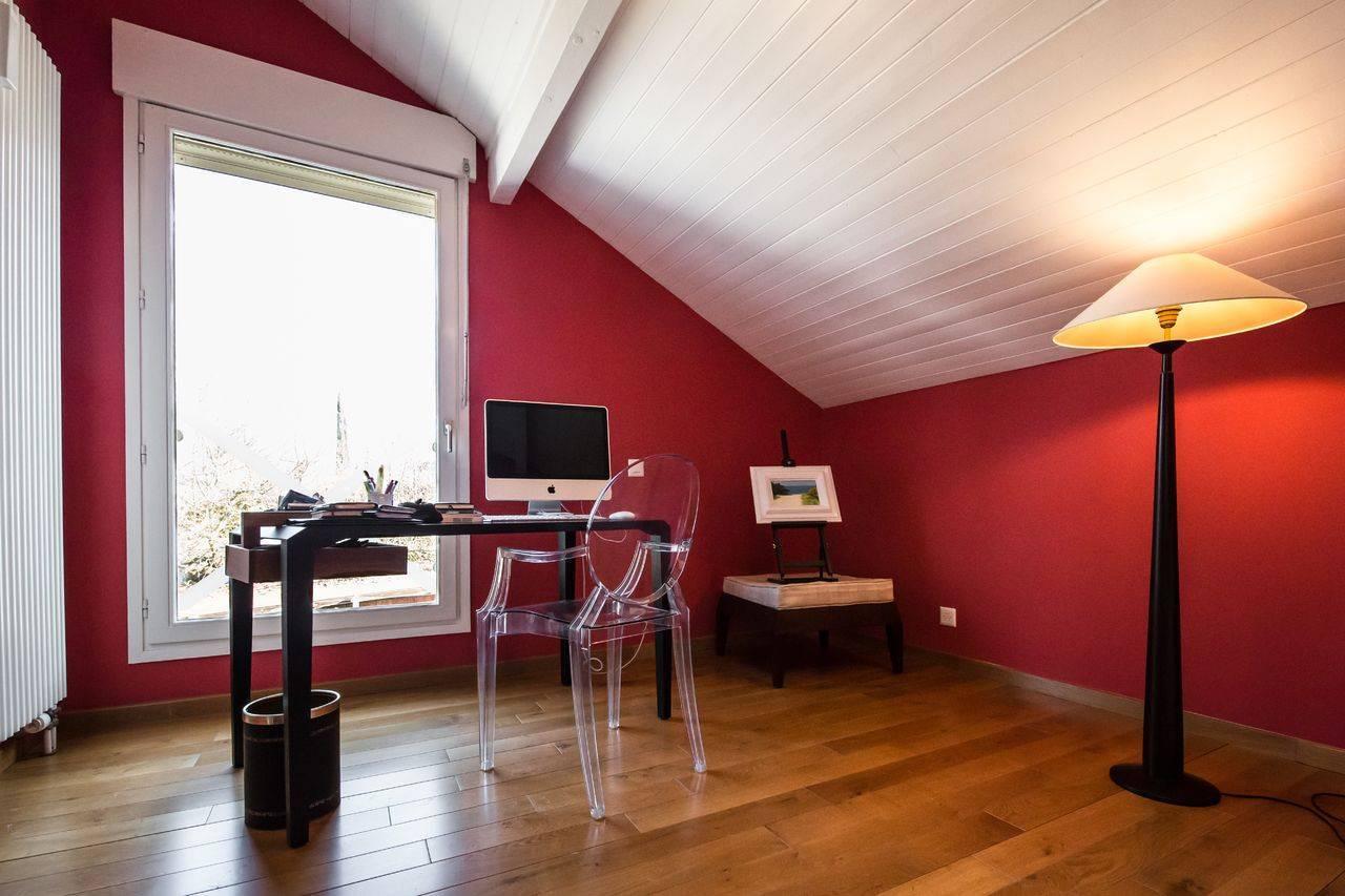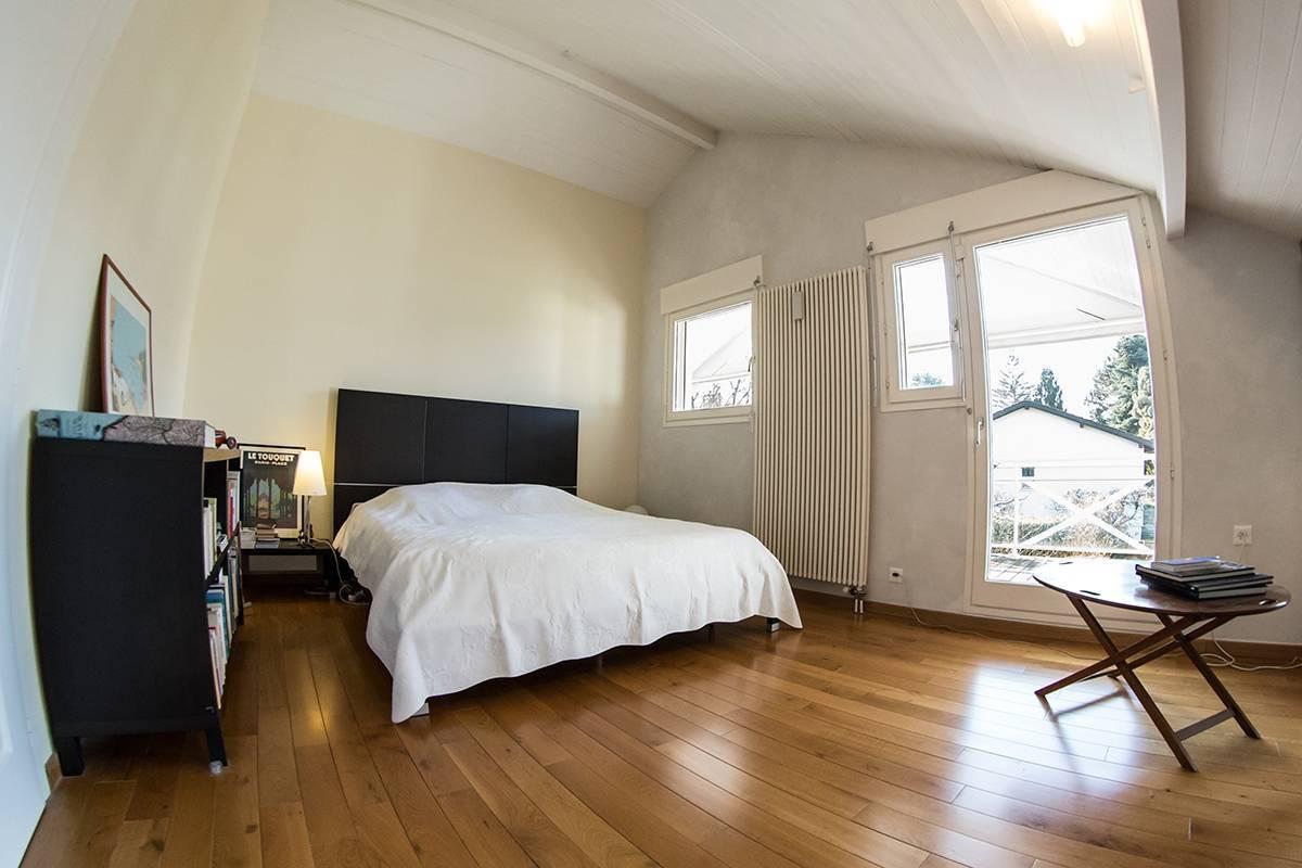 L' étage offre trois chambres à coucher, dont deux profitant d'un accès à une grande terrasse avec vue sur le Jura et, deux salles de bains avec wc.