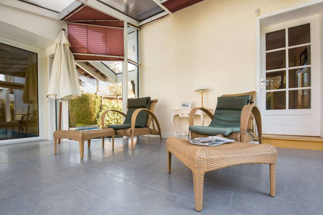 Le rez-de-chaussée se compose d'un hall d’entrée, de wc visiteurs avec espace lingerie, d'une belle cuisine entièrement équipée ainsi que d'un vaste salon - salle à manger avec accès à une ravissante terrasse couverte et au jardin. Une agréable véranda chauffée de 17 m² donnant sur une deuxième terrasse de 24 m² complètent ce niveau.