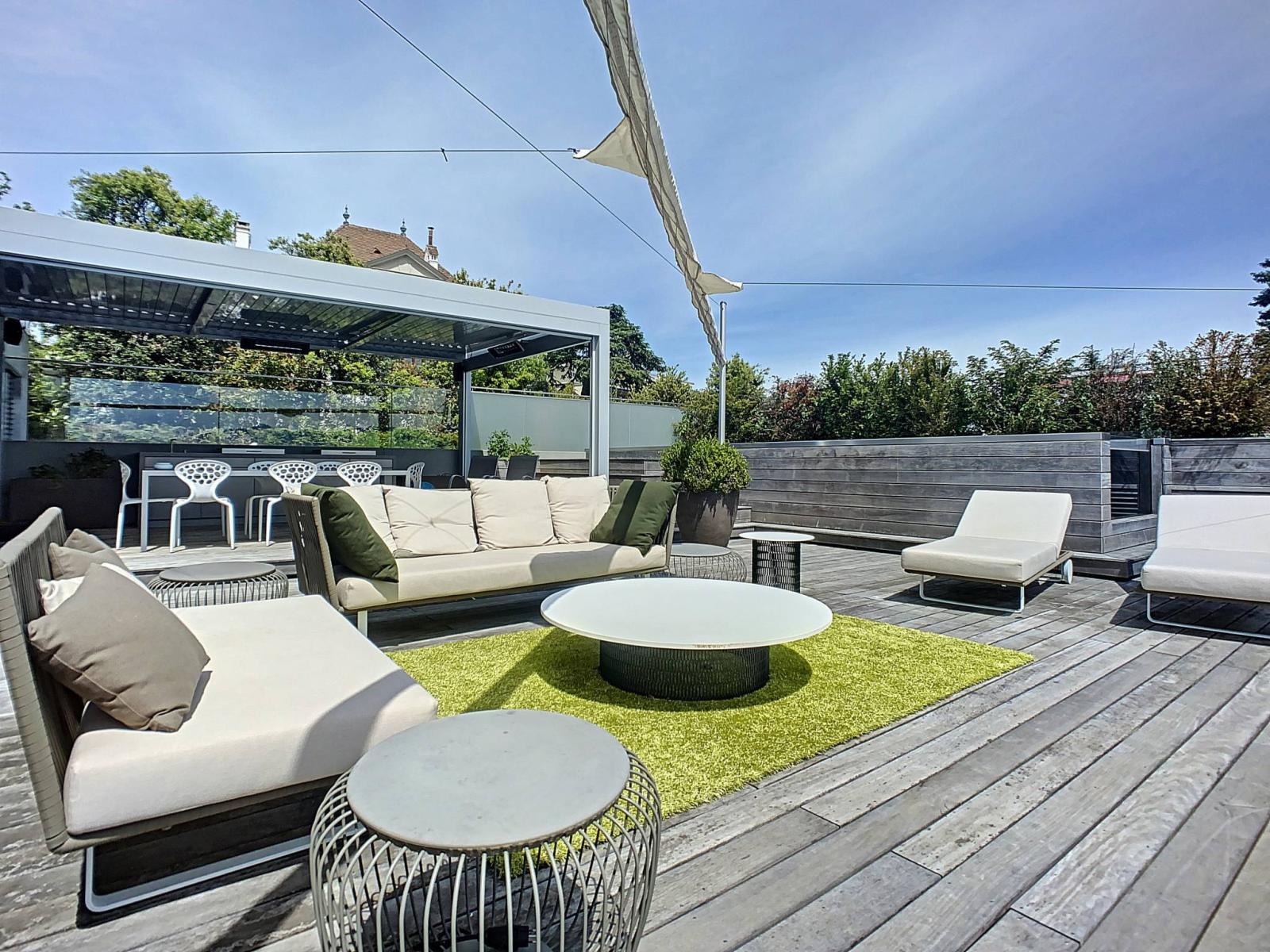 Situé à l’avant-dernier étage de l’immeuble, l’appartement se distingue par sa simplicité et son esthétique épurée. Aménagé avec goût et raffinement, il séduit aussi par ses généreux espaces extérieurs intimistes, composés d’une terrasse couverte munie d’une cuisine totalement équipée et d’une piscine privative avec nage à contre-courant.