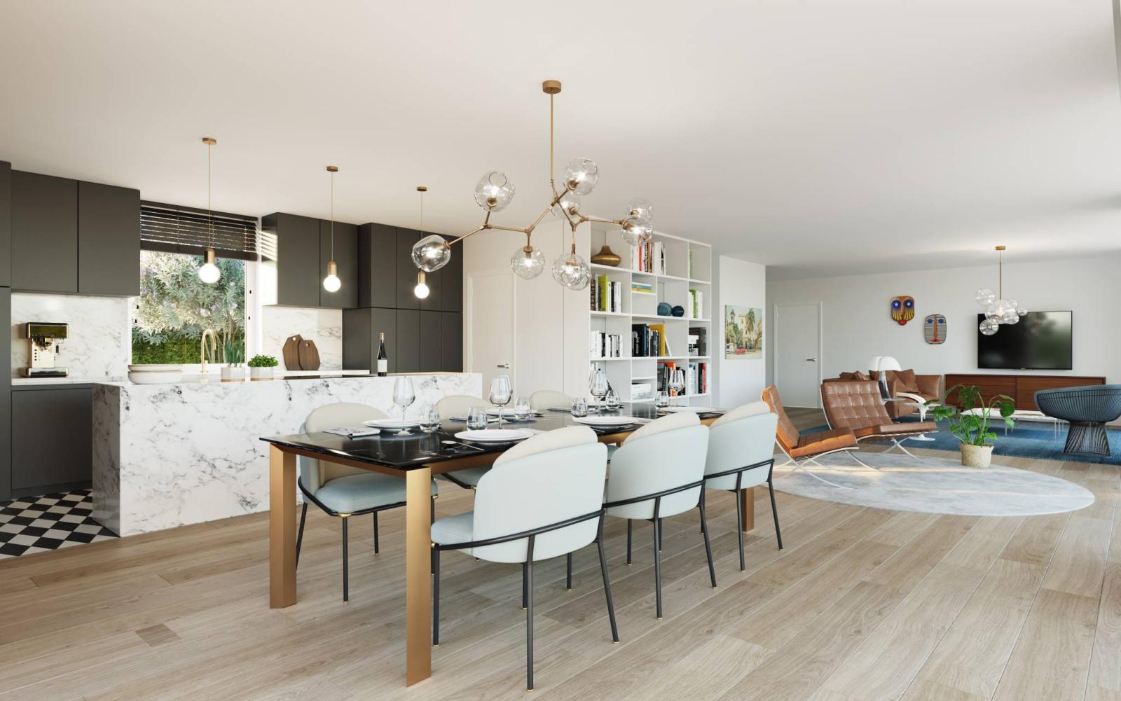 Le rez-de-chaussée propose un bel espace ouvert et très lumineux. Il est composé d’un séjour et d’une salle-à-manger en enfilade, d’une cuisine équipée et aménagée, et d’un hall d’entrée avec WC visiteurs.