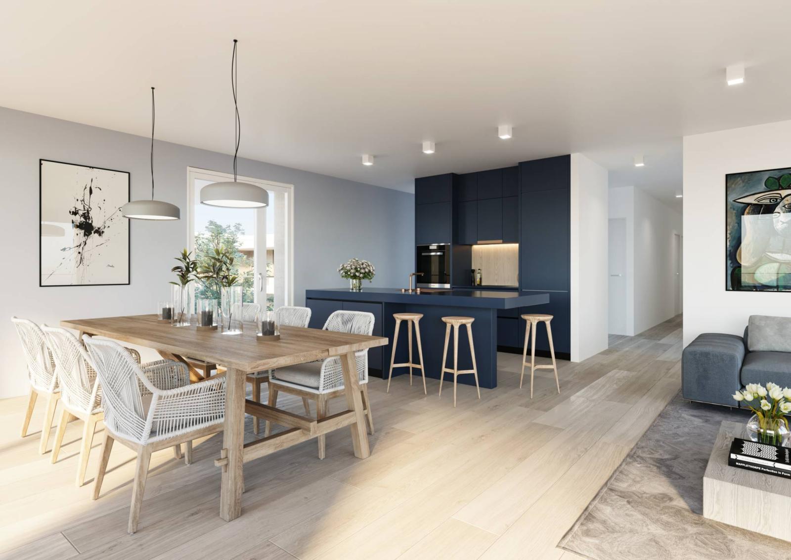 Belle cuisine ouverte sur un espace salle à manger