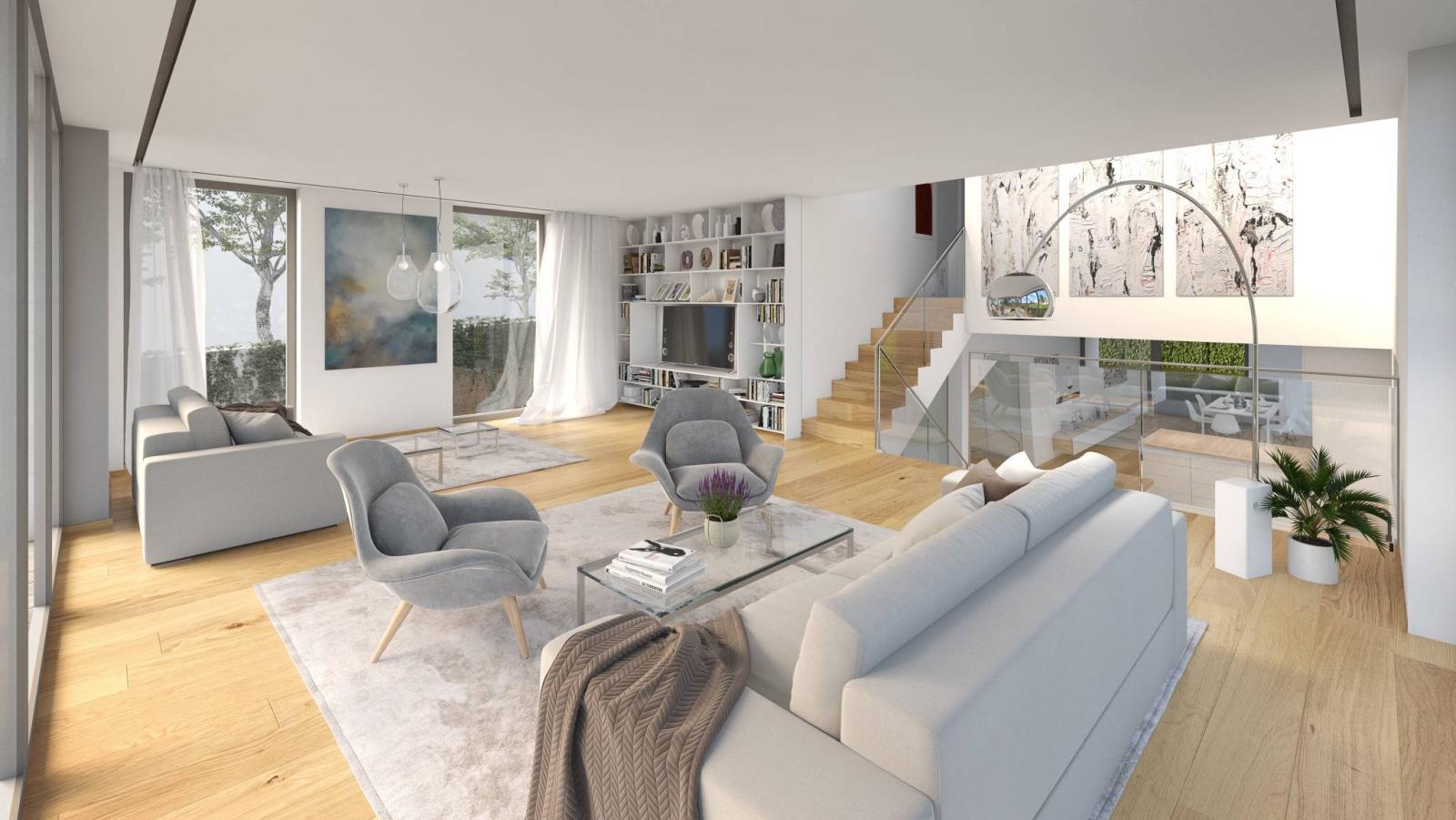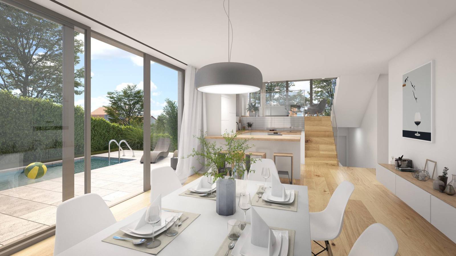 Baignée de lumière, sans vis-à-vis et répondant aux exigences de la norme THPE, La villa B profite pleinement des qualités de l’environnement, notamment grâce à de très larges ouvertures sur des balcons et terrasses.