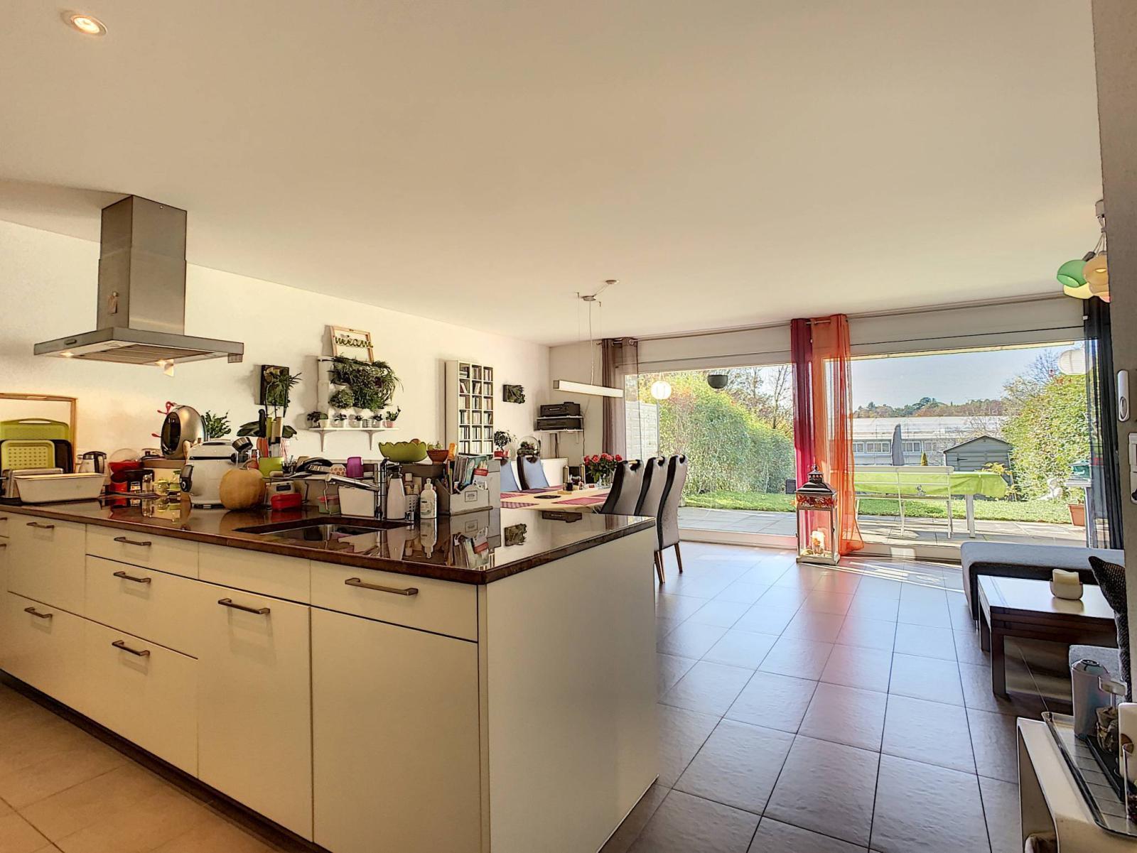 La distribution, sur 3 niveaux, comprend un vaste séjour donnant accès à une terrasse, une salle à manger et une cuisine ouverte entièrement agencée avec son coin repas, 4 chambres à coucher (dont l’une en suite) et 3 salles d’eau.