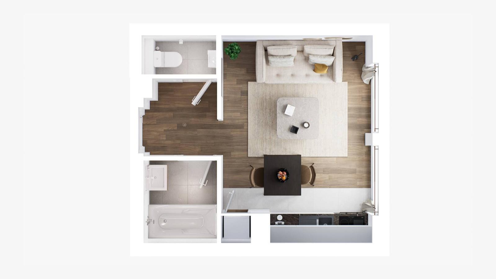 Le lot H-301 est un appartement de 1.5 pièces de 33 m2 au 3ème étage distribué comme suit :