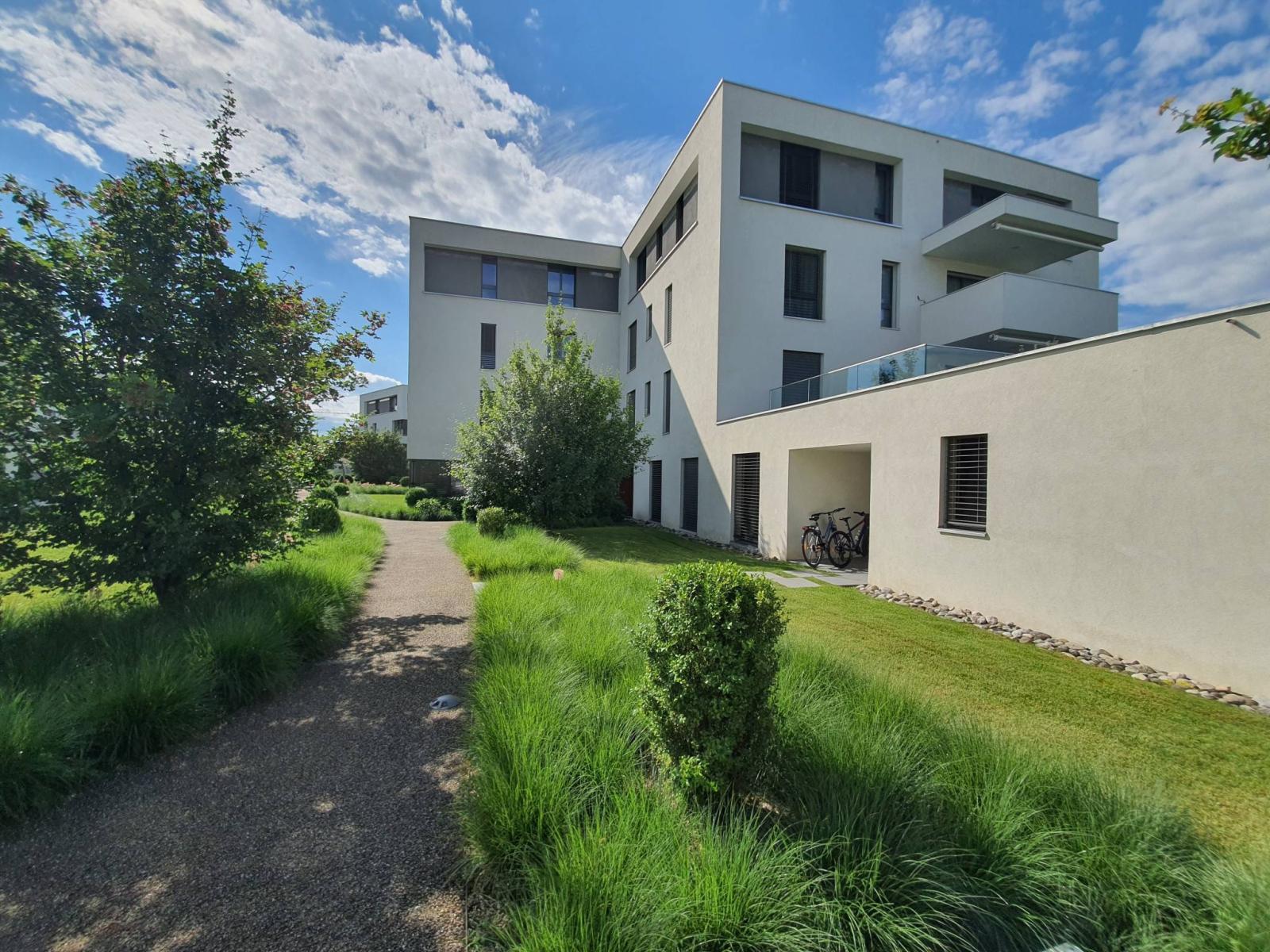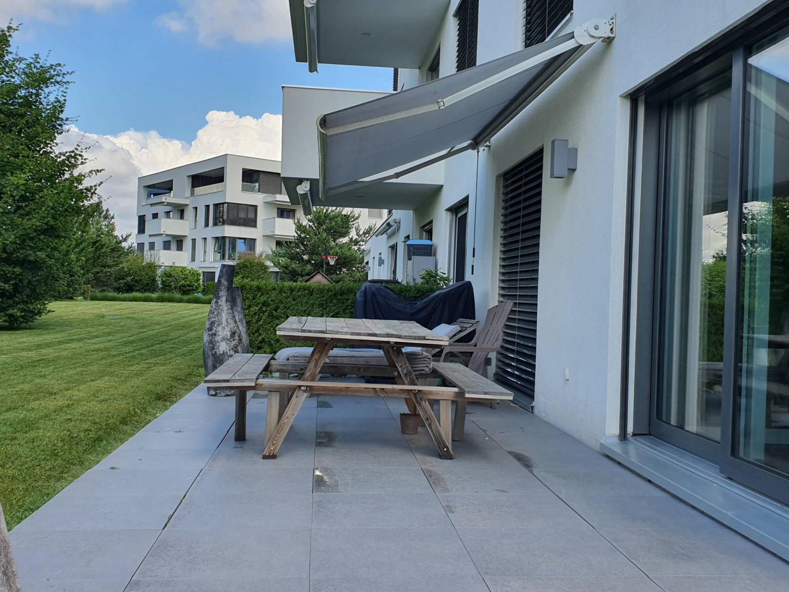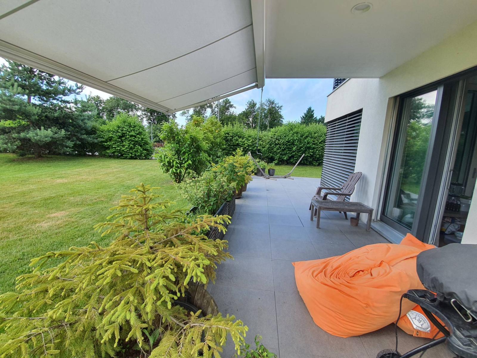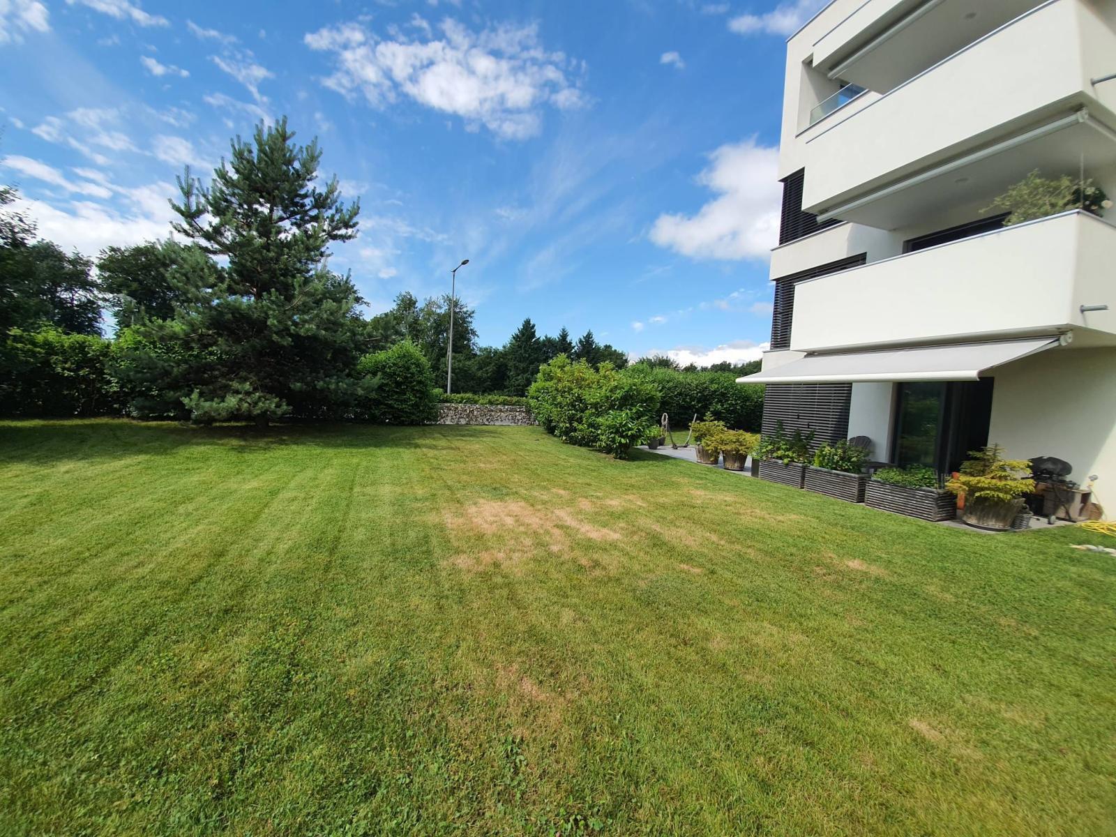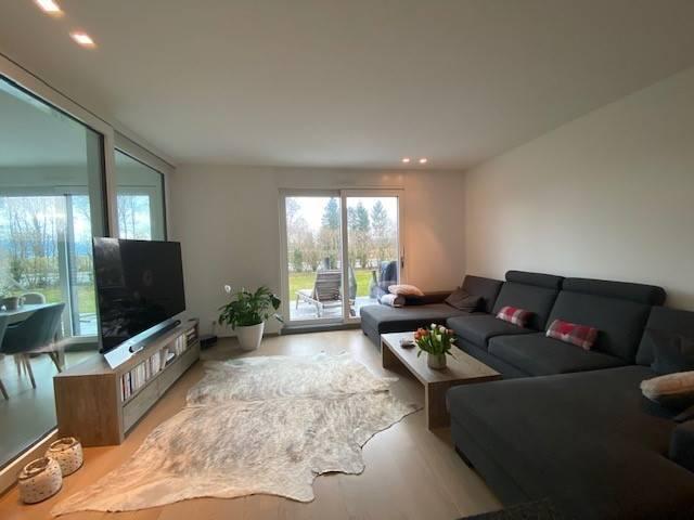 Magnifique appartement traversant de 3.5 pièces bénéficiant d'un jardin et d'une terrasse, à proximité du centre du village, du lac, des commerces (restaurants) et des transports (bus).