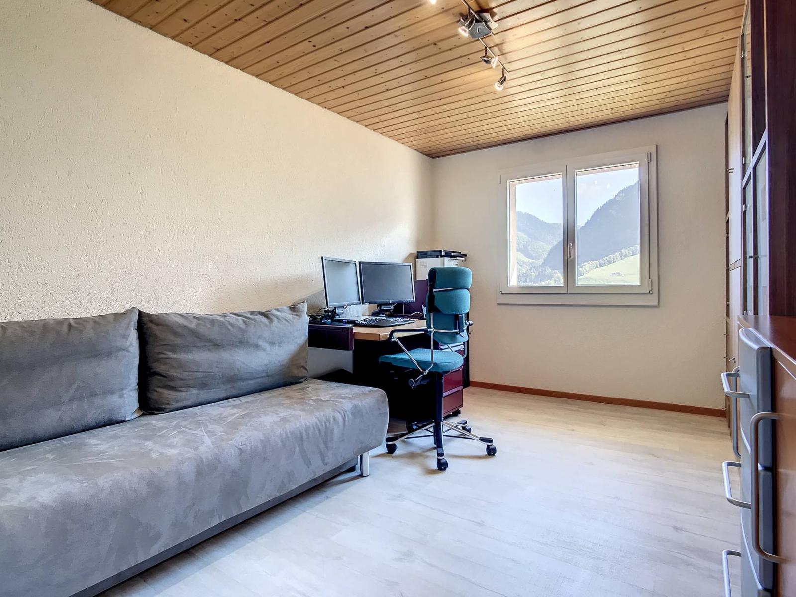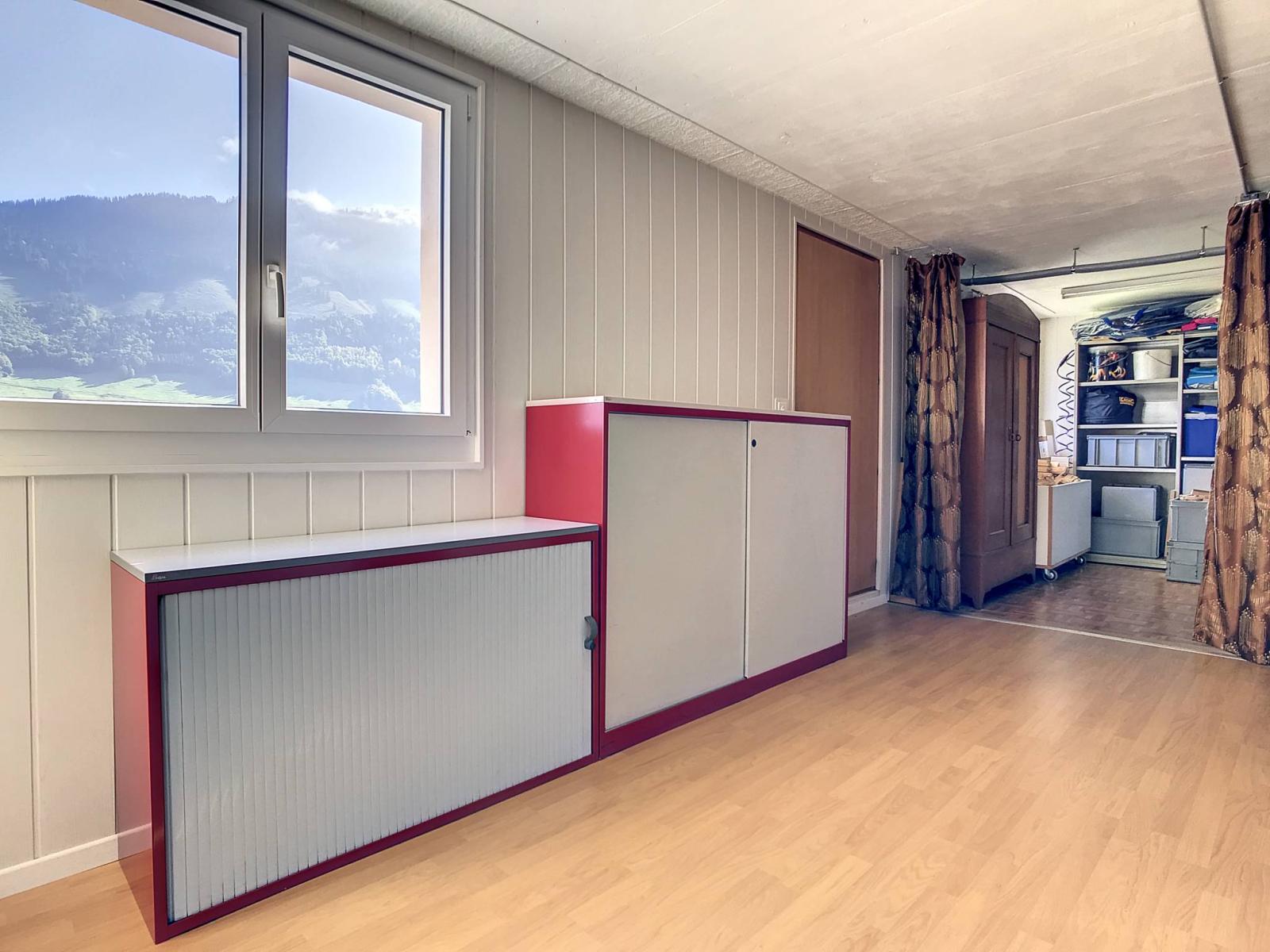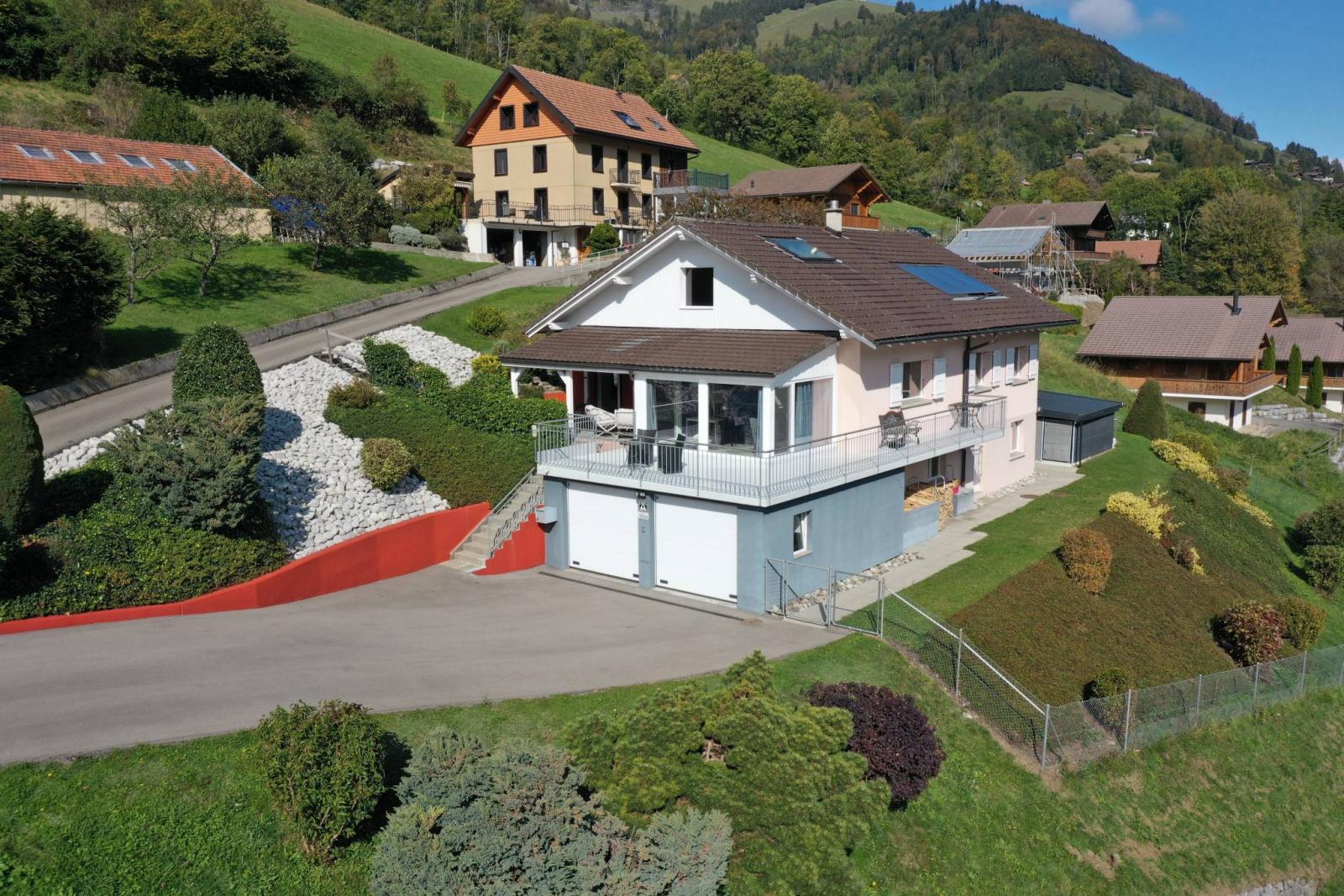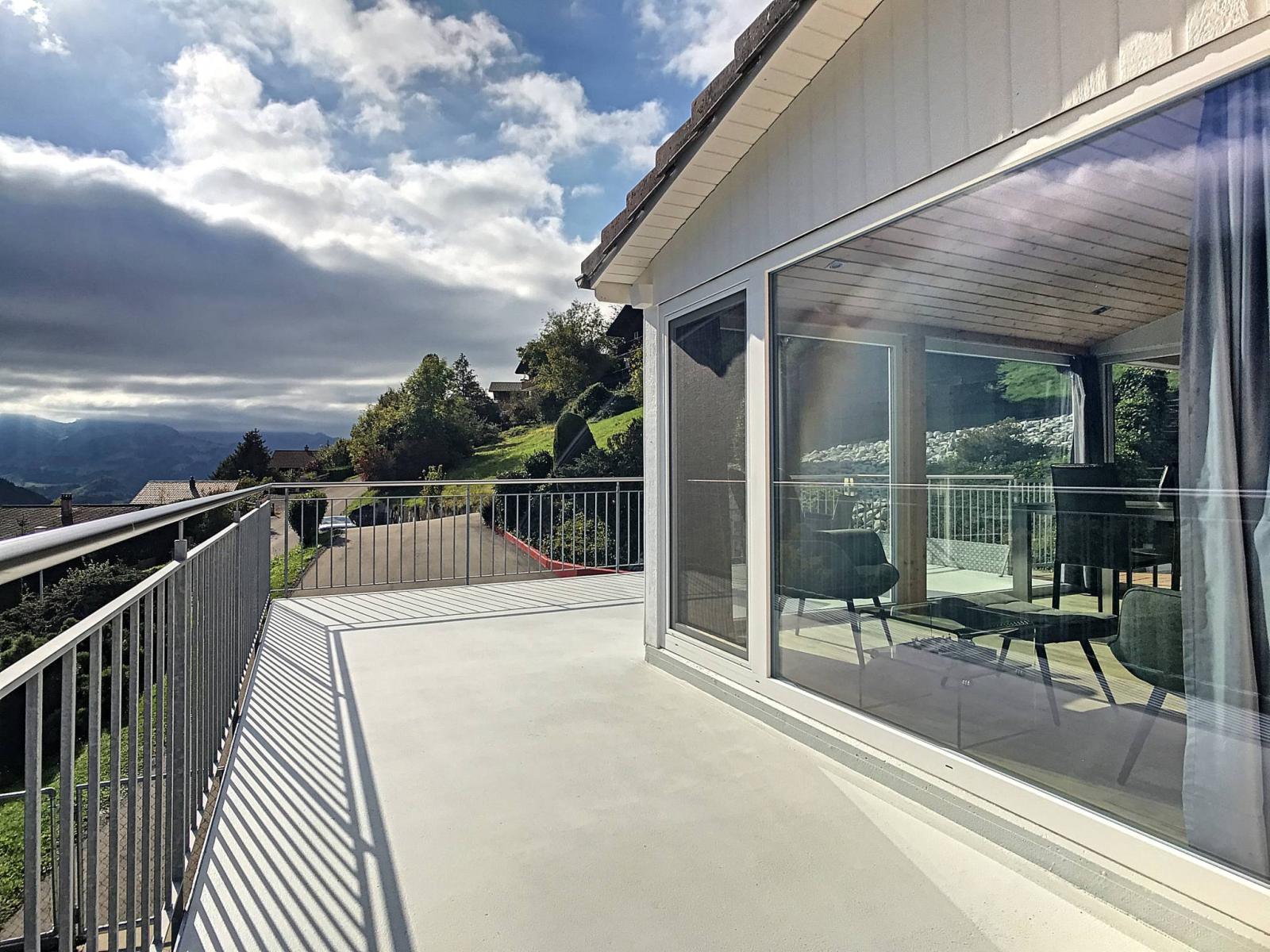 Depuis le séjour et la terrasse, profitez de la magnifique vue panoramique sur la Dent de Broc, le Moléson et le lac de Montsalvens.