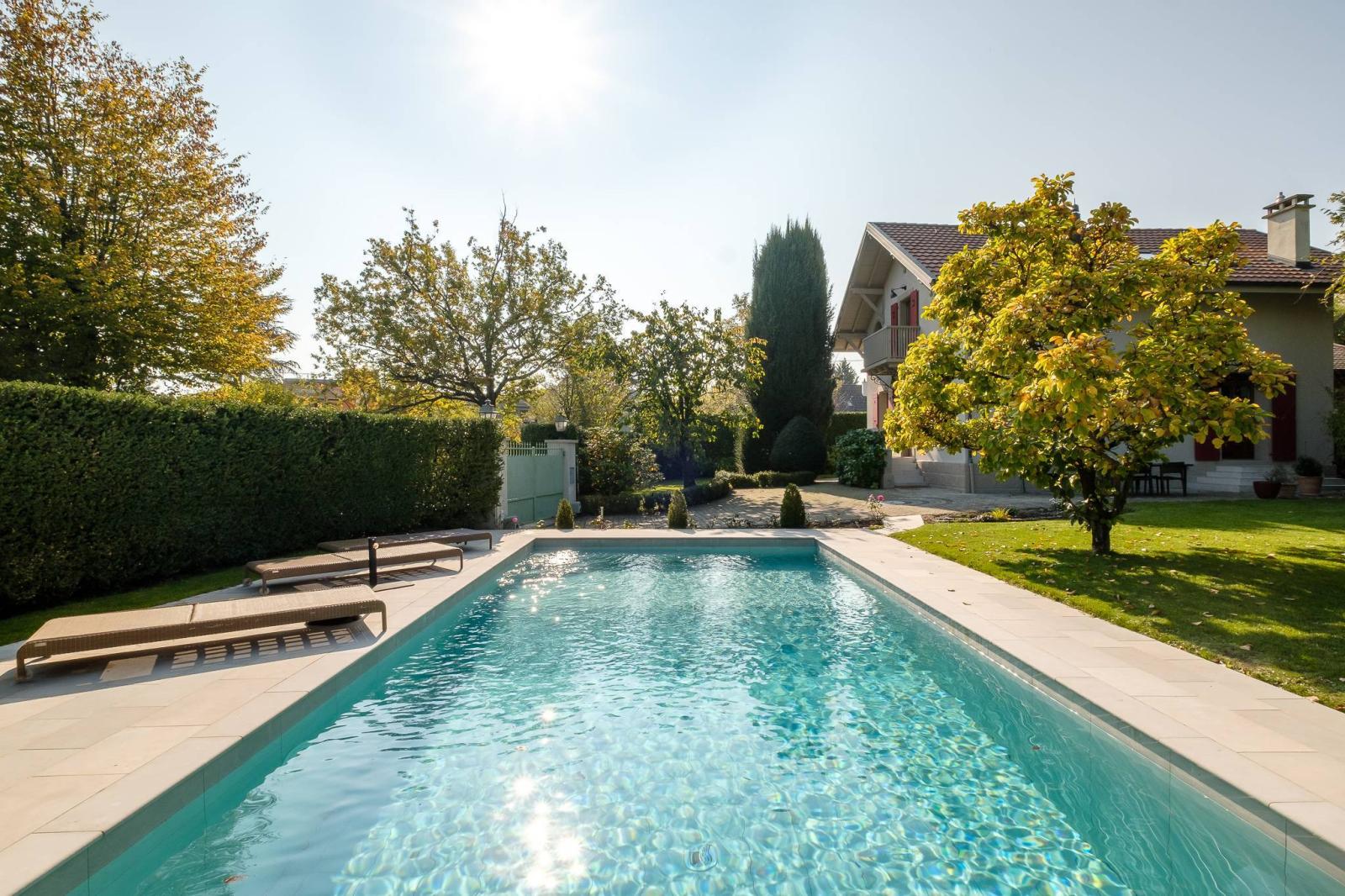 La maison bénéficie d'un élégant jardin paysagé avec une très belle piscine chauffée, d'un cabanon de jardin, d'un espace rangement, d'un système d'arrosage et d'un portail automatique.