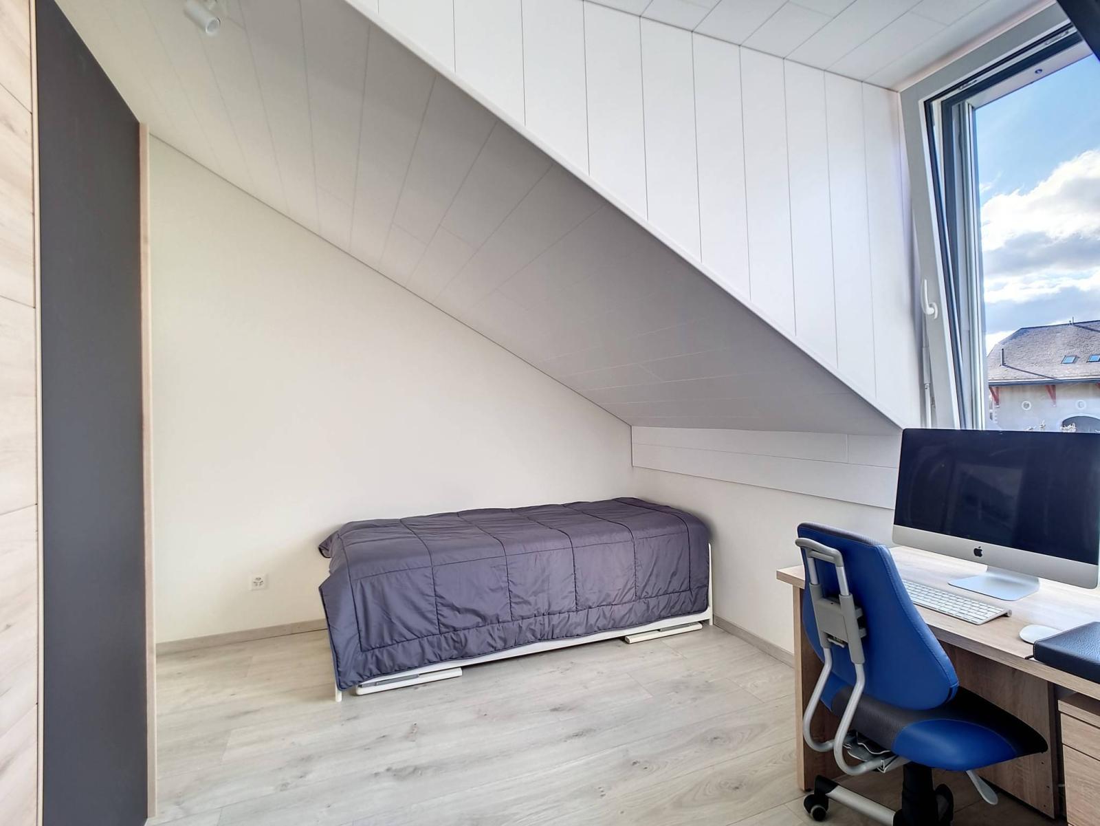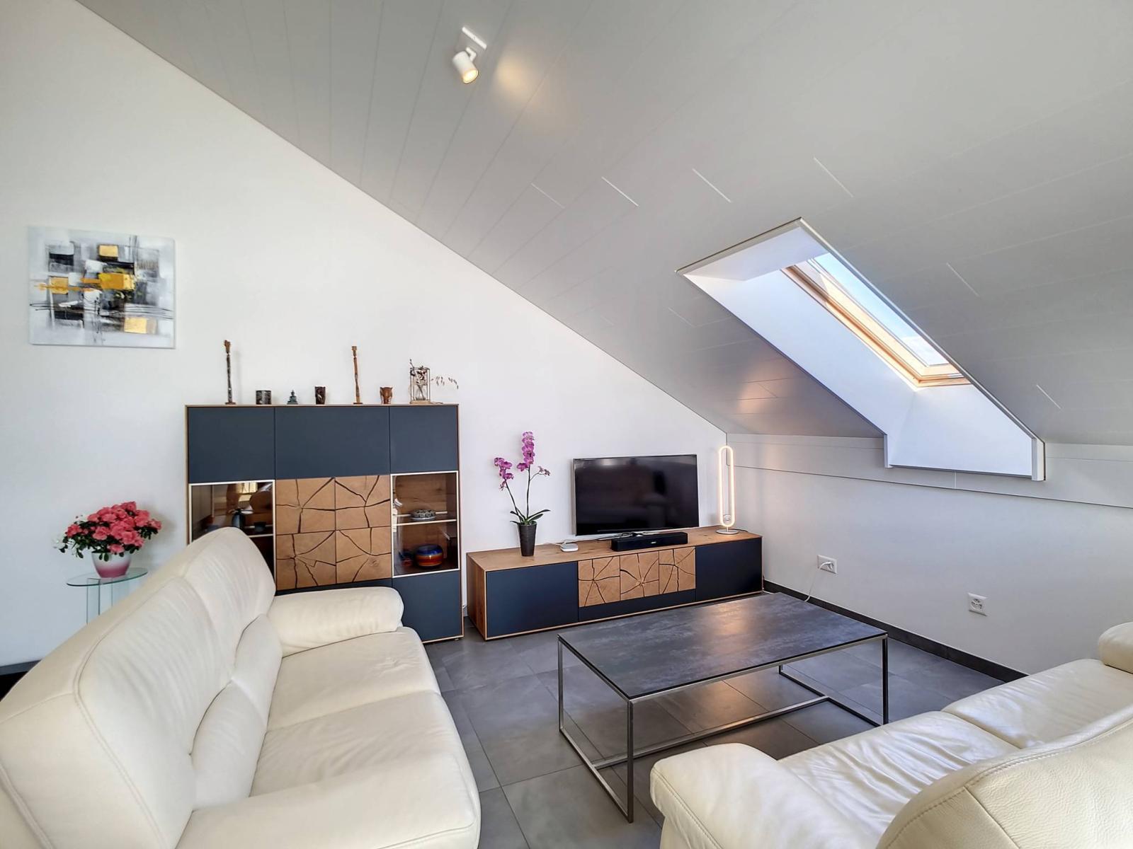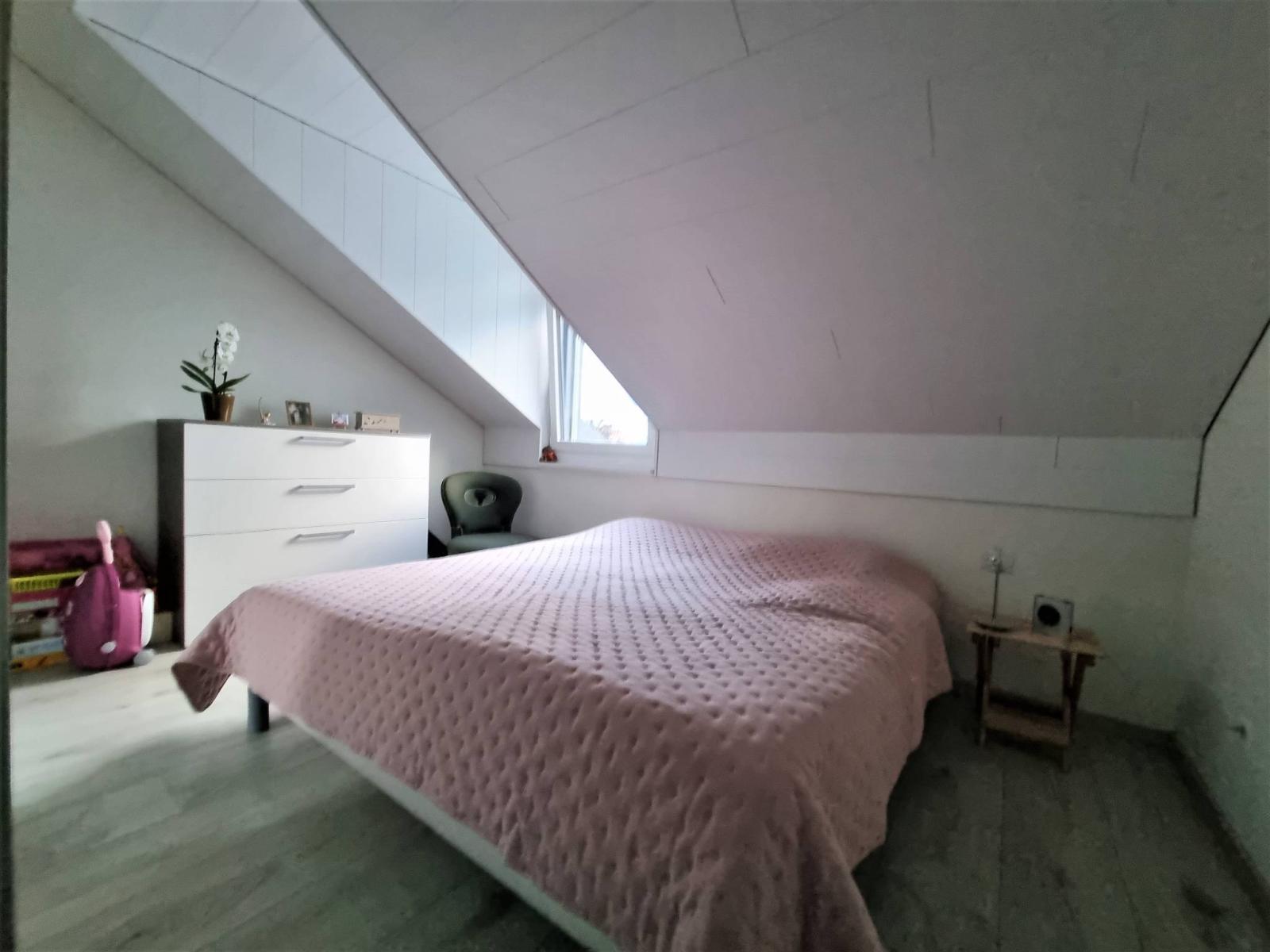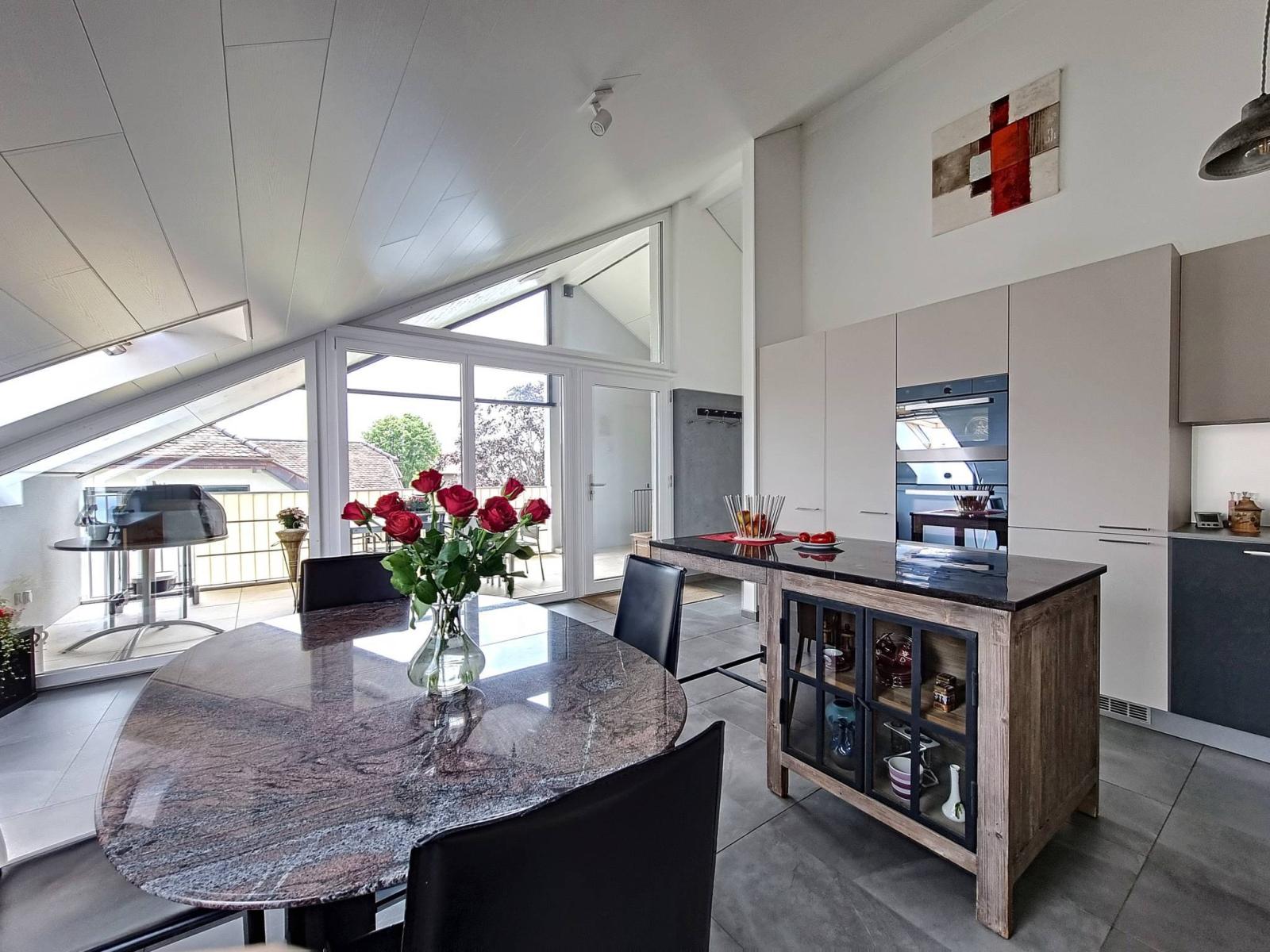 Ce 3.5 pièces de bon standing, sur un seul niveau et en attique, profite de 2 chambres à coucher, d'une salle de bains/WC et d'une salle de douche/WC, ainsi que d'une spacieuse pièce principale "moderne et coup de coeur" (salon / salle à manger / cuisine complètement aménagée et équipée) de 46.30 m² et d'une jolie hauteur sous le faîte qui rend la mansarde cosy et non contraignante.Le mur du hall d'entrée a été joliment personnalisé en béton-ciré.