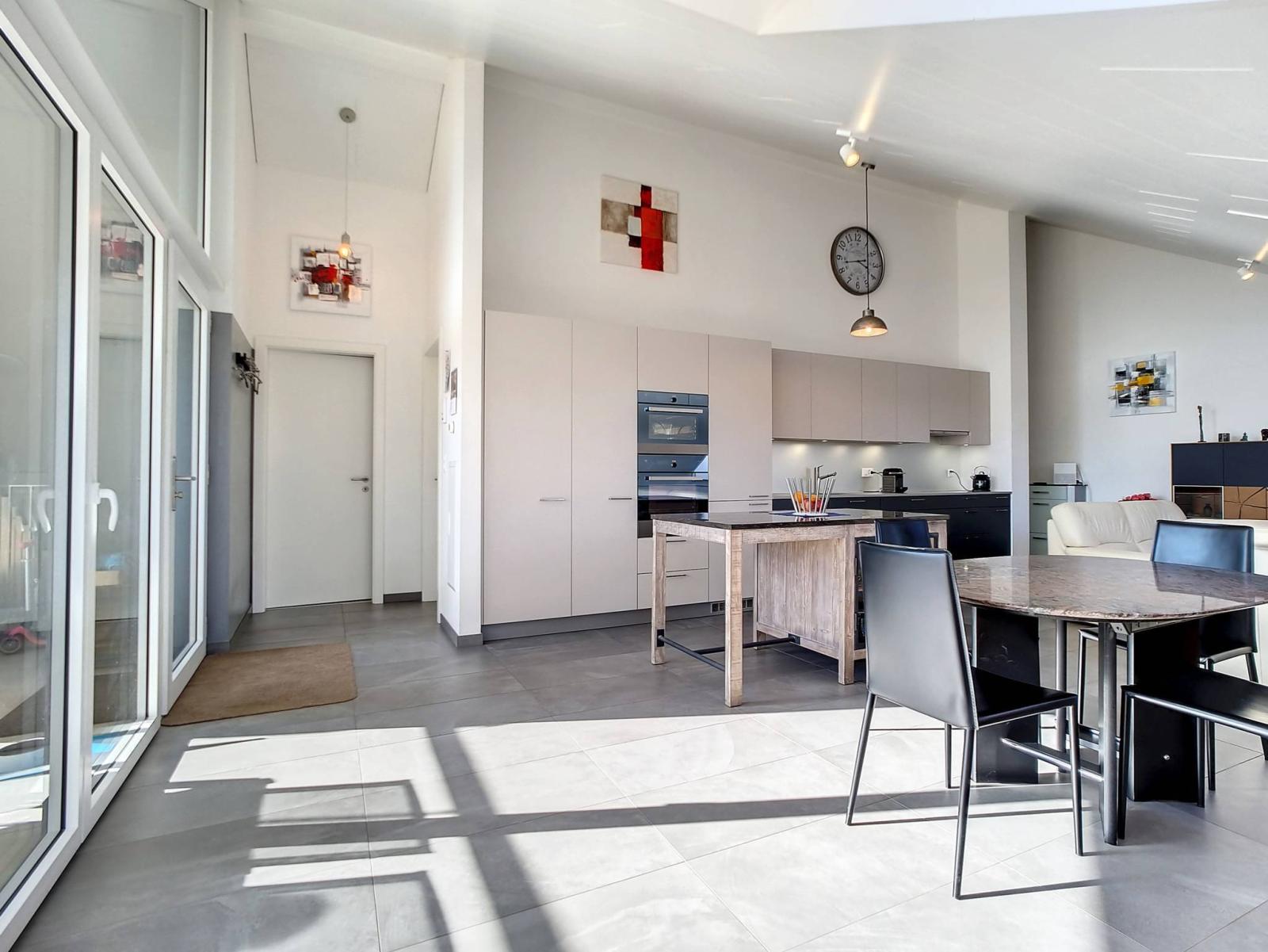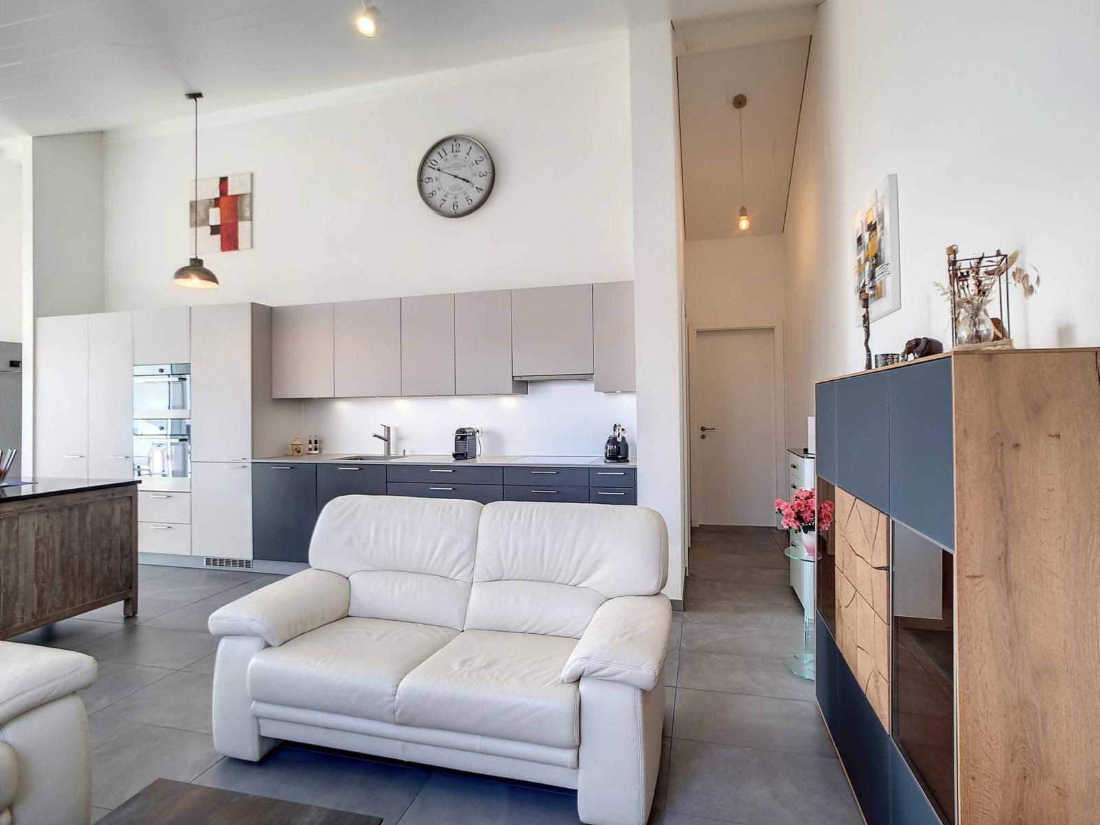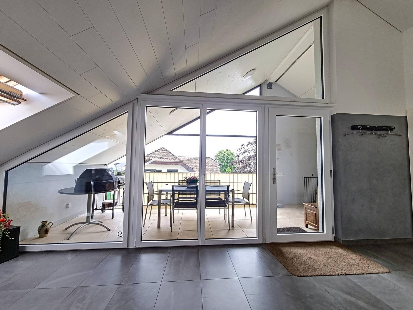 Ce 3.5 pièces de bon standing, sur un seul niveau et en attique, profite de 2 chambres à coucher, d'une salle de bains/WC et d'une salle de douche/WC, ainsi que d'une spacieuse pièce principale "moderne et coup de coeur" (salon / salle à manger / cuisine complètement aménagée et équipée) de 46.30 m² et d'une jolie hauteur sous le faîte qui rend la mansarde cosy et non contraignante.Le mur du hall d'entrée a été joliment personnalisé en béton-ciré.