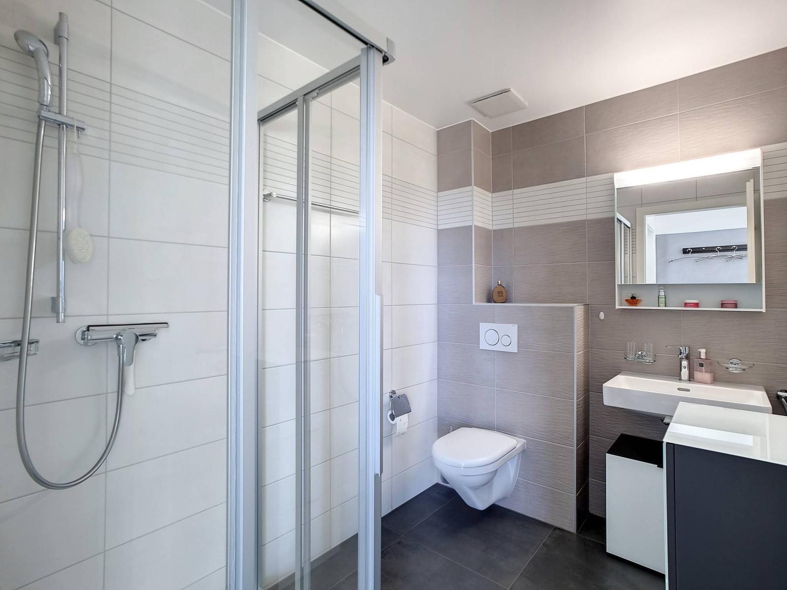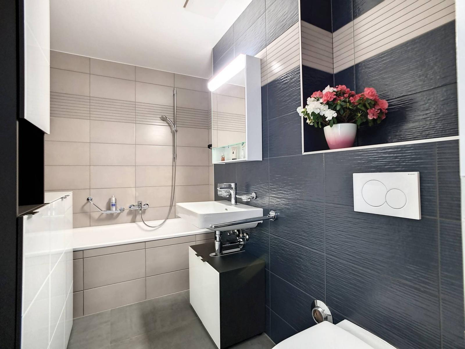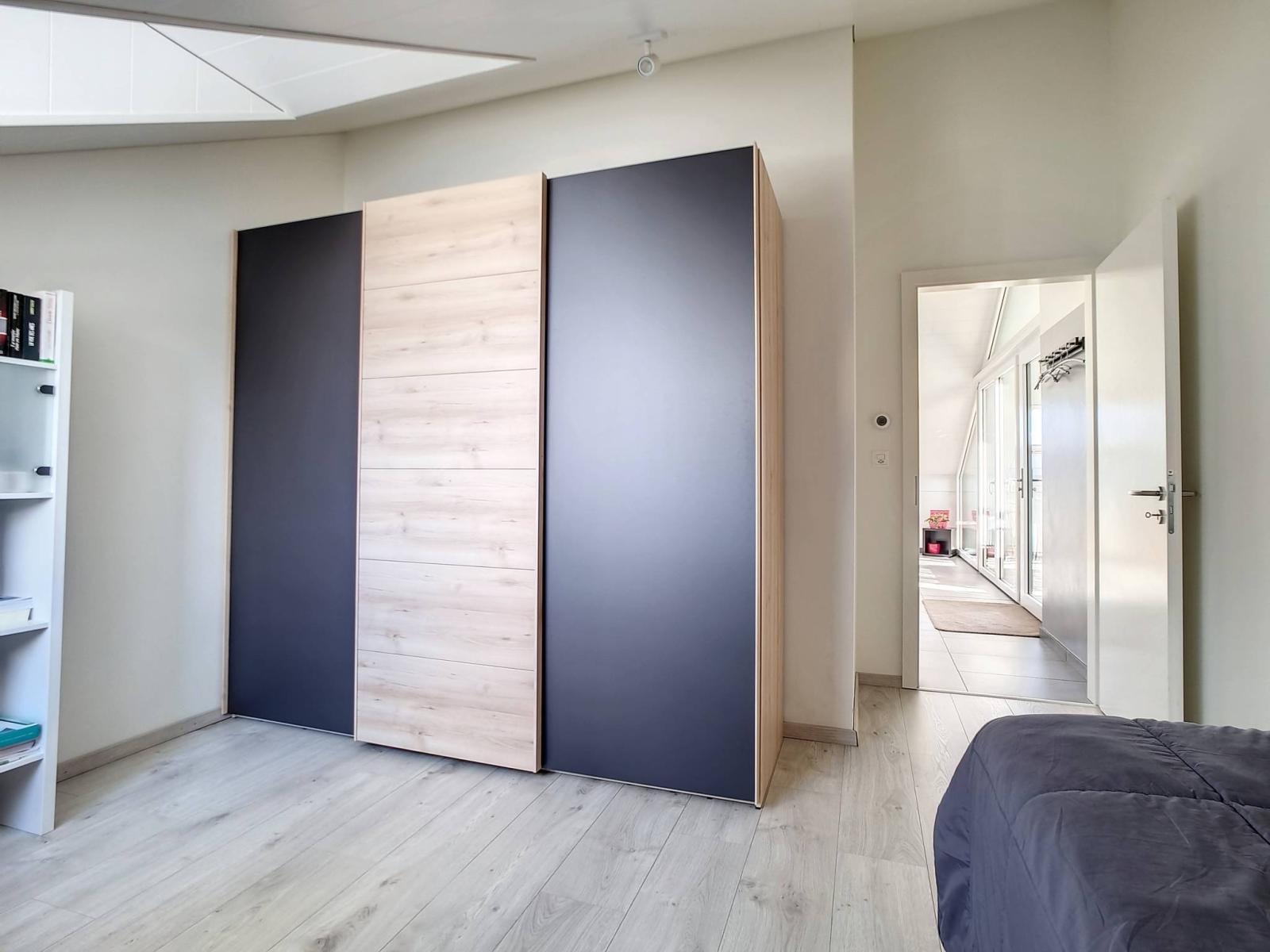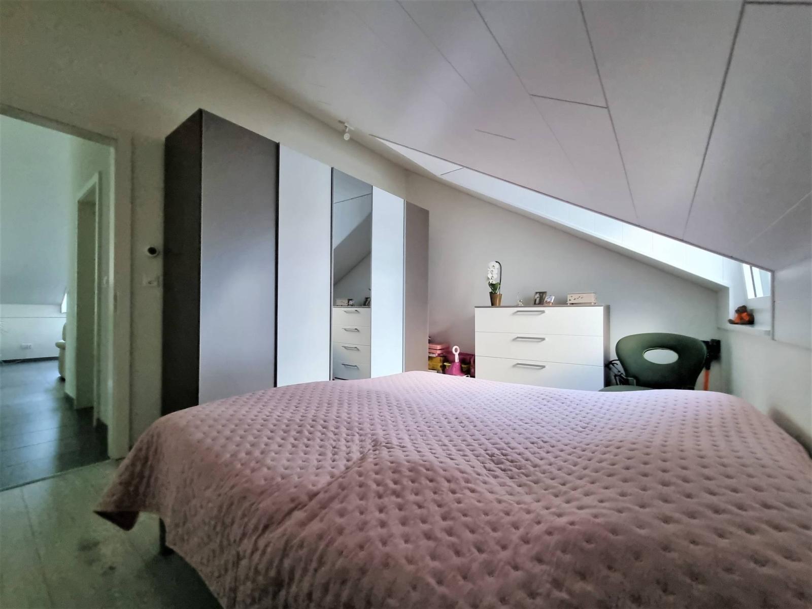 Ce 3.5 pièces de bon standing, sur un seul niveau et en attique, profite de 2 chambres à coucher, d'une salle de bains/WC et d'une salle de douche/WC, ainsi que d'une spacieuse pièce principale "moderne et coup de coeur" (salon / salle à manger / cuisine complètement aménagée et équipée) de 46.30 m² et d'une jolie hauteur sous le faîte qui rend la mansarde cosy et non contraignante.Le mur du hall d'entrée a été joliment personnalisé en béton-ciré.
