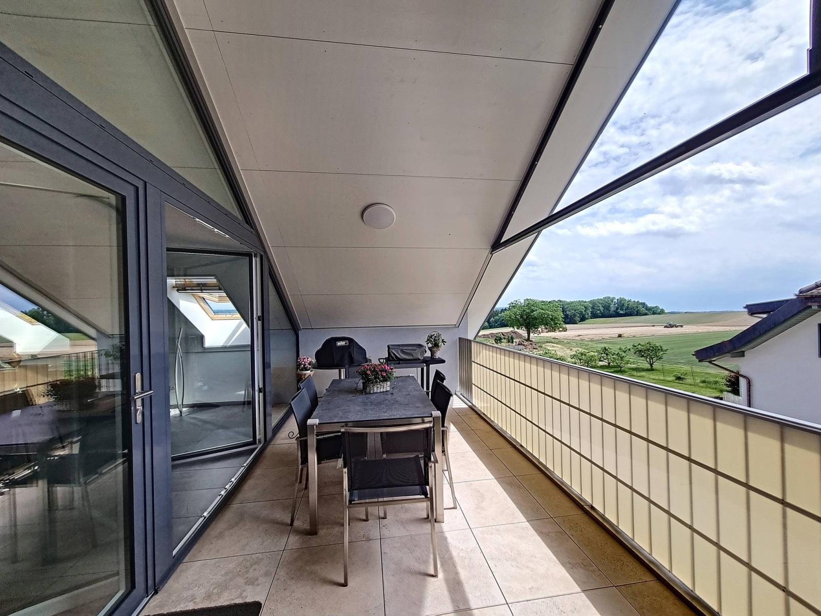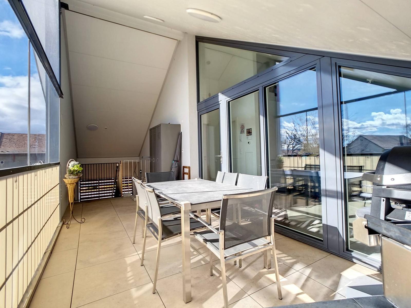 Au sein d'un immeuble à taille humaine de 2 étages (lot au dernier étage = sans ascenseur), édifié en 2017, la PPE se présente sous la forme de 2 petits immeubles de 6 et 8 lots. L'appartement est en attique, avec un large balcon couvert (type loggia ouverte) de presque 19 m² ! Celle-ci est organisée de sorte à pouvoir resté "ouverte" ou "semi-fermée" par un vitrage amovible, afin d'en profiter toute l'année.
