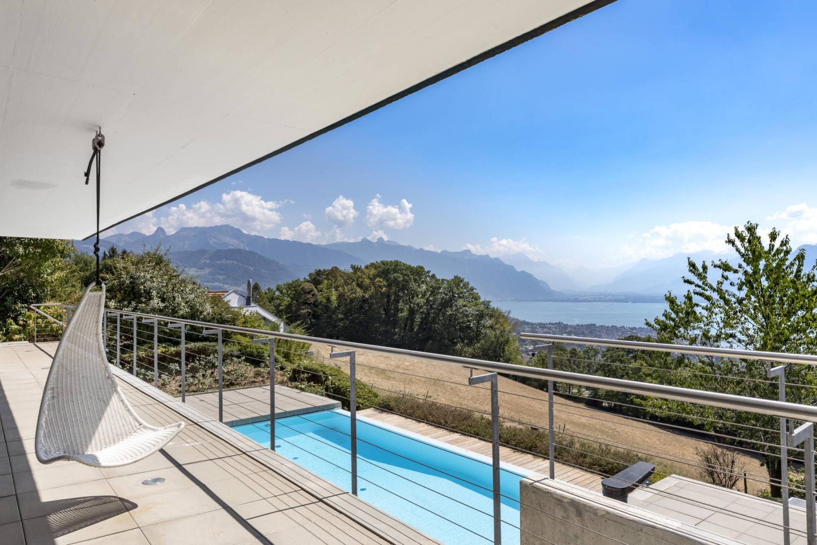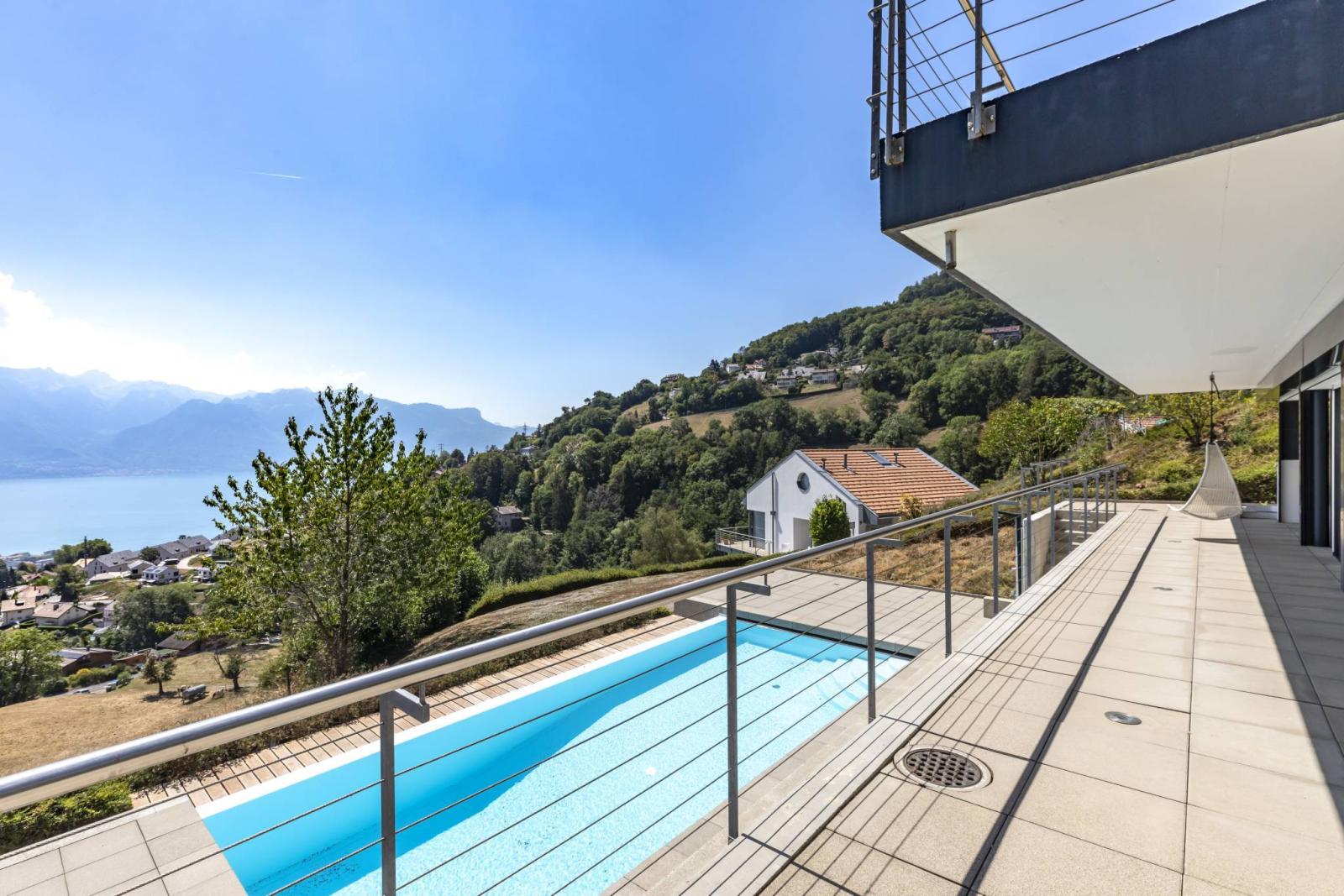 Bâtie sur une parcelle de 700 m², cette villa individuelle de 6 pièces d'environ 195 m² habitables bénéficie d'une magnifique vue sur le lac Léman et les montagnes avec un ensoleillement optimal. En plus de cette dernière, elle profite de deux terrasses, d'un petit coin jardin, d'un balcon et d'une grande piscine extérieure chauffée par pompe à chaleur.