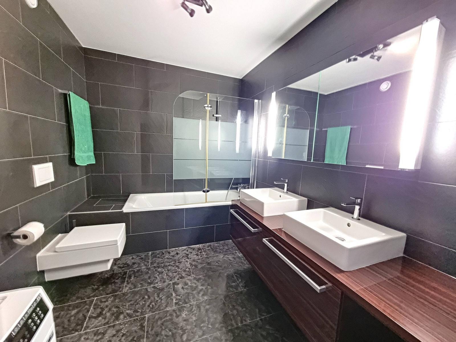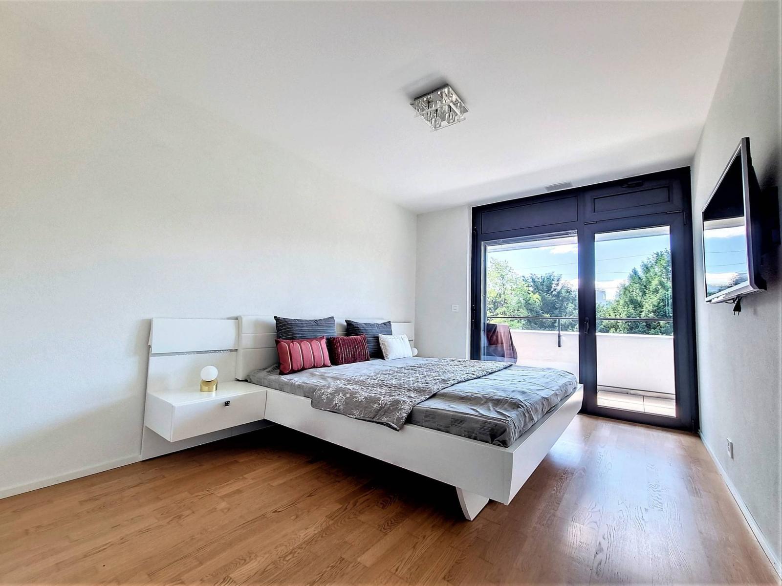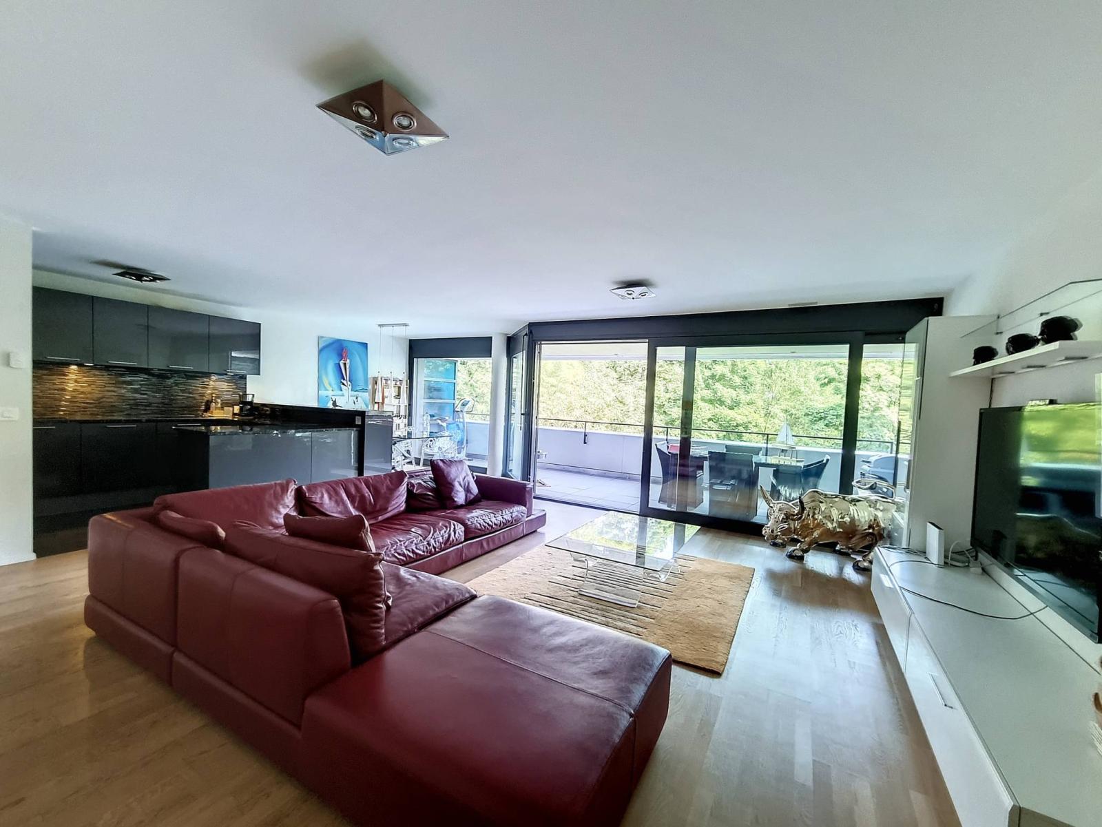 Nous avons l'avantage de vous présenter cet appartement traversant de 4.5 pièces de 112.6 m² habitables, offrant trois chambres à coucher dont une master avec salle de bain (raccordement machine à laver existant) et une armoire sur-mesure avec miroirs.Il dispose aussi d'un hall d'entrée avec placards, un spacieux et lumineux séjour/cuisine de standing d'environ 47 m² profitant de baies vitrées donnant accès sur une terrasse sans vis-à-vis autre que la verdure. Les finitions sont de premier choix (cuisine de standing avec plan de travail en granit, équipement AEG vitrocéramique,crédence en faillance,...).