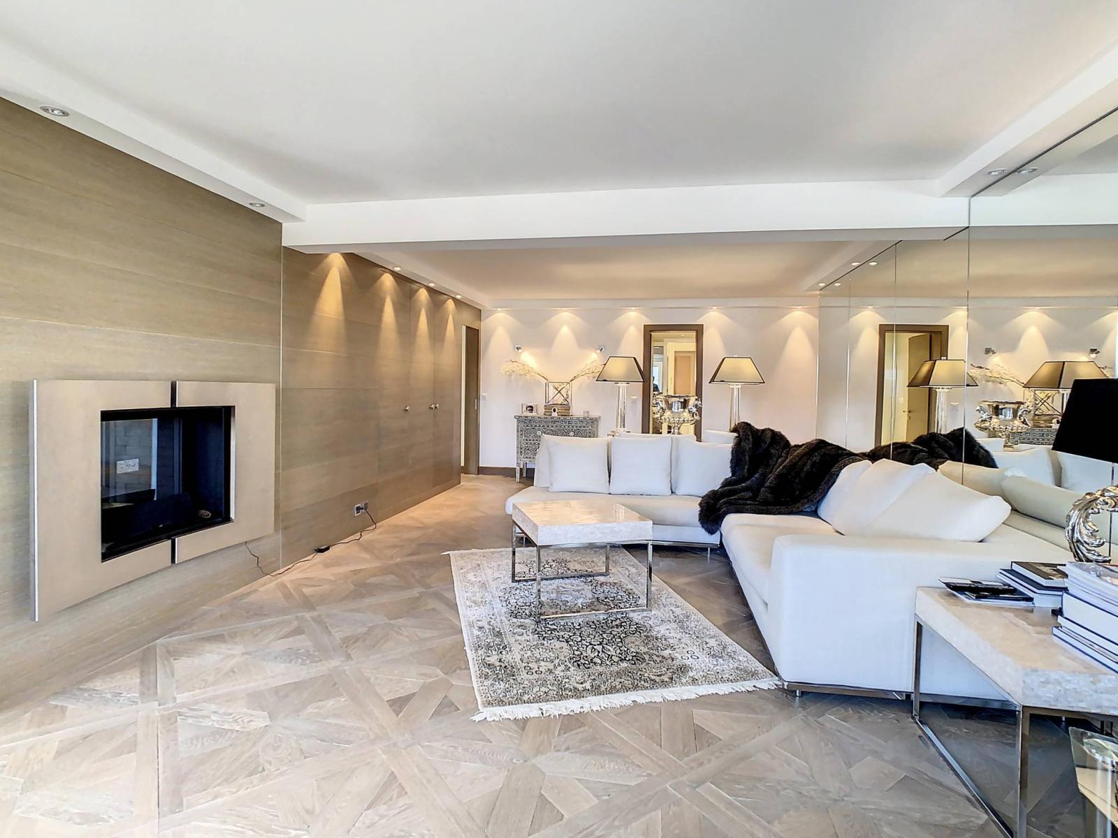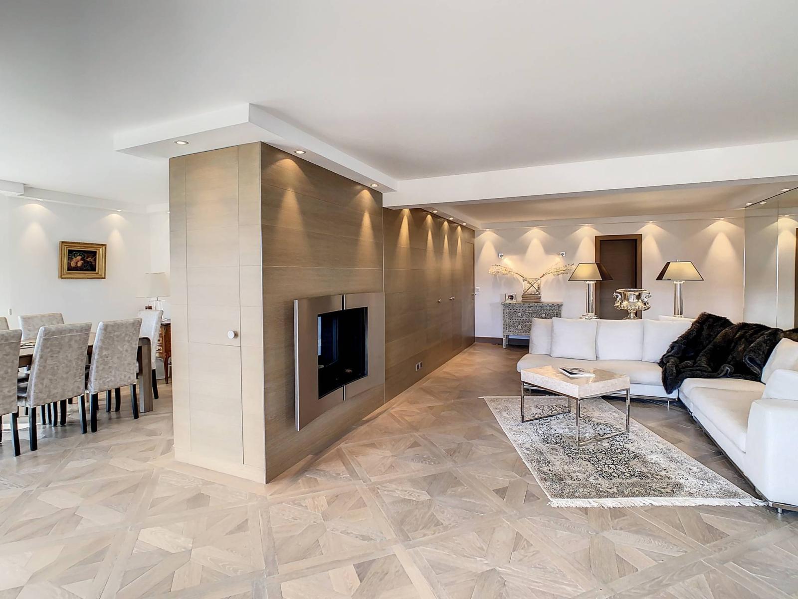 D'une surface de 150m2 pondérés, comprenant une surface habitable de 140m2 et 20 m2 de terrasse, cet appartement d'angle et traversant avec de beaux espaces est équipé de matériaux et installations haut de gamme. Notamment, un système audio dans toutes les pièces, deux salles de bains avec une baignoire hydromassage et une douche balnéo, un grand séjour avec cheminée double foyer. Son parquet authentique a été crée à partir de planchers anciens, ce qui apporte un charme et une ambiance cosy.