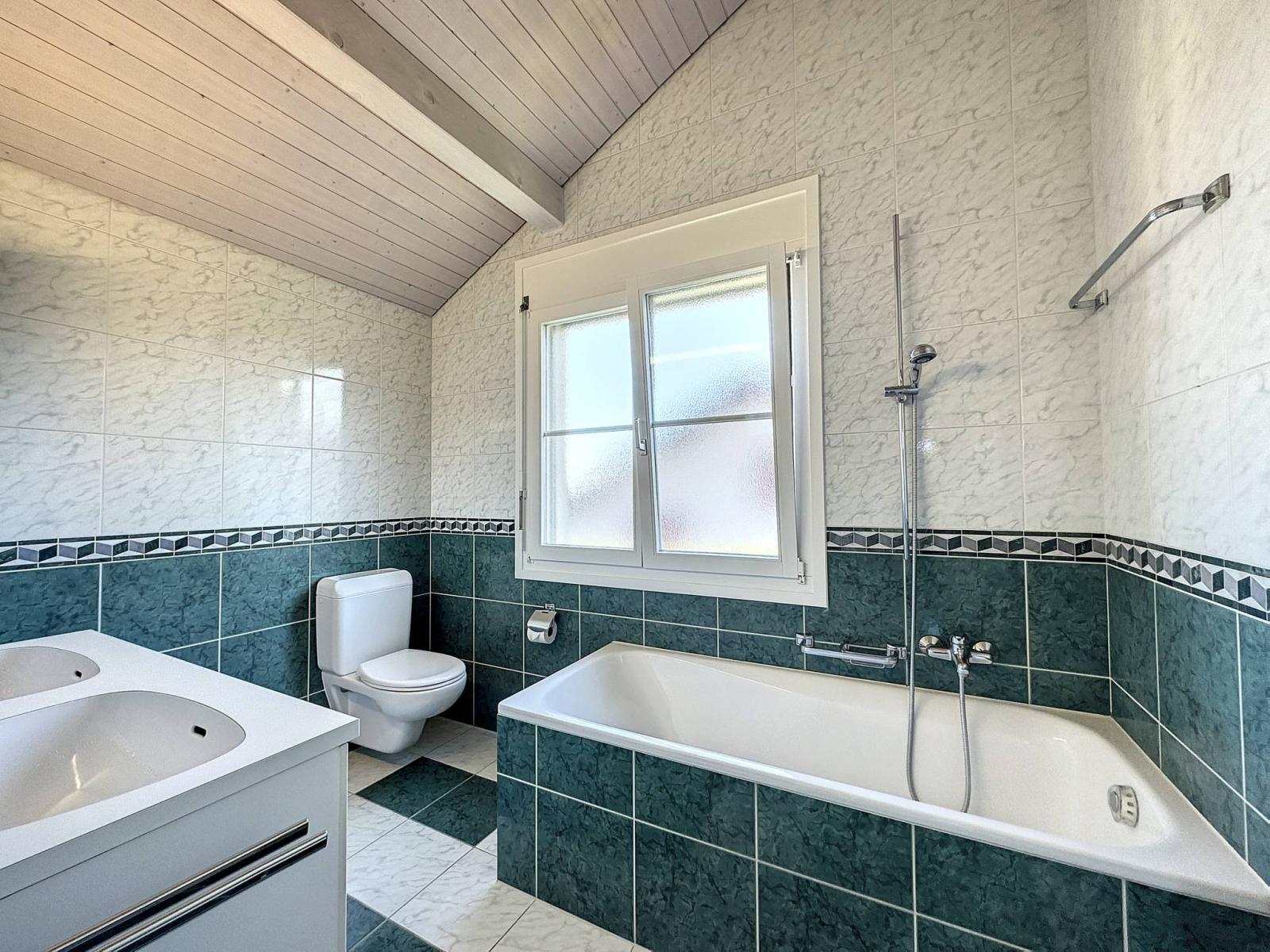 - Une salle de bain avec baignoire et WC.