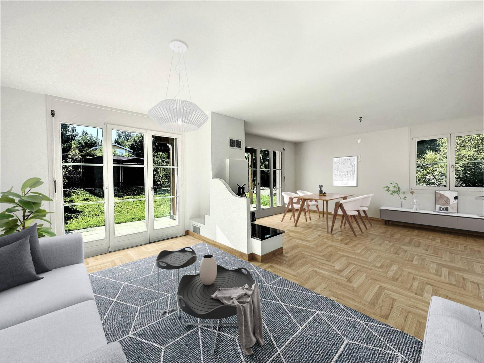 - Une grande pièce de vie de plus de 40 m², comprenant le séjour équipé d'une cheminée de salon, la salle à manger et la cuisine entièrement équipée, le tout donnant accès au jardin bien arborisé.