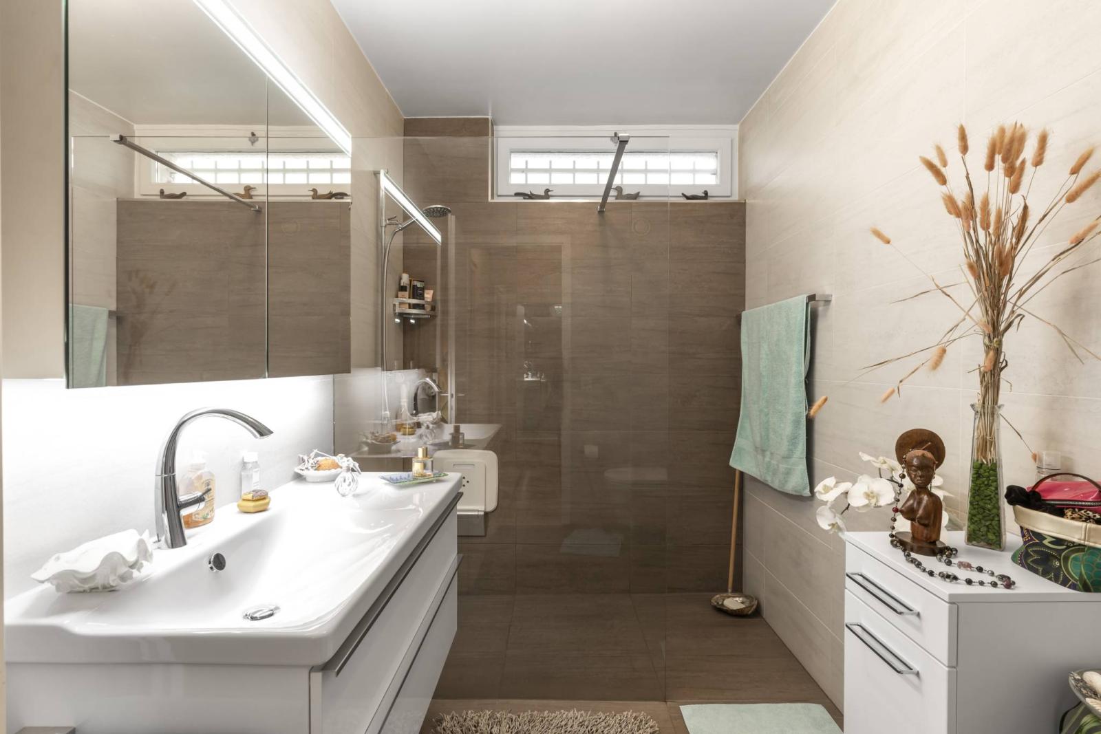 Il dispose d'un grand séjour / salle à manger, d'une cuisine habitable fermée, d'une grande terrasse orientée plein sud, de 3 chambres à coucher, d'une salle de bains/WC et d'une salle de douche/WC.