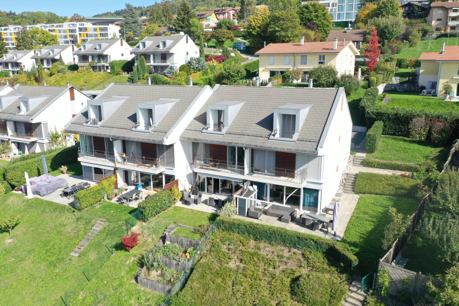 Desservie par un chemin privé, cette maison offre une belle vue dégagée sur le lac en étant au cœur d'un joli quartier familial et verdoyant. Située à proximité des transports publics, des écoles et des axes autoroutiers, elle profite d'une ambiance chaleureuse, idéale pour toute la famille.