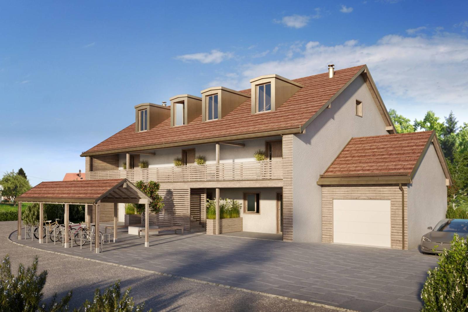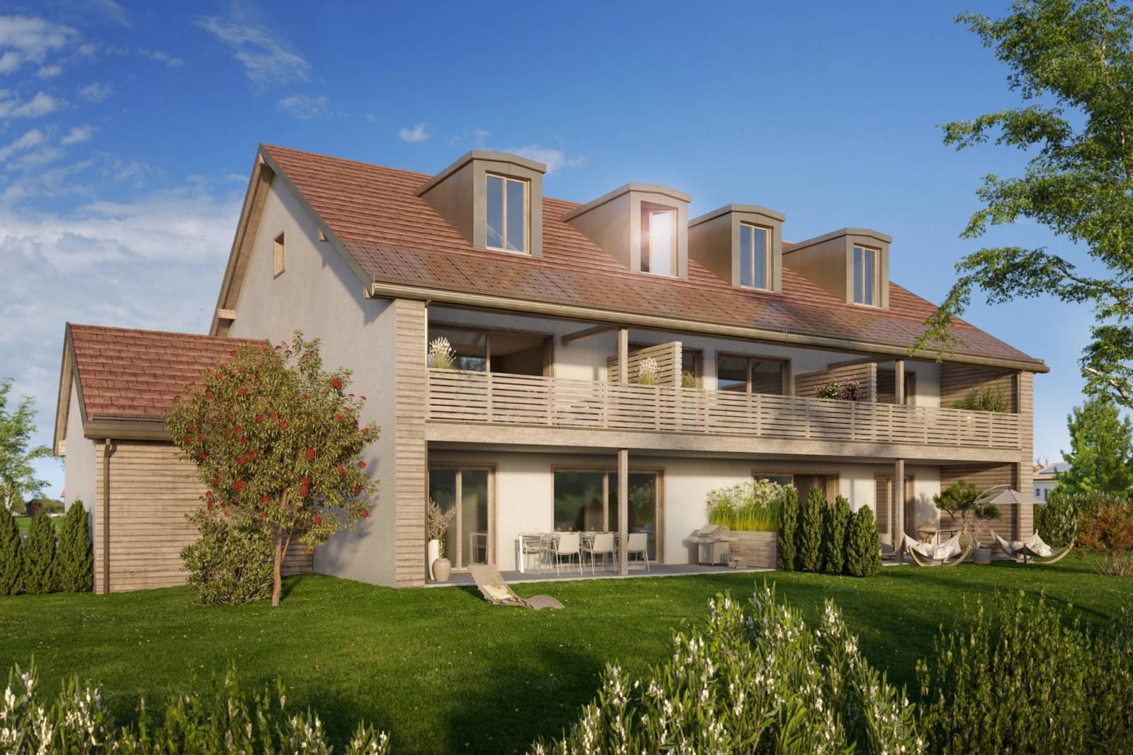 Au premier étage d’une nouvelle résidence villageoise située à Jussy, au cœur du charmant hameau de Lullier, superbe appartement de 3 pièces avec grand balcon exposé Ouest et vue sur des jardins.