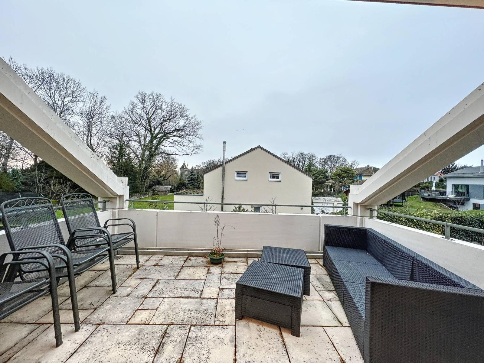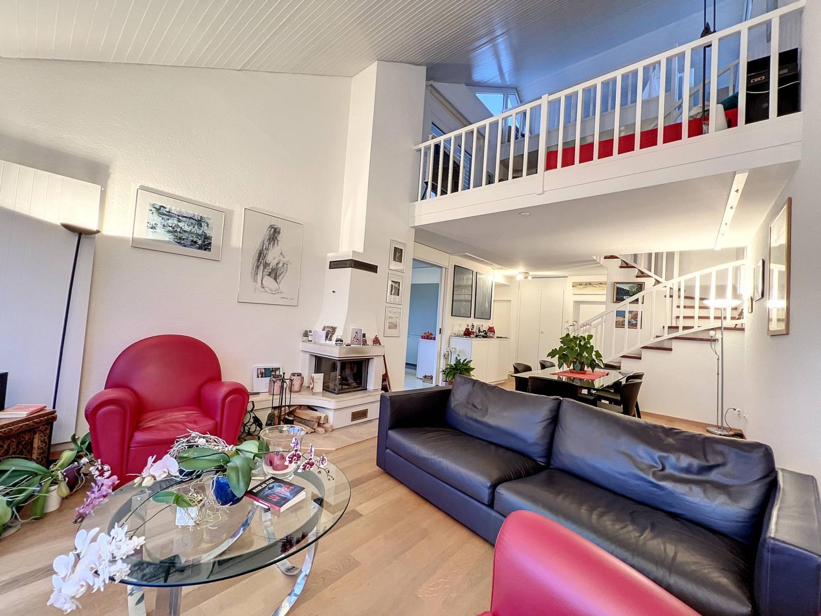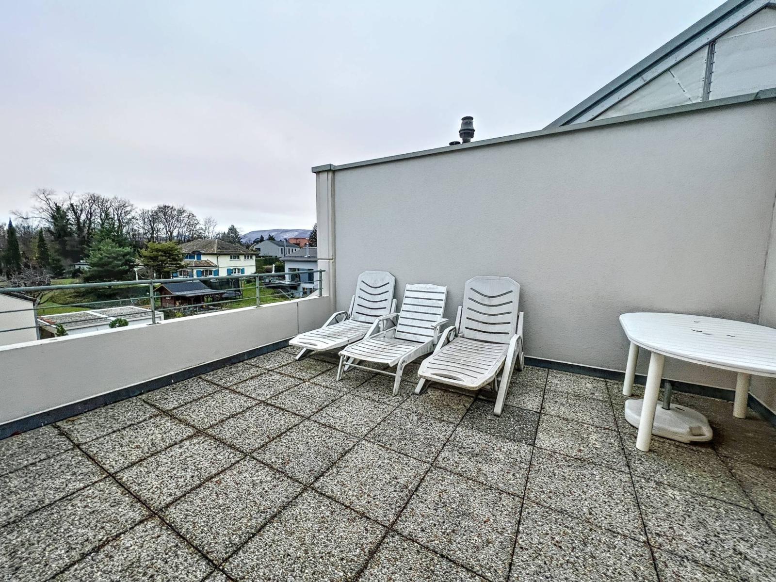 A l'étage, se trouvent, une vaste chambre parentale, une salle de douche, ainsi qu'une lumineuse mezzanine ouverte sur le séjour avec terrasse/solarium.Une seconde mezzanine (12.7 m2), actuellement aménagée en bureau, avec une belle vue sur le lac et le Jura, complète le logement.