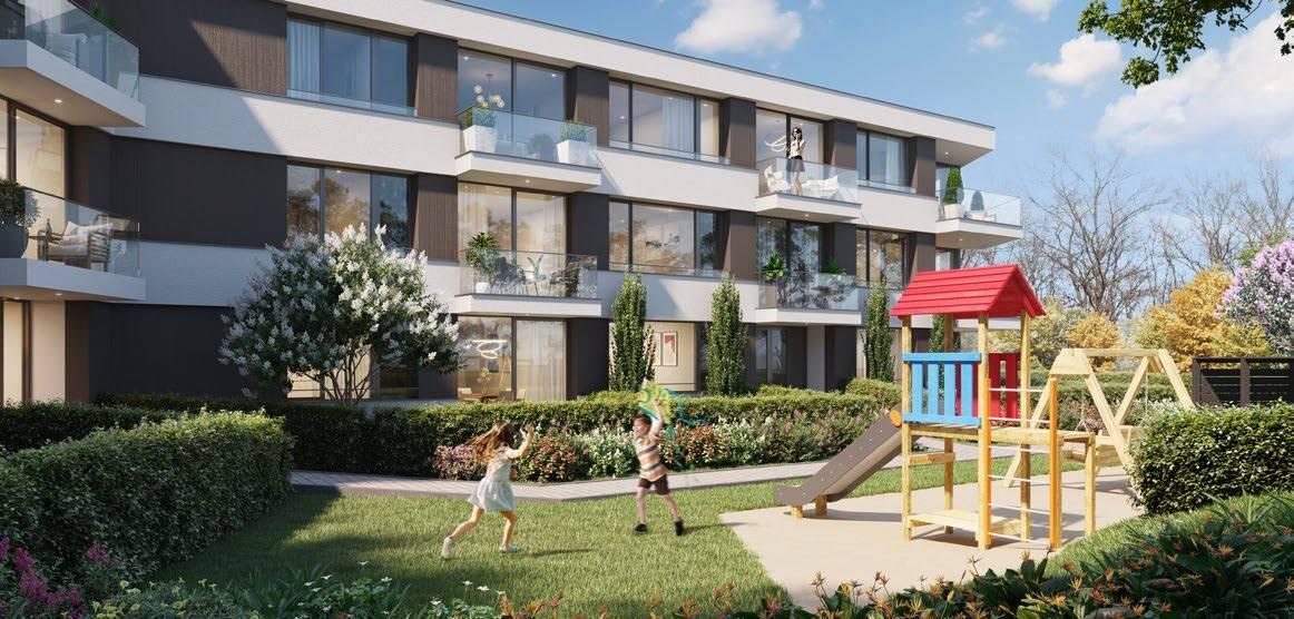 Une place de jeux pour les enfants se trouve à l’entrée de l’immeuble.
