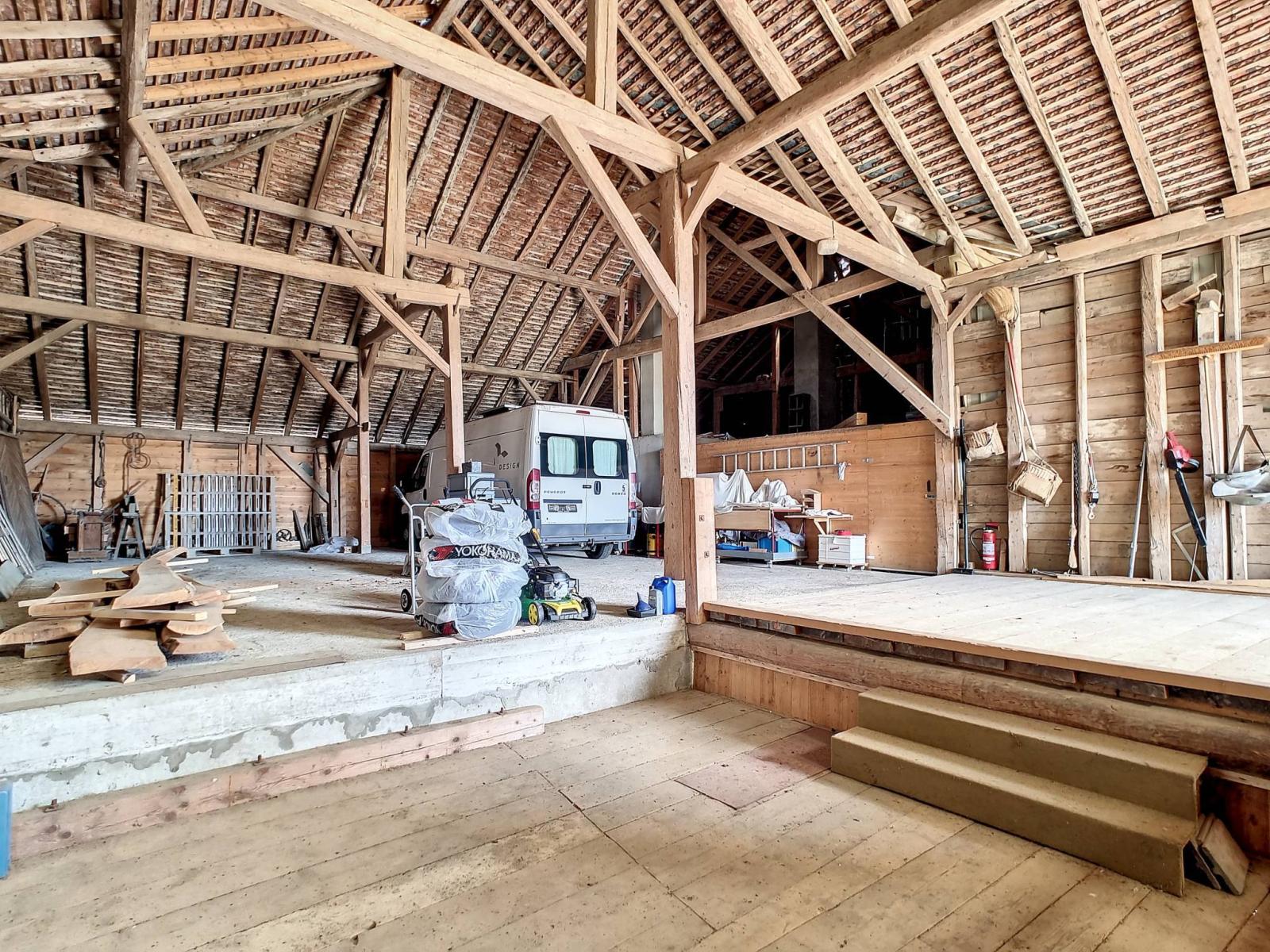 La partie grange offre un immense volume avec une cave, un couvert, deux vastes garages intérieurs (belle hauteur sous plafond), un coin atelier/galetas ainsi qu'un rural désaffecté qui peut être utilisé pour une activité indépendante ou pour créer un logement supplémentaire.