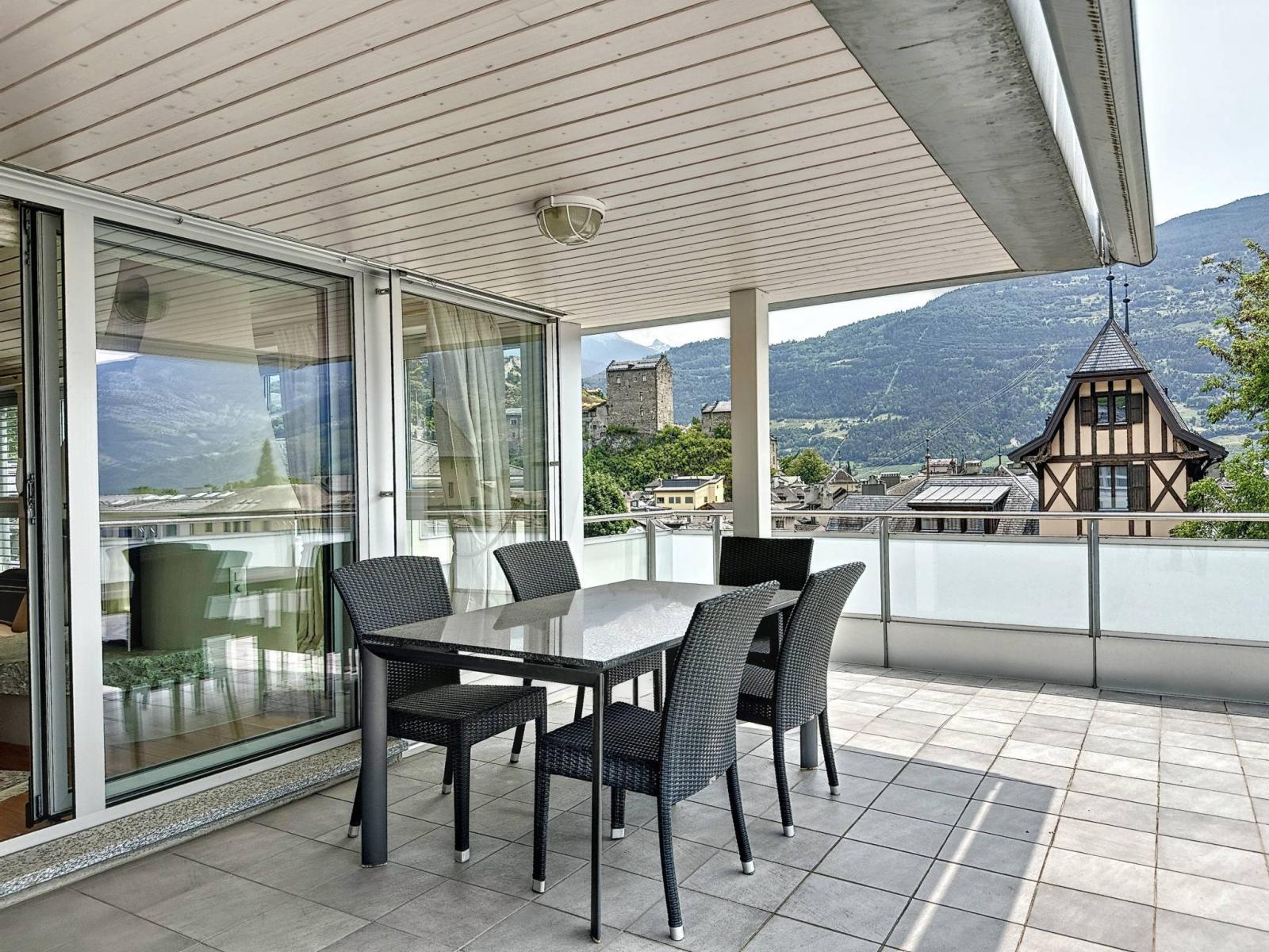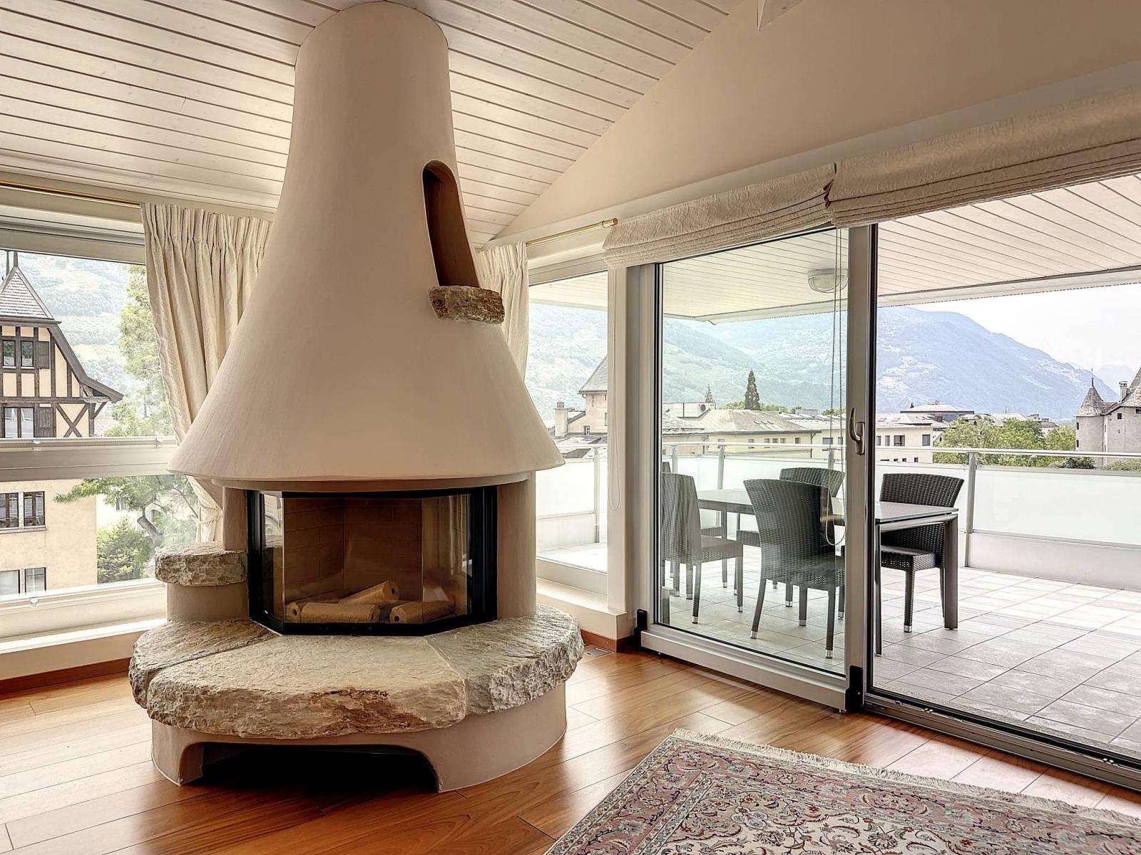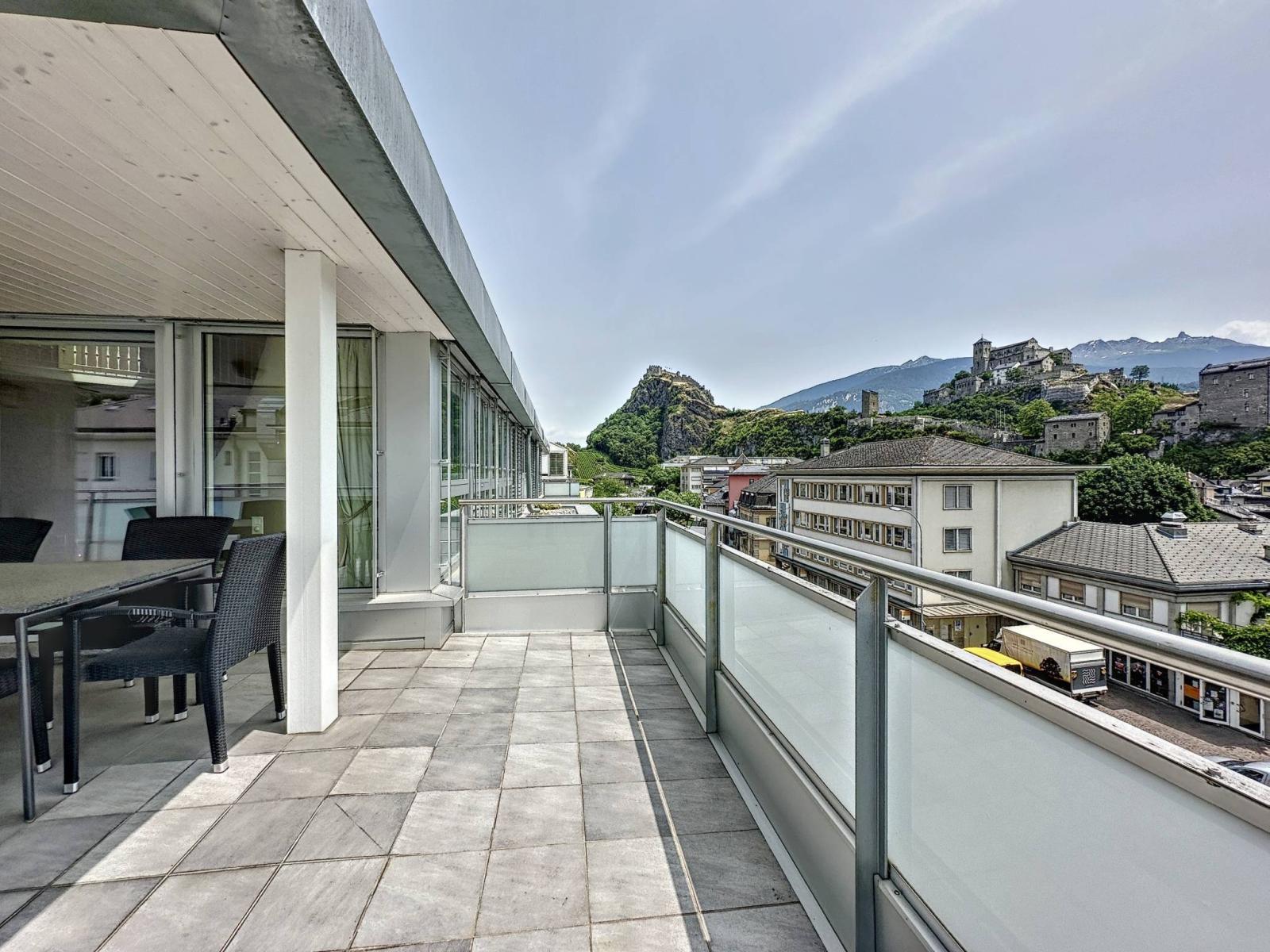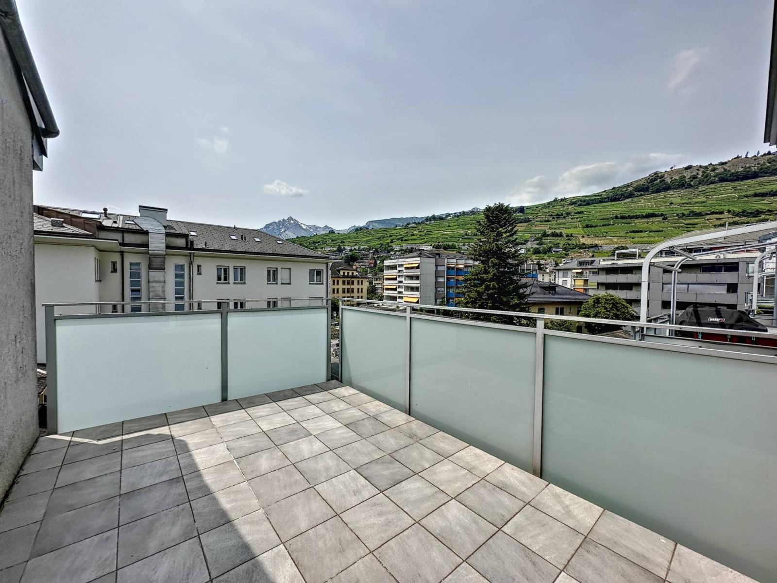 Son atout majeur est ses 3 balcons-terrasses d’un total de 56 m2 orientés Sud et Ouest ensoleillés toute l’année, parfaitement aménagés avec stores électriques et offrant une vue panoramique et dominante sur les châteaux de Valère et Tourbillon et sur les Alpes.