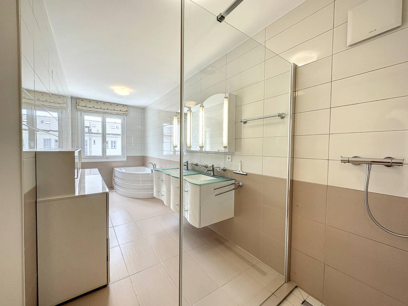 L’étage principal se compose entre autres d’une vaste pièce à vivre magnifiquement parquetée, avec la note cosy d’une jolie cheminée et une bibliothèque, une cuisine haut de gamme entièrement équipée, une magnifique suite parentale avec dressing et salle de bains privatifs, une seconde chambre et salle de douche, et 2 balcons de 30.7 et 10 m2.