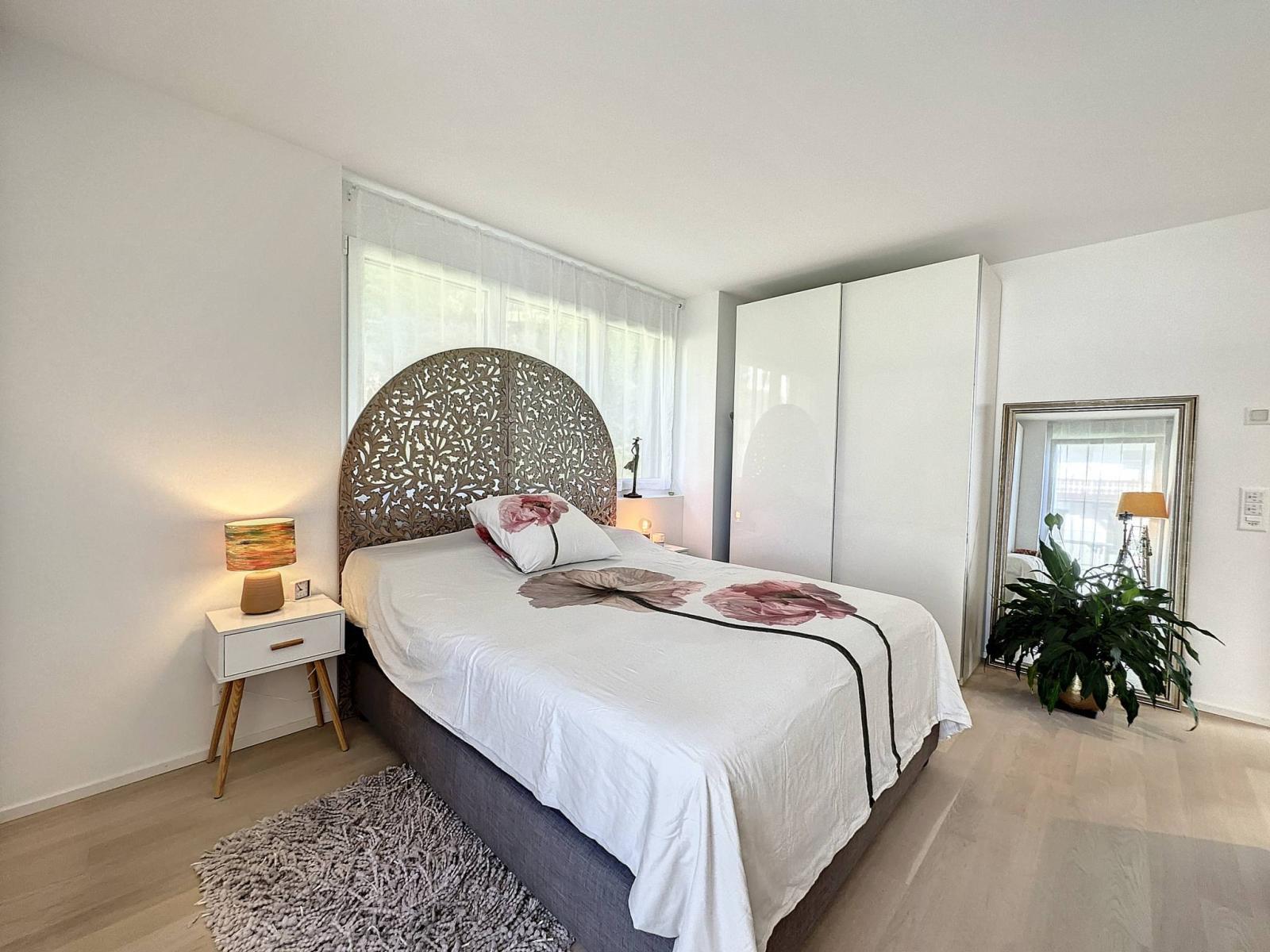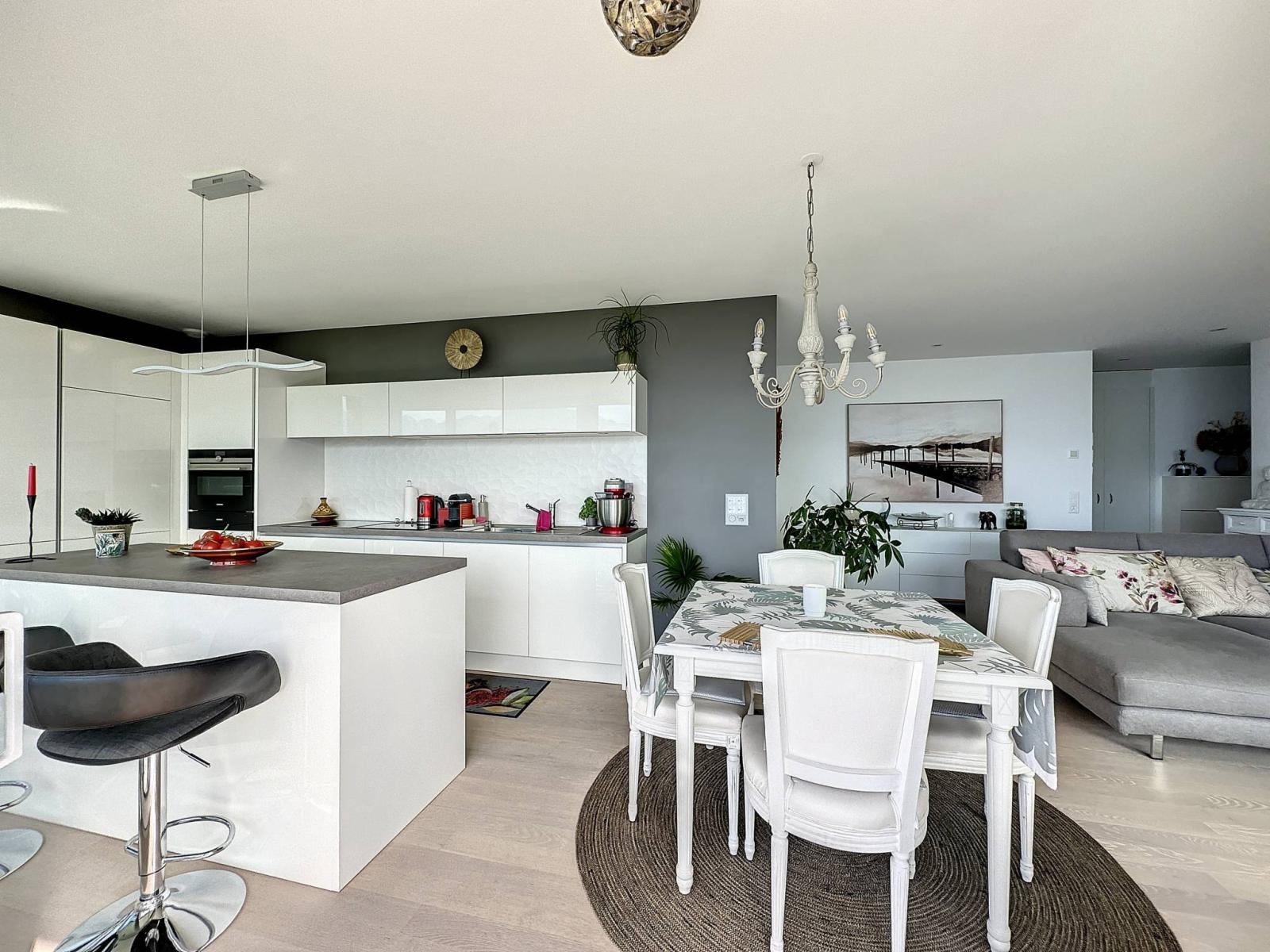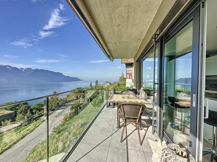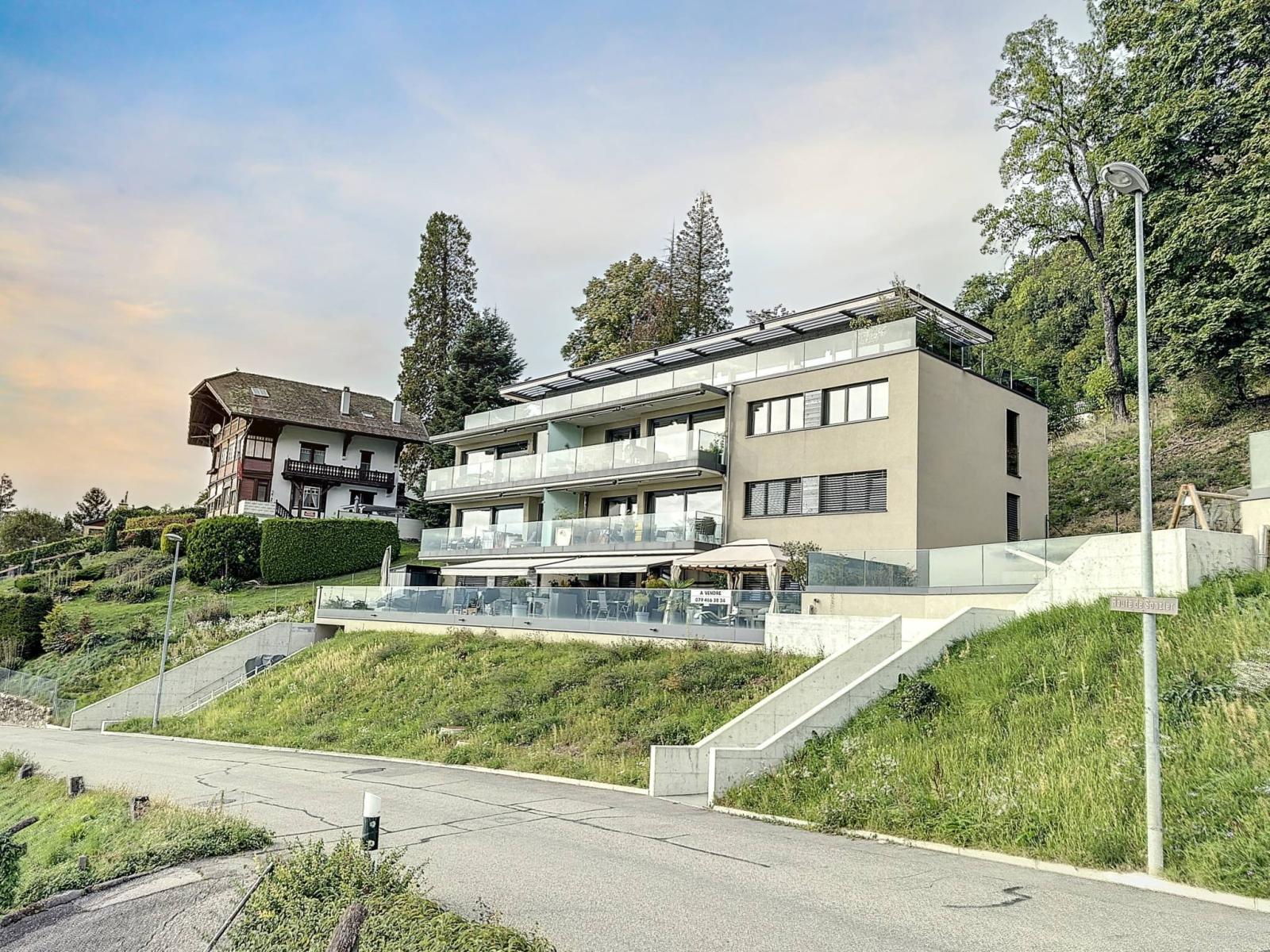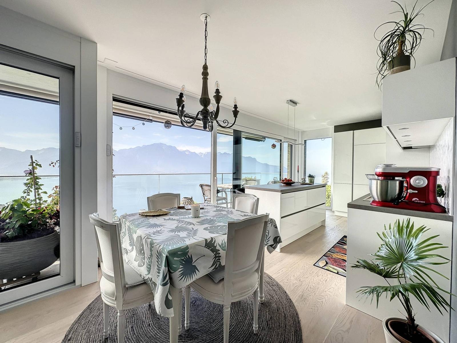 De par son orientation, il jouit d'une vue exceptionnelle sur le lac Léman et les montagnes ainsi que d'un ensoleillement optimal tout au long de la journée, grâce à ses grandes baies vitrées.