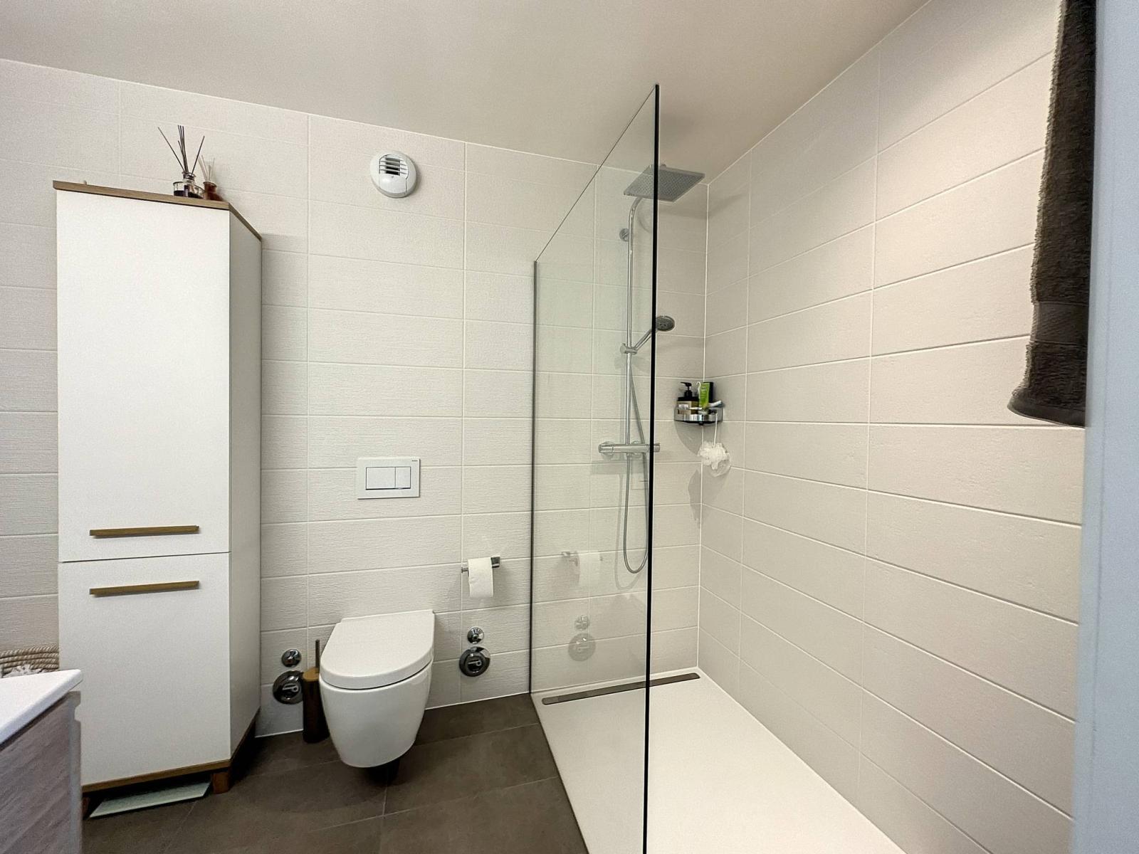 - Un hall d'entrée avec armoires murales ;- Un WC visiteurs ;- Une cuisine ouverte avec îlot central ;- Un séjour avec accès au balcon ;- Deux chambres à coucher dont une avec salle de douche/WC attenante et coin buanderie.