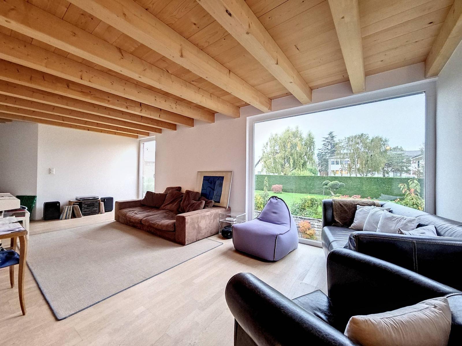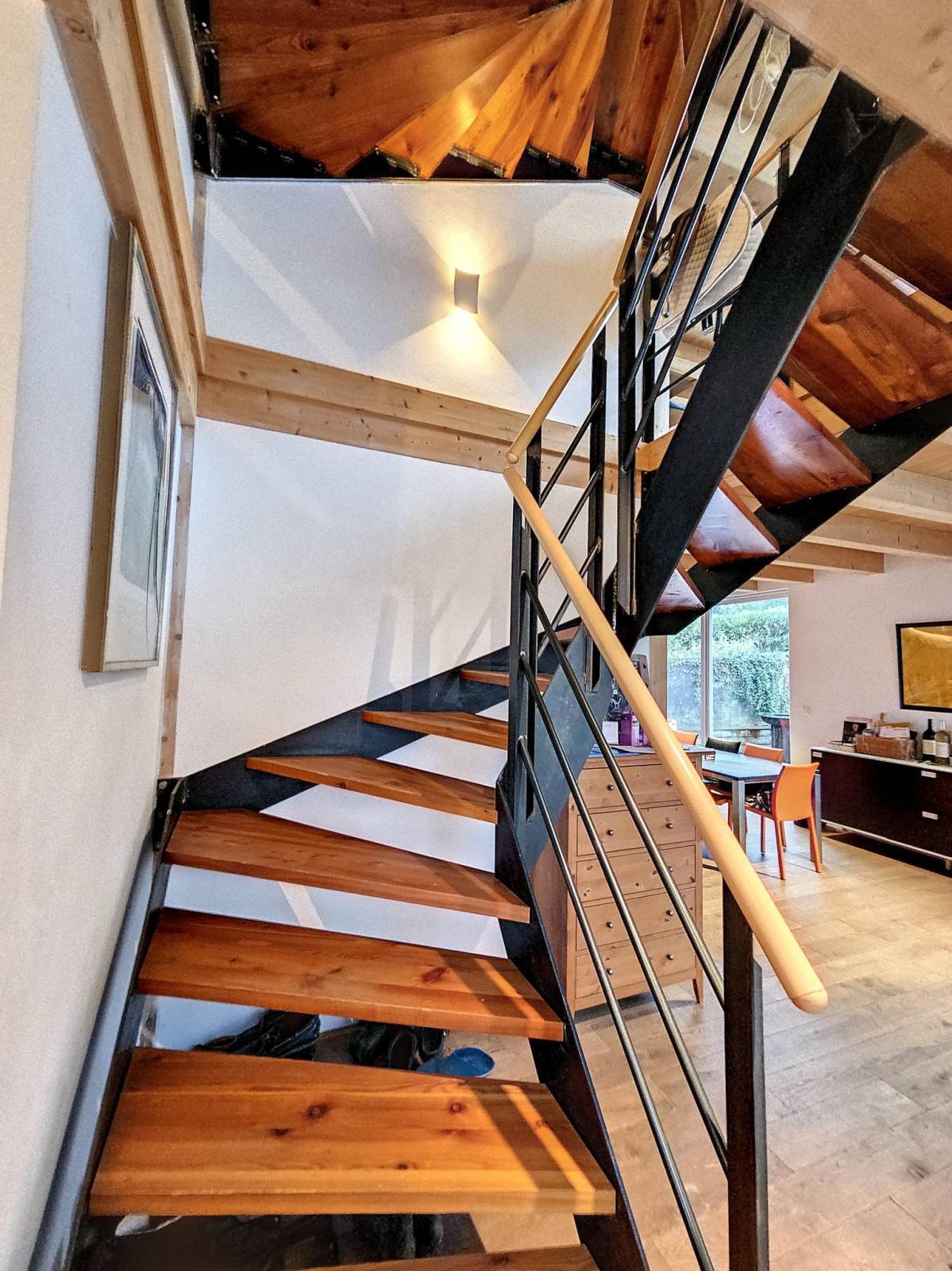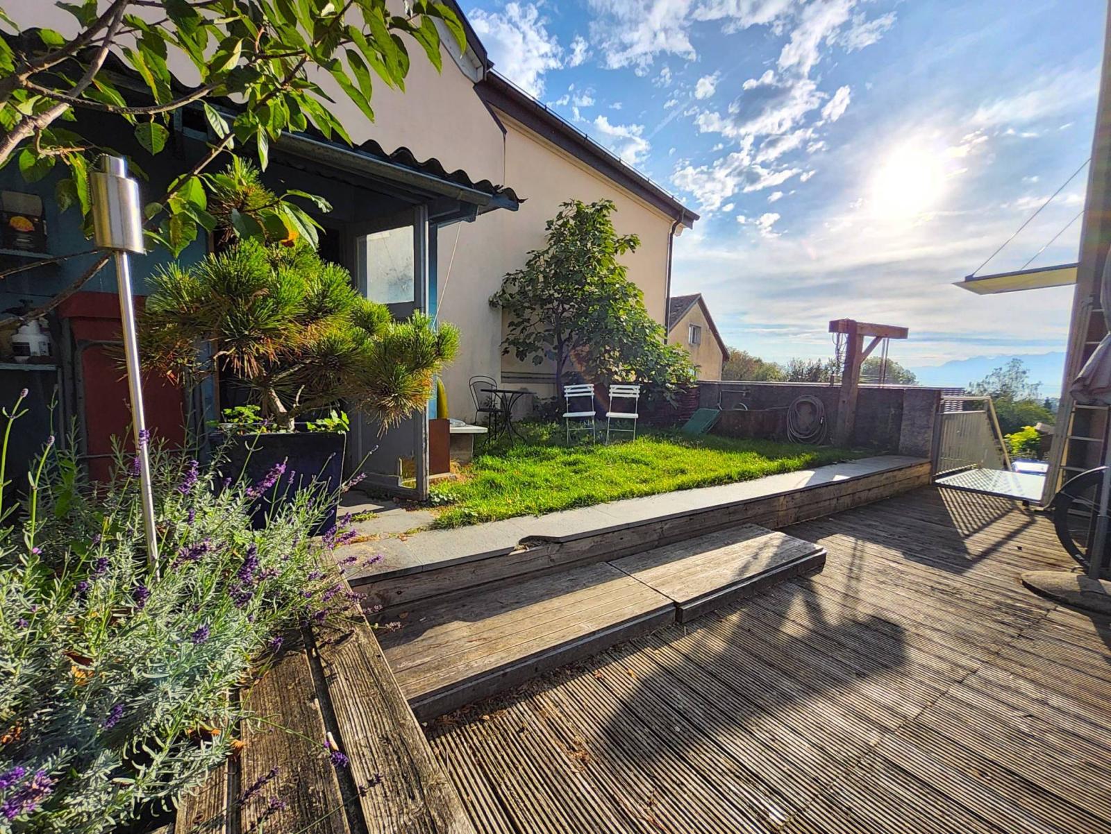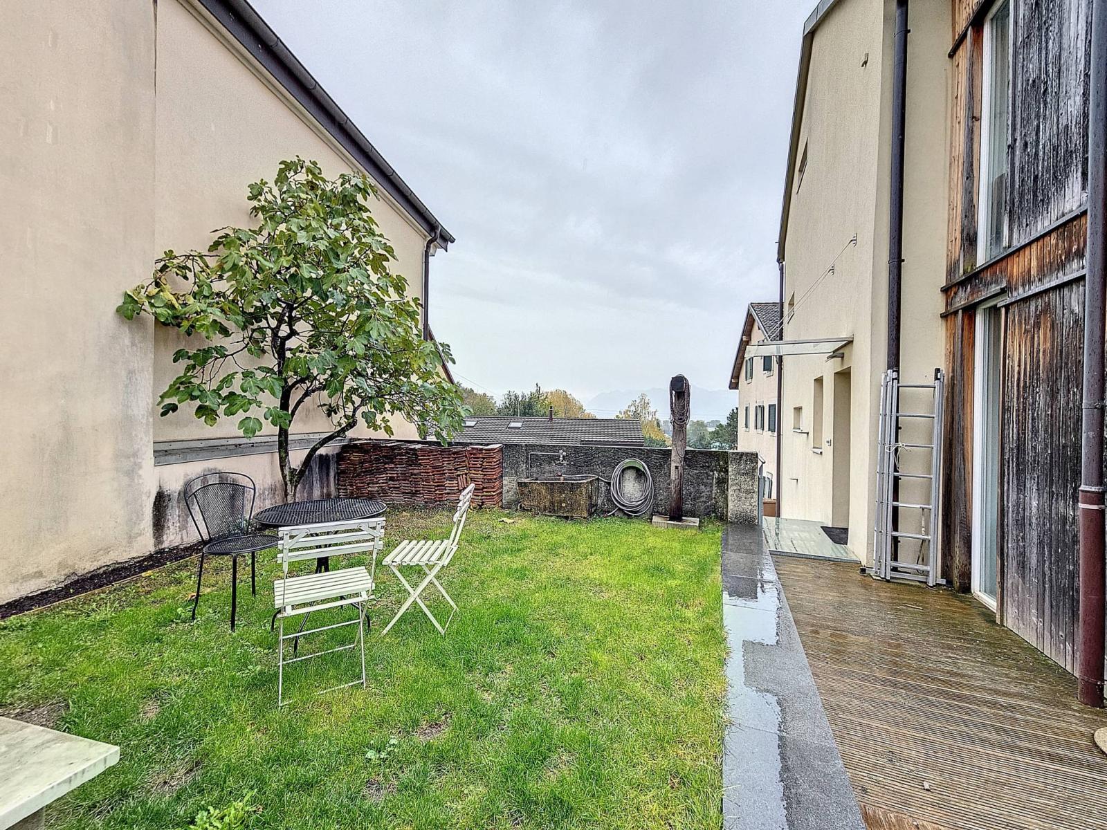 Cette maison de village de 7.5 pièces (6.5 pièces + 1 pièce studio/loft), d'environ 240 m² habitables au total, rénovée intégralement en 2009 est mitoyenne (partiellement) sur un seul côté , ce qui lui permet des ouvertures sur 3 côtés. Elle profite d'une jolie échappée sur le lac depuis le jardin et de l'intérieur via certaines fenêtres. La typologie en triplex, mais avec de grands espaces ouverts sur les 3 premiers niveaux (4 au total en comptant le loft au rez de jardin).