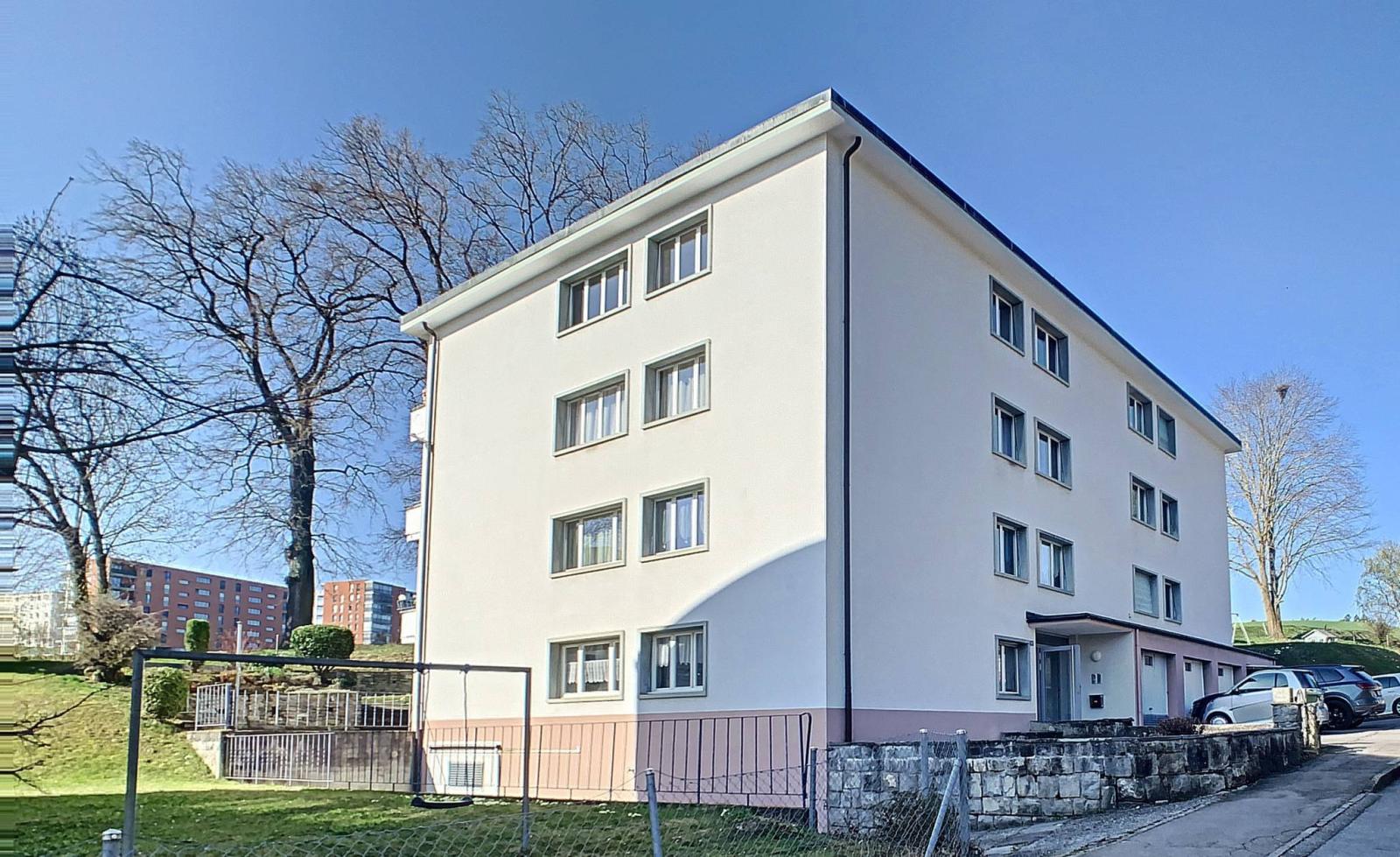 Construit en 1963, ce charmant appartement de 4.5 pièces modifié en 3.5 pièces, orienté Sud, totalise 84 m² habitables complétés par une terrasse de 20 m², portant ainsi la surface pondérée à 91 m2. Il se trouve dans un immeuble en PPE de 10 logements en bordure d'un terrain agricole.