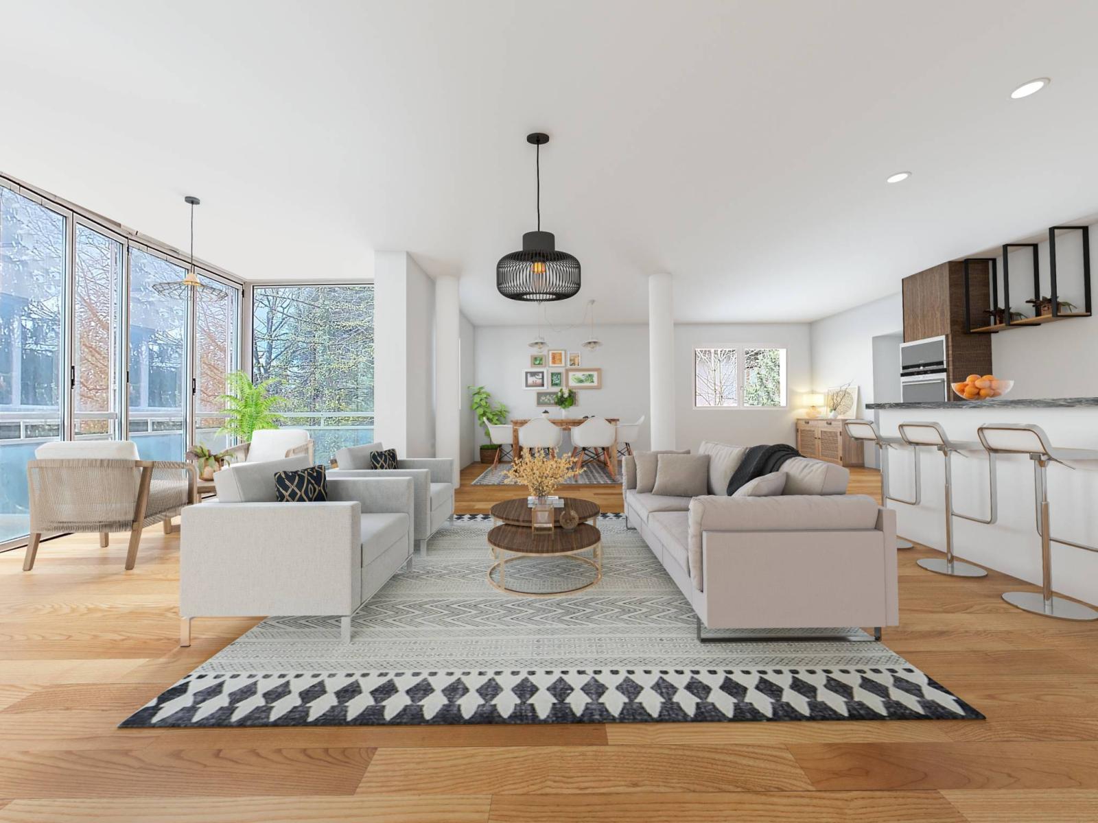 Partie jour : Une cuisine totalement équipée ouverte sur le vaste séjour et la salle à manger