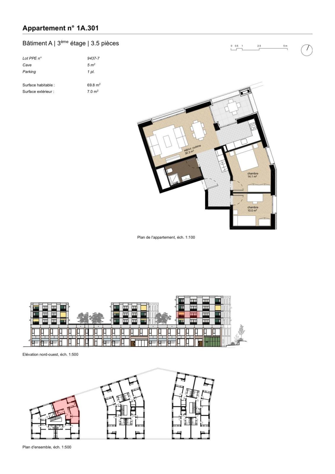 15 appartements de 3.5 pièces entre 71 et 86 m² avec loggia105 places de stationnement, dont 38 places visiteurs