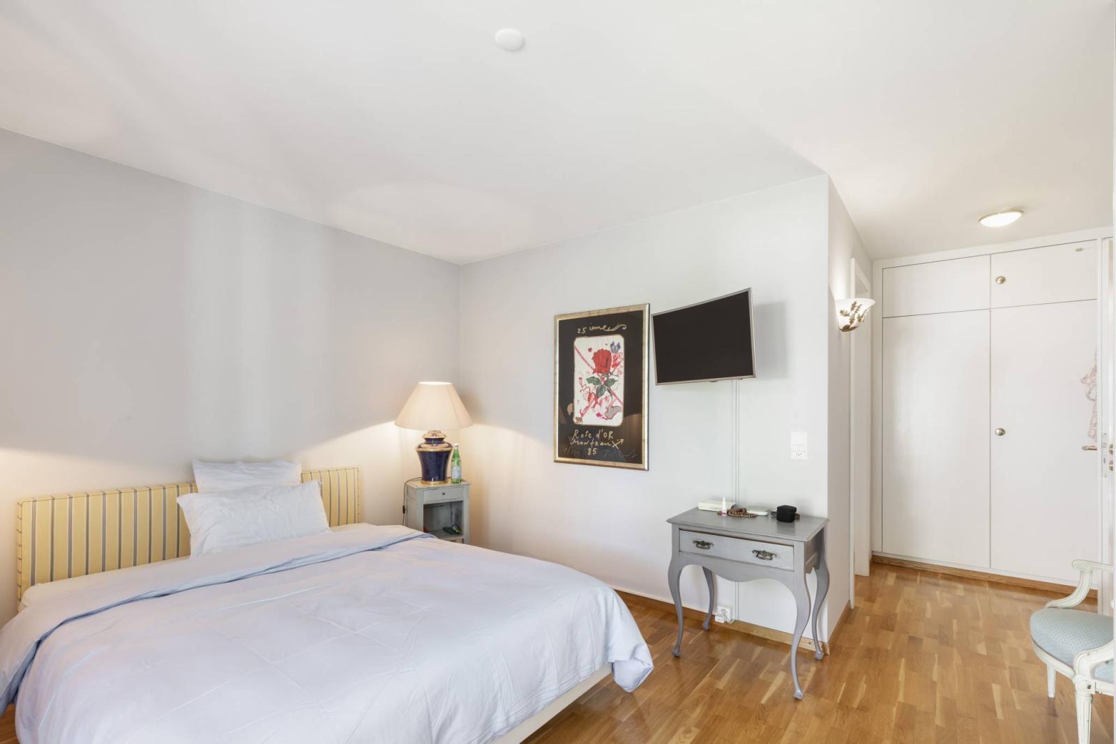 L'une des chambres à coucher a l'avantage d'avoir un accès direct par une porte palière à la cage d'escalier, ce qui a permis au propriétaire actuel d'y aménager un studio entièrement équipé (idéal pour un adolescent ou une fille au pair).