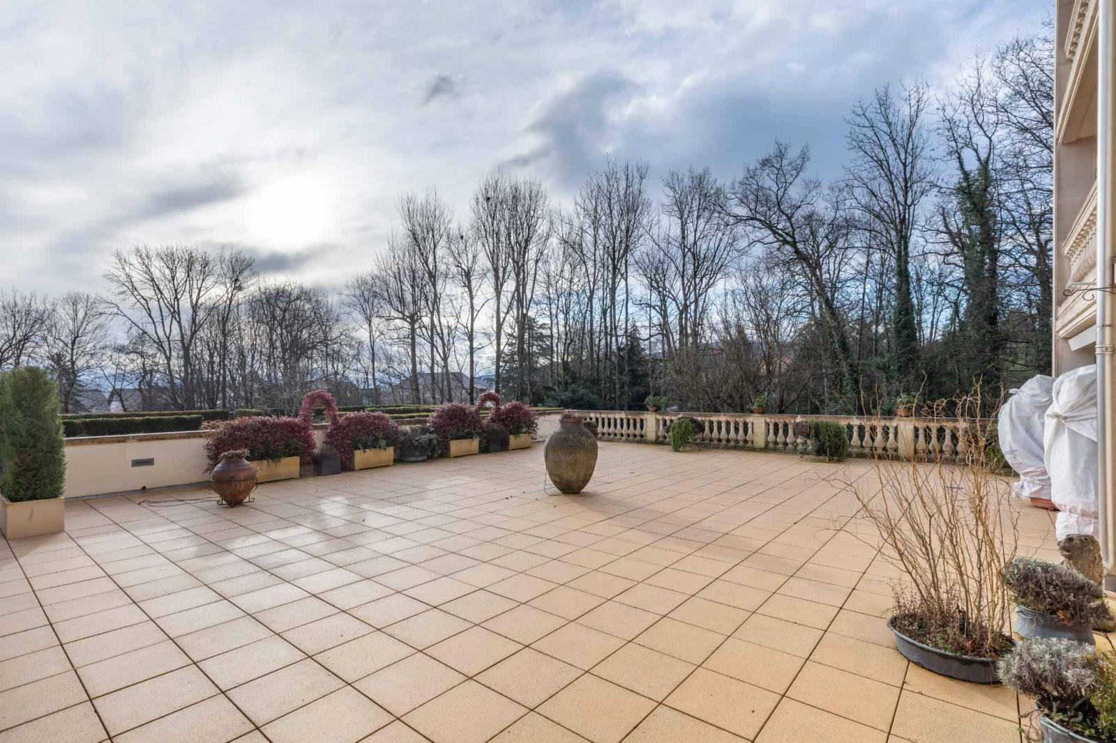 Le bien, récemment rénové avec de très beaux matériaux, offre une surface PPE d'environ 250 m², complétée par une grande terrasse de près de 252 m² et un magnifique jardin privatif.