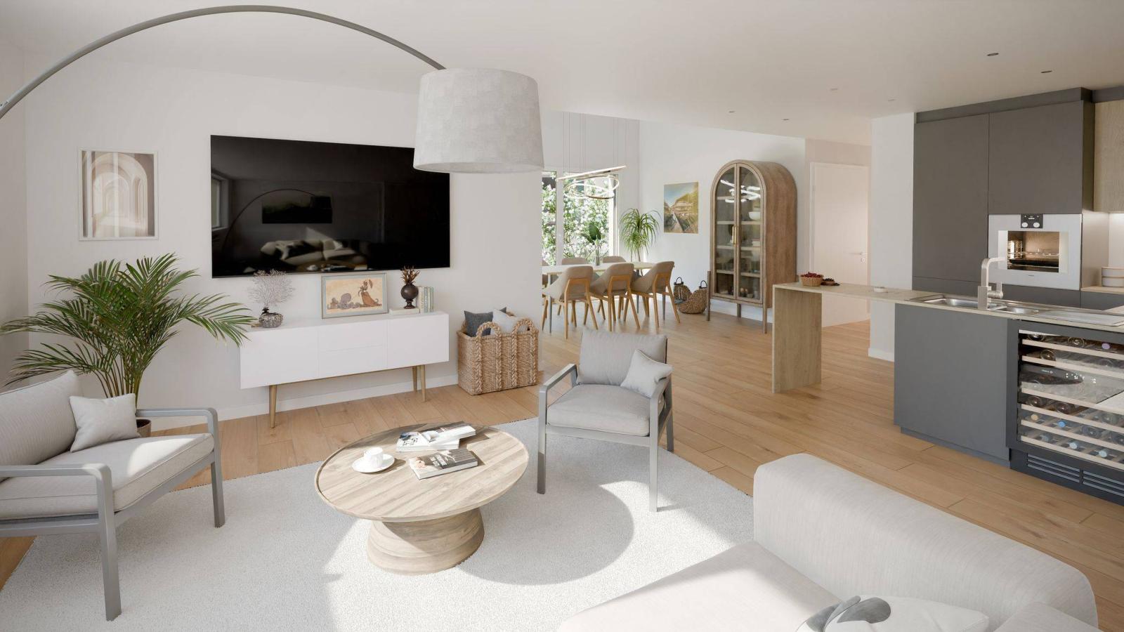 Le rez-de-chaussée de chaque villa est composé d'un hall d'entrée, d'un wc-visiteurs, d'une grande cuisine avec salle à manger et salon-séjour ainsi que d'une terrasse et d'un jardin.